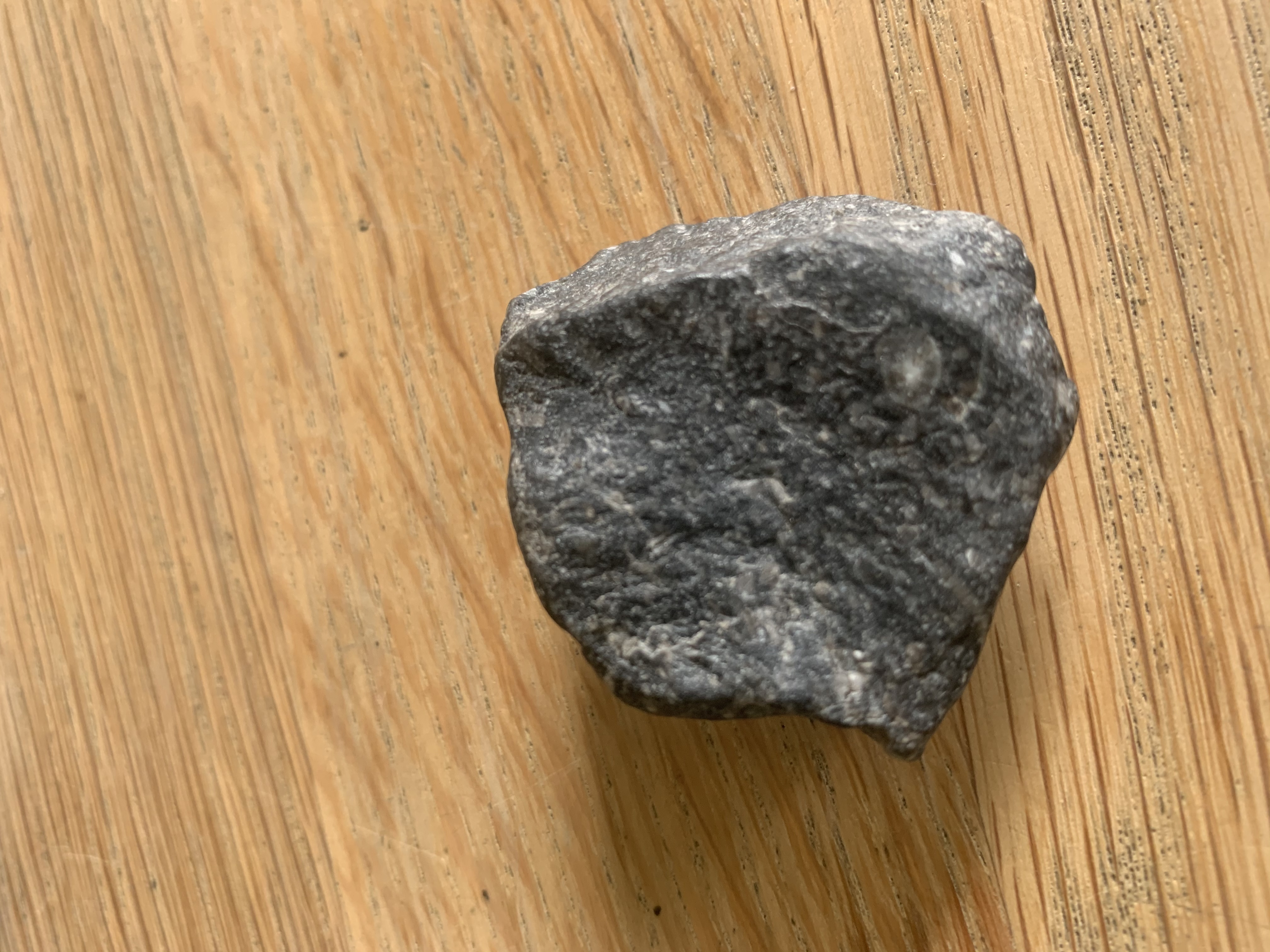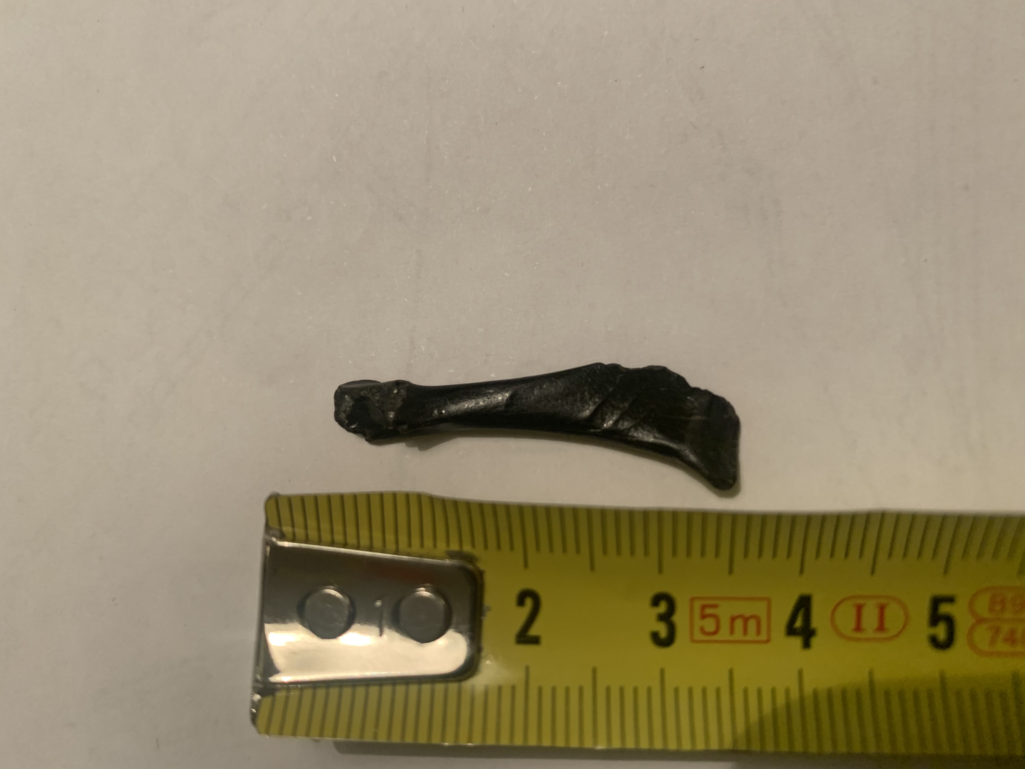 Check de meetlat ben ik vergeten. Ongeveer 3 bij 3cm één kant plat andere kant gebold. Klein keuteltje dan en beetje afwijkende vorm. Ik zal morgen op mijn werk even onder de microscoop kijken en foto met beter licht maken.