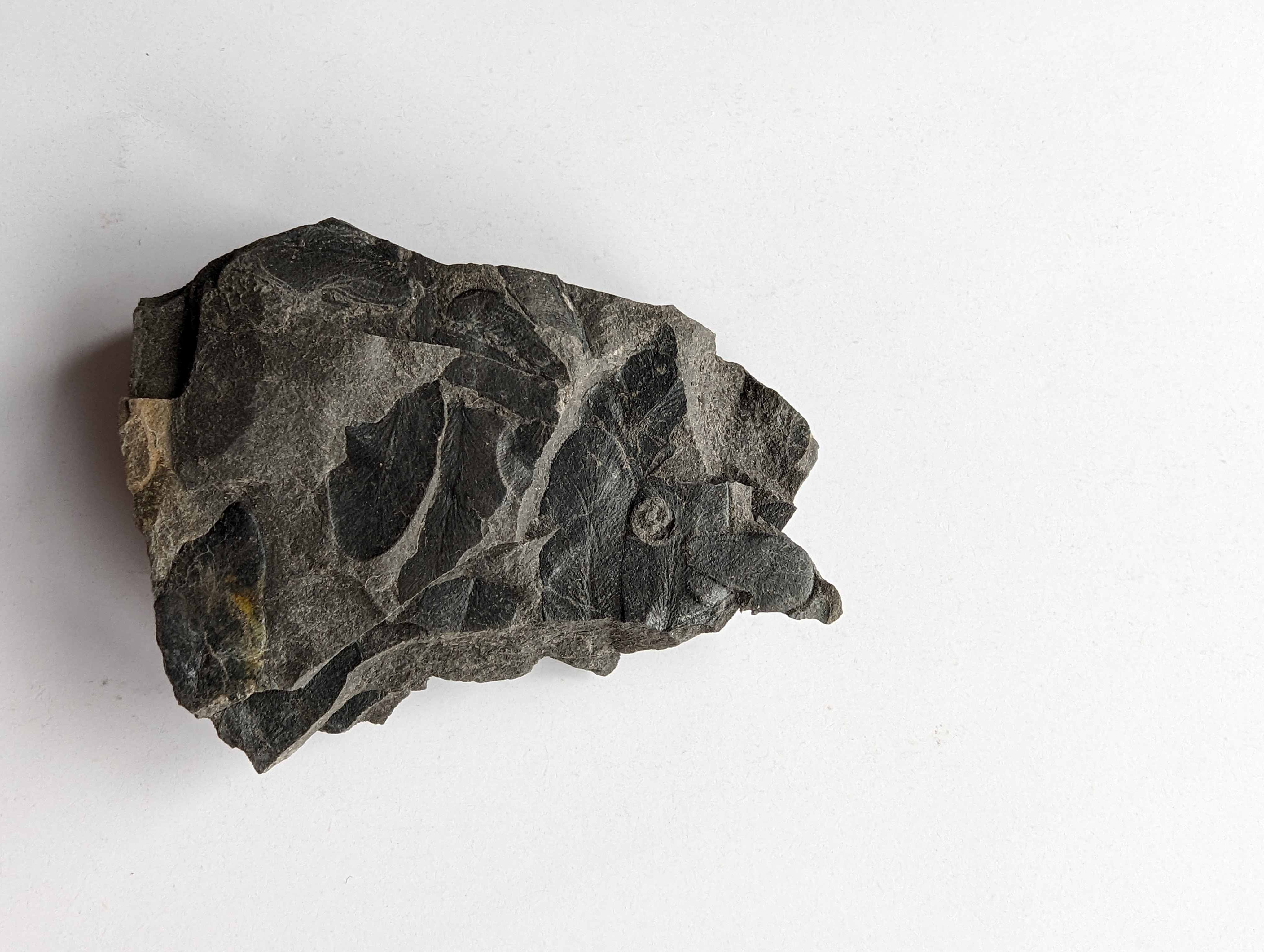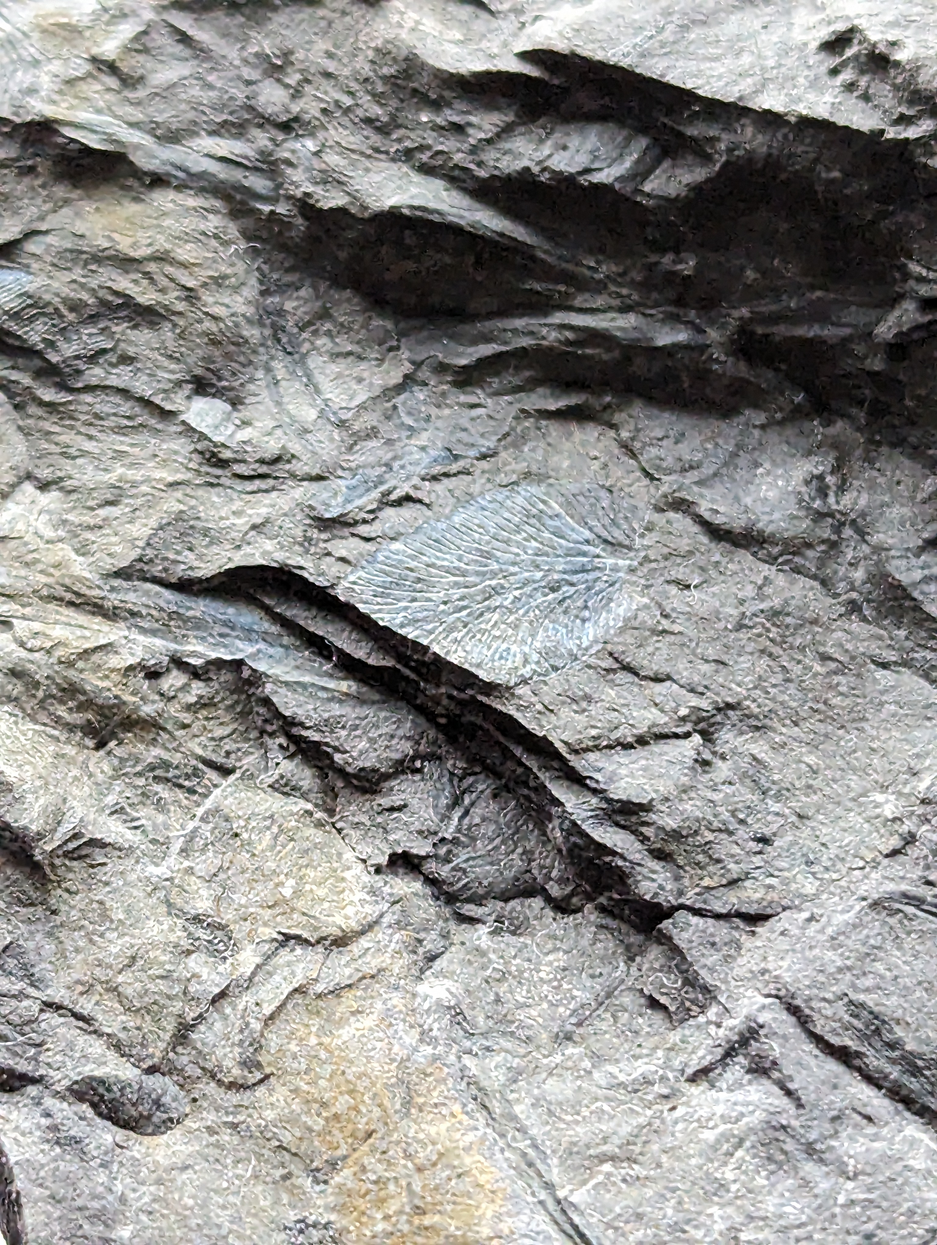 Het is op de foto misschien niet helemaal duidelijk zichtbaar, maar dit blaadje is ook lichtblauw. Waarschijnlijk vergelijkbare bewaring zoals jouw fossiel.