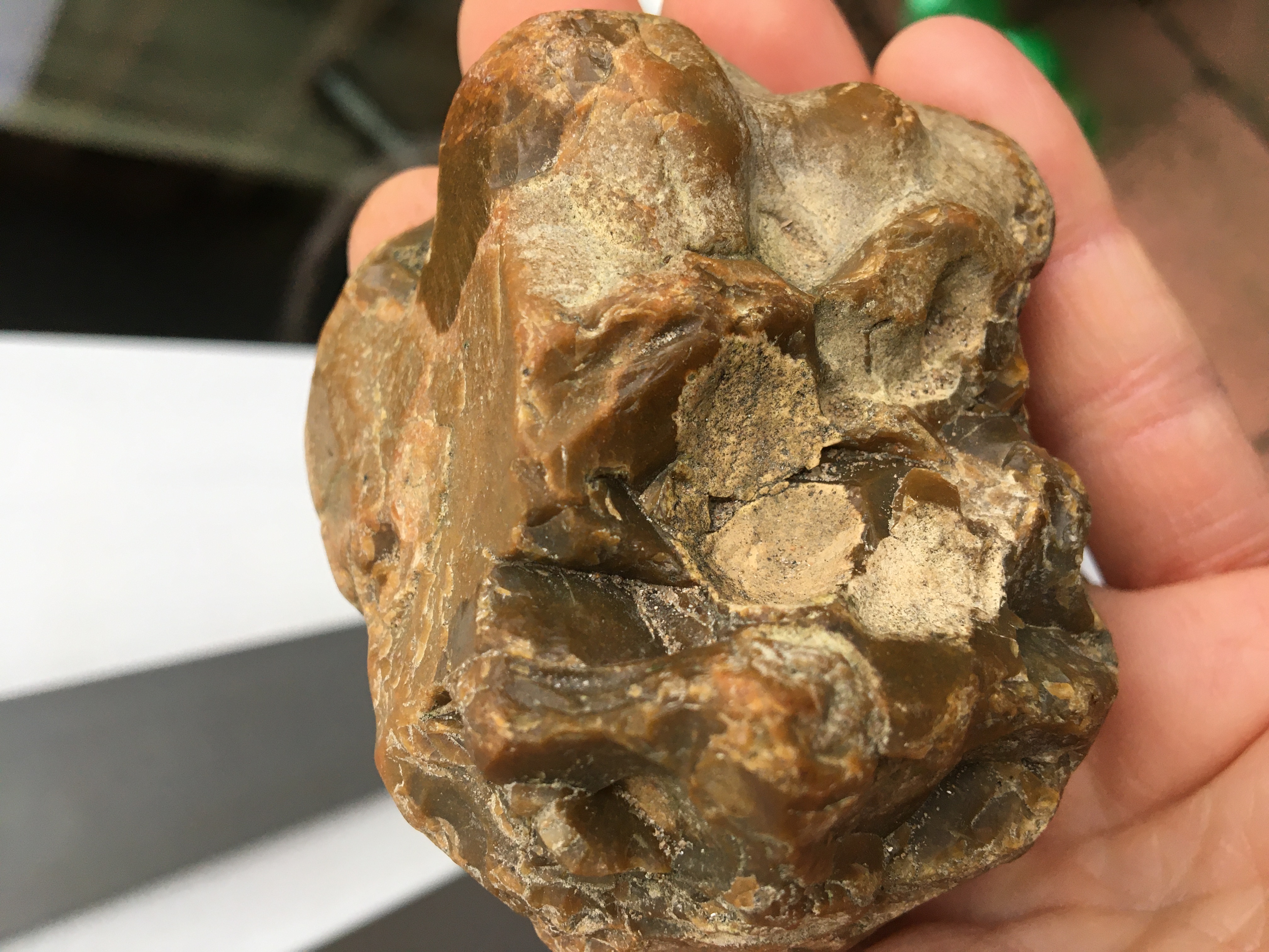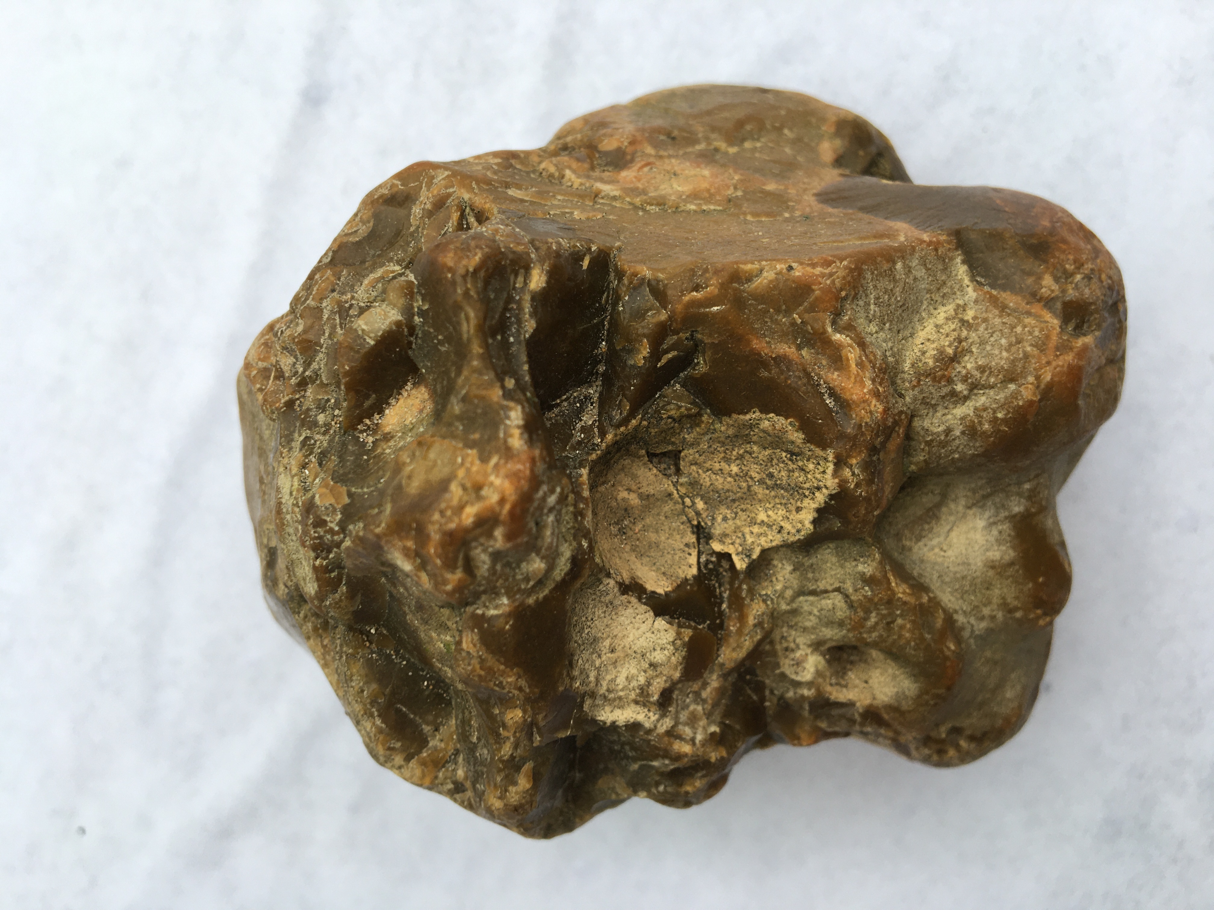 Beste leden, afgelopen weekend viel mn oog op deze fraaie bruine steen/klomp/knol. Wat zou dit zijn? In eetste instantie dacht ik aan vuursteen, maar omdat ik vuursteen nog niet in deze vorm heb gezien twijfel ik. Ik vind hem iig wel heel fraai.