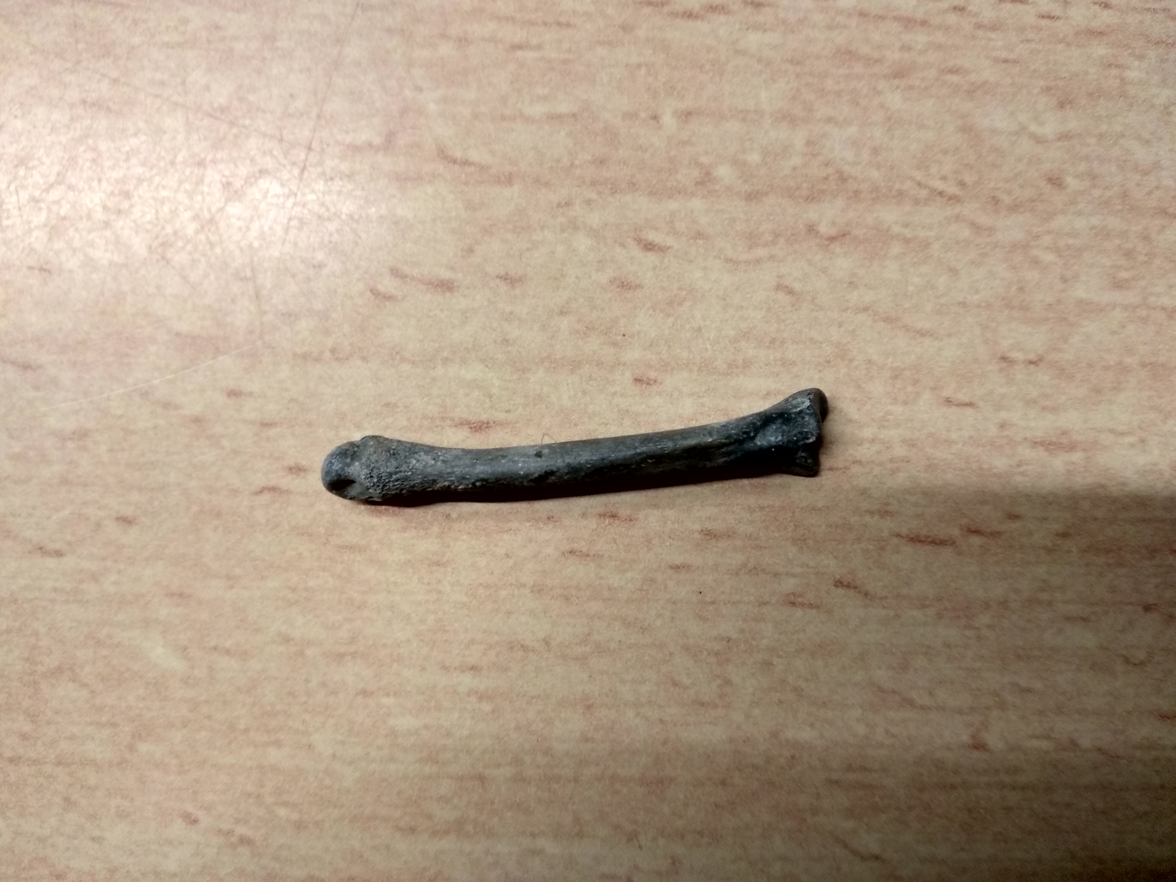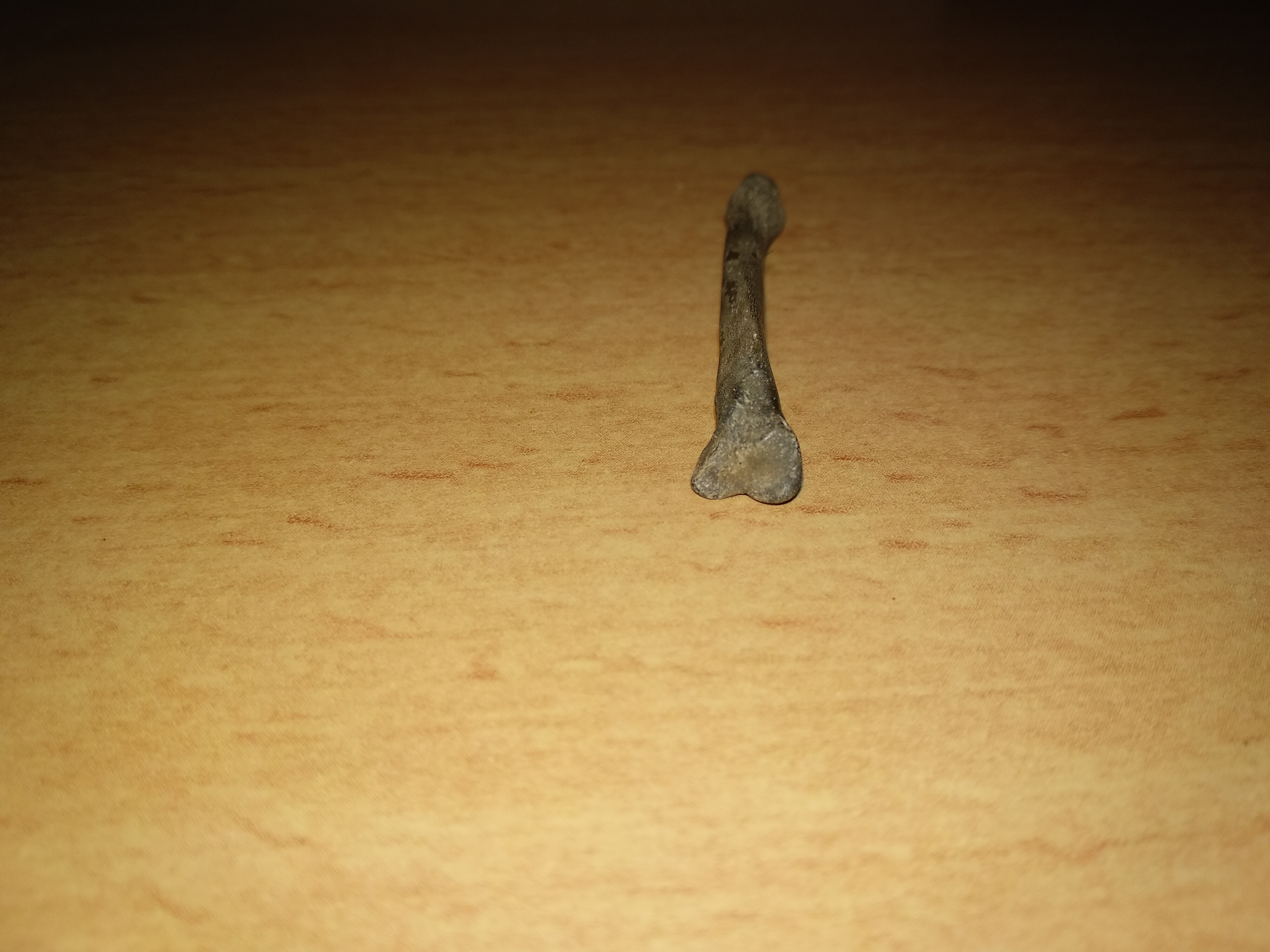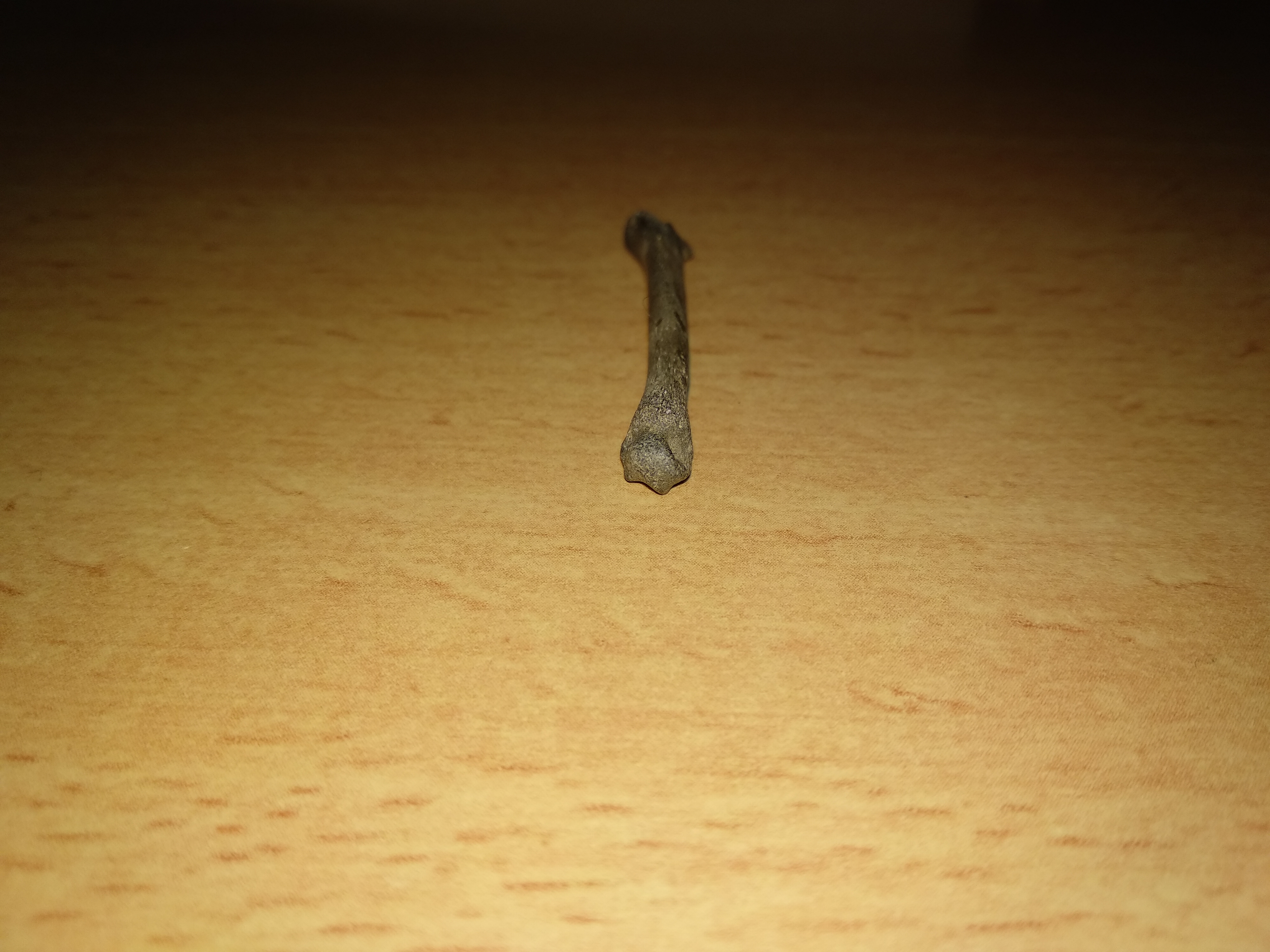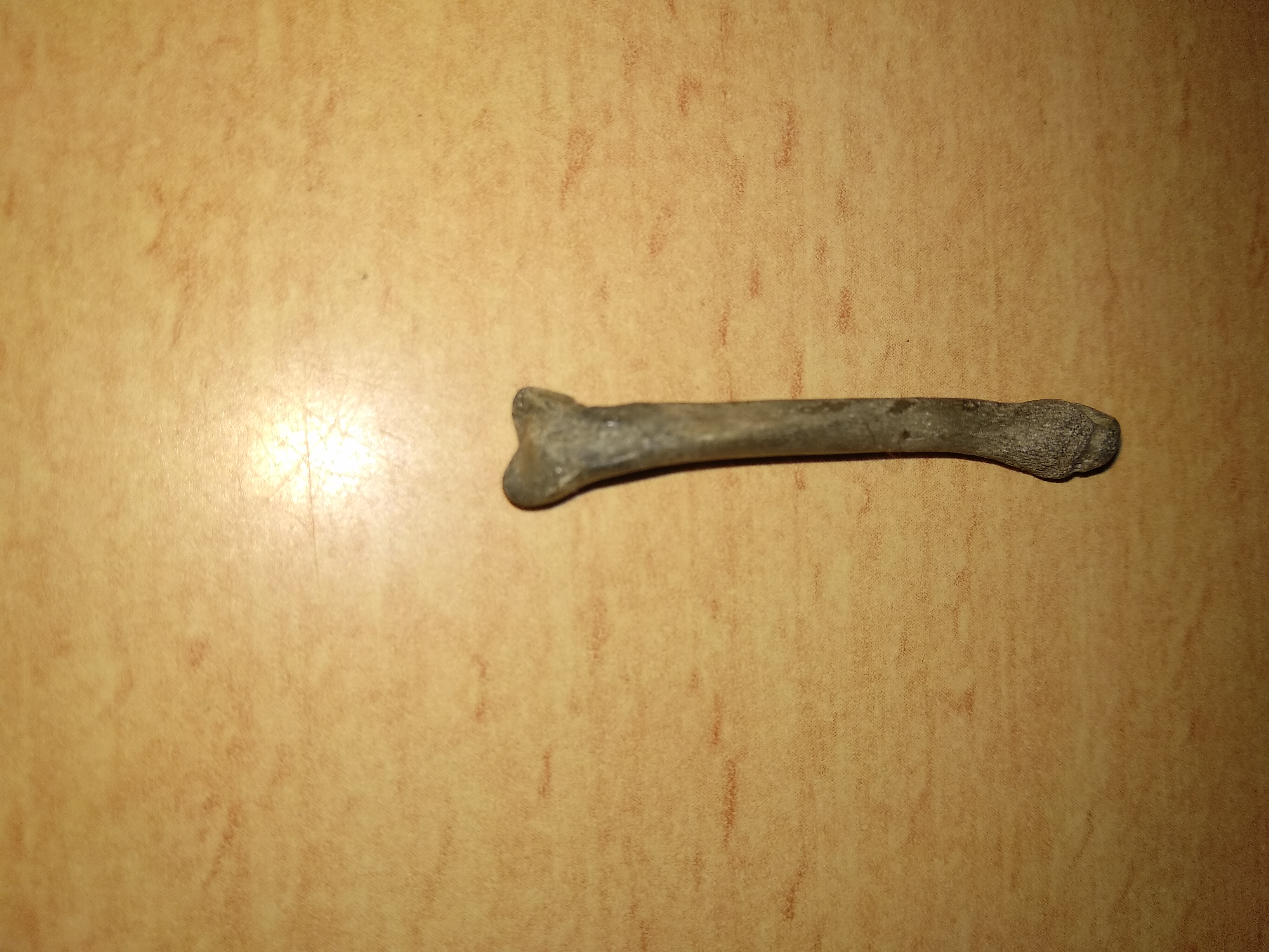 4 cm lang, veel kenmerken van een metatarsus 5. Ik kan het niet direct vinden. Dat betekend niet dat het zeldzaam is, maar eerder door een gebrek aan voldoende vergelijking materiaal. Het heeft overeenkomsten met otter, maar degene die ik heb gezien zijn iets meer dan 3 cm lang.