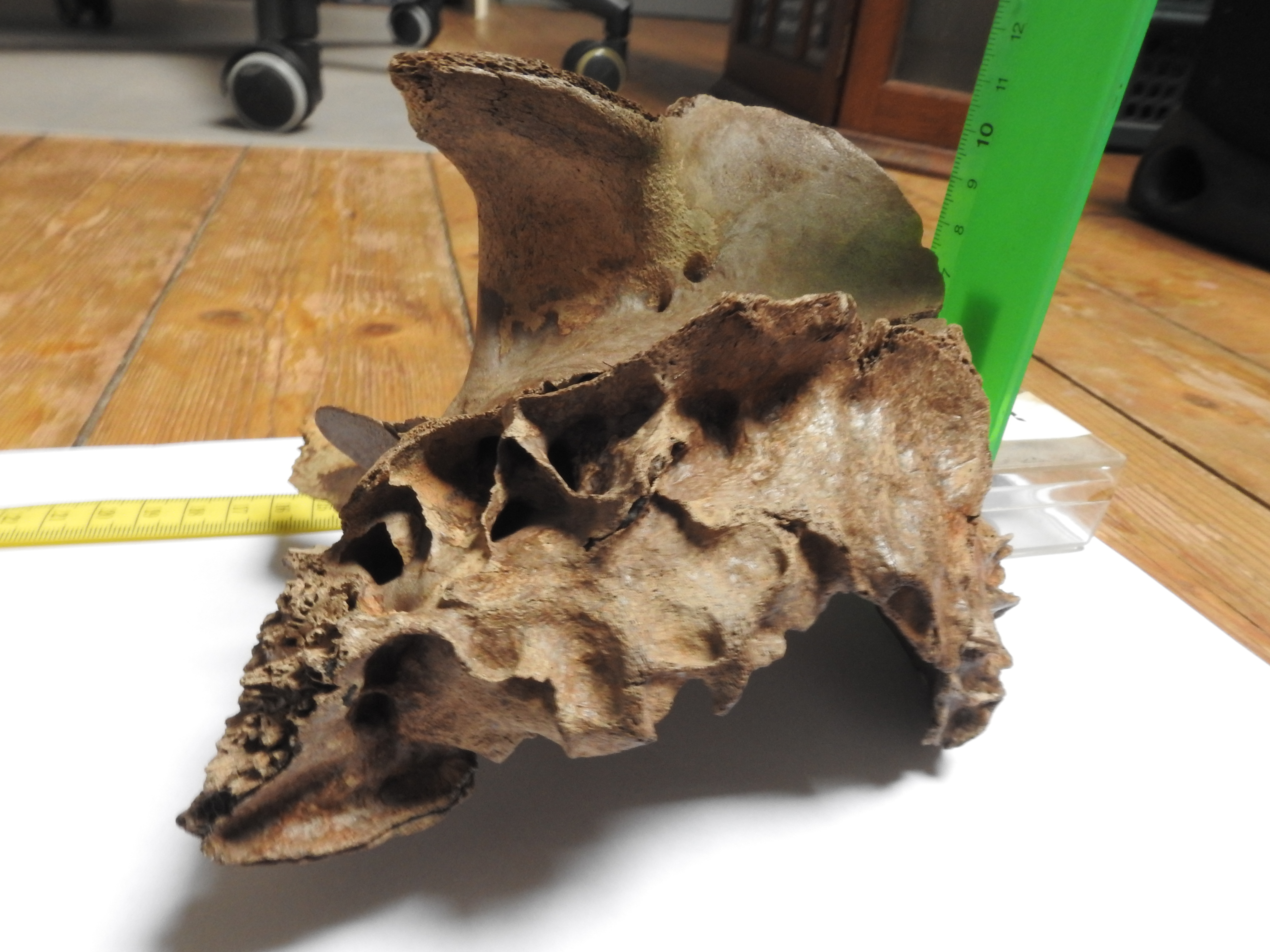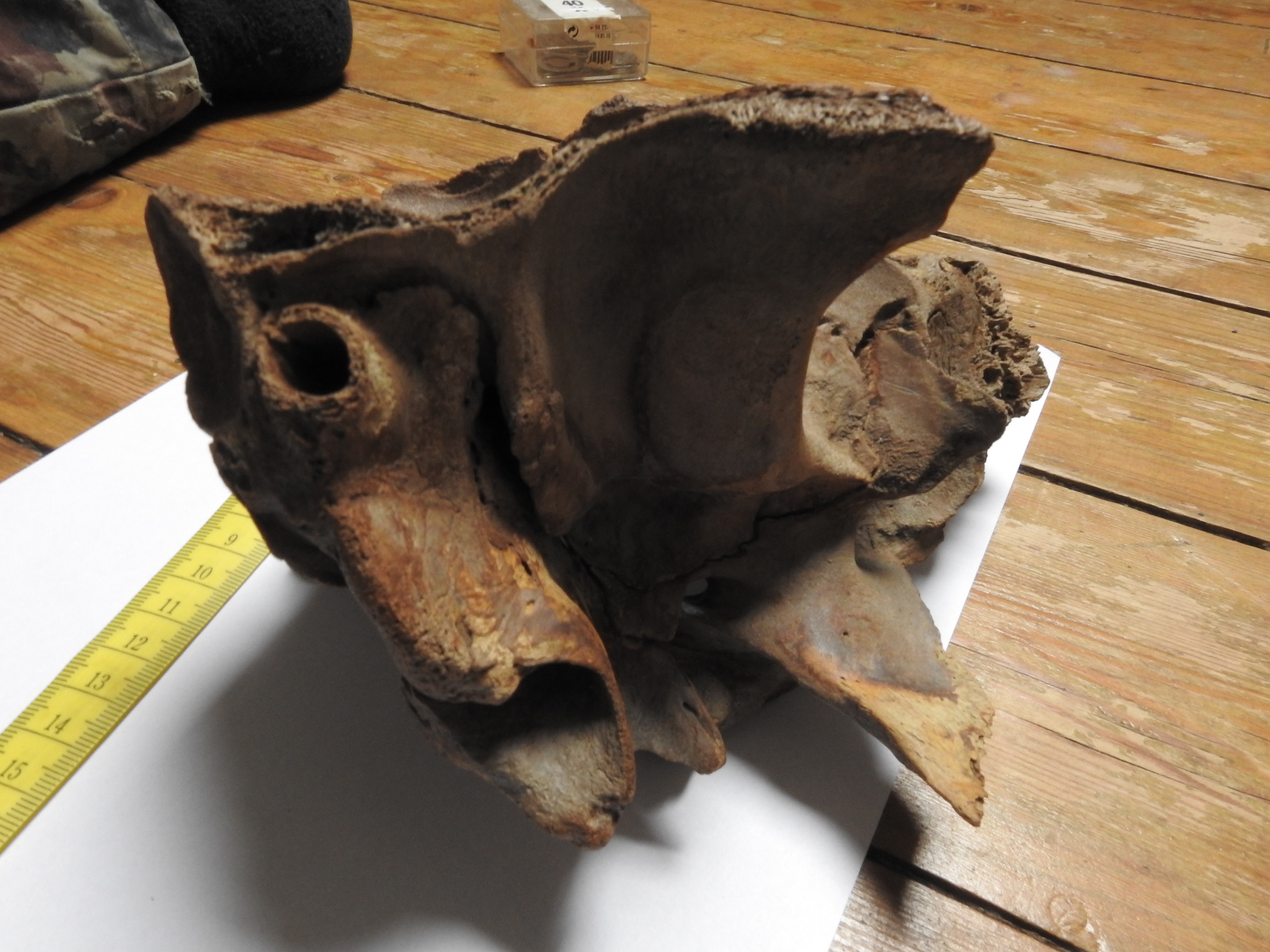 Nigersaurus? Dit is een runderschedel en of het fossiel is betwijfel ik. Dat het bruin is zegt niet alles. Plakt het als je het met natte vinger aanraakt?