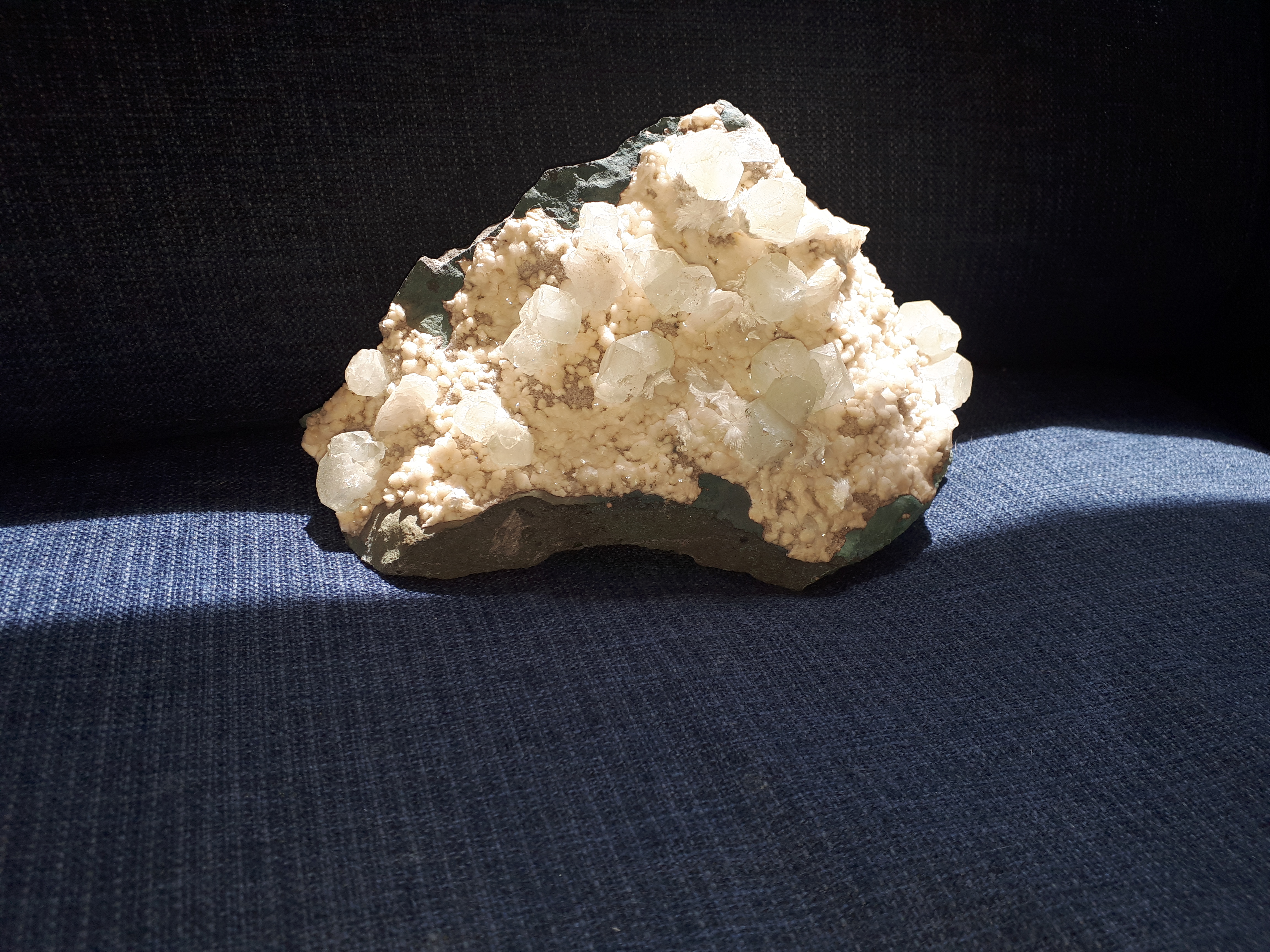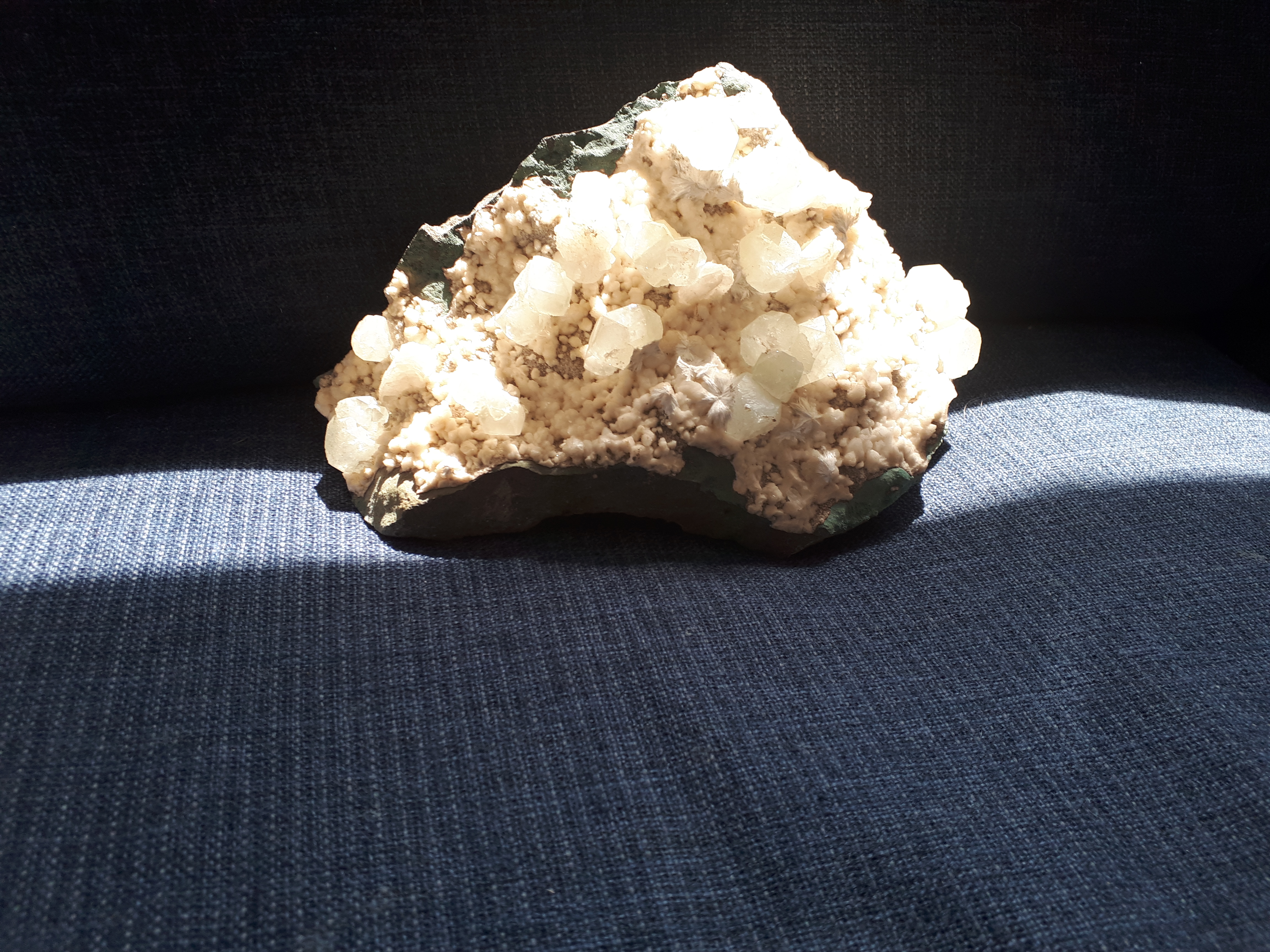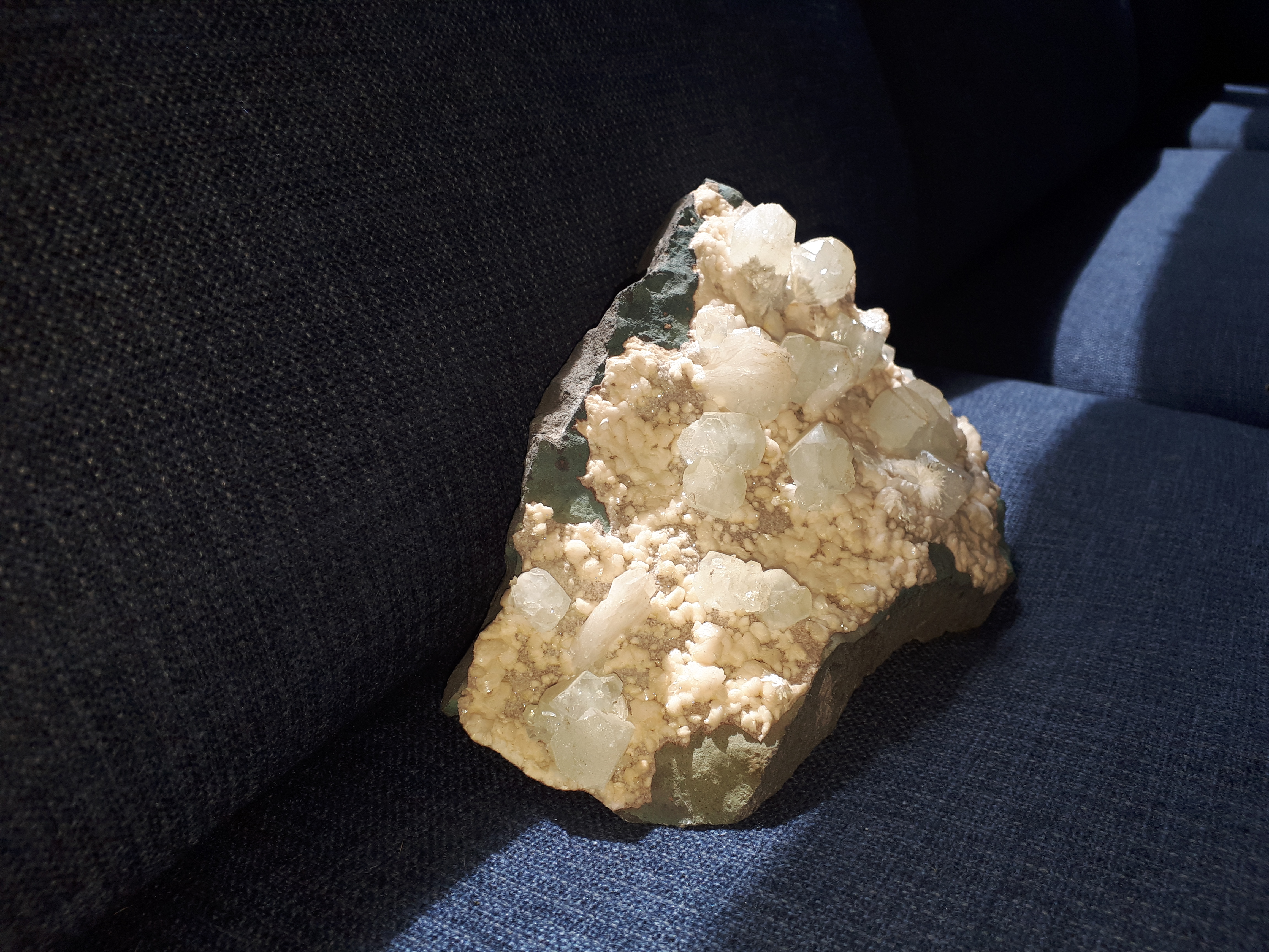 Ik heb niet veel verstand van mineralen, maar vermoed sterk dat de grotere kristallen calciet zijn.