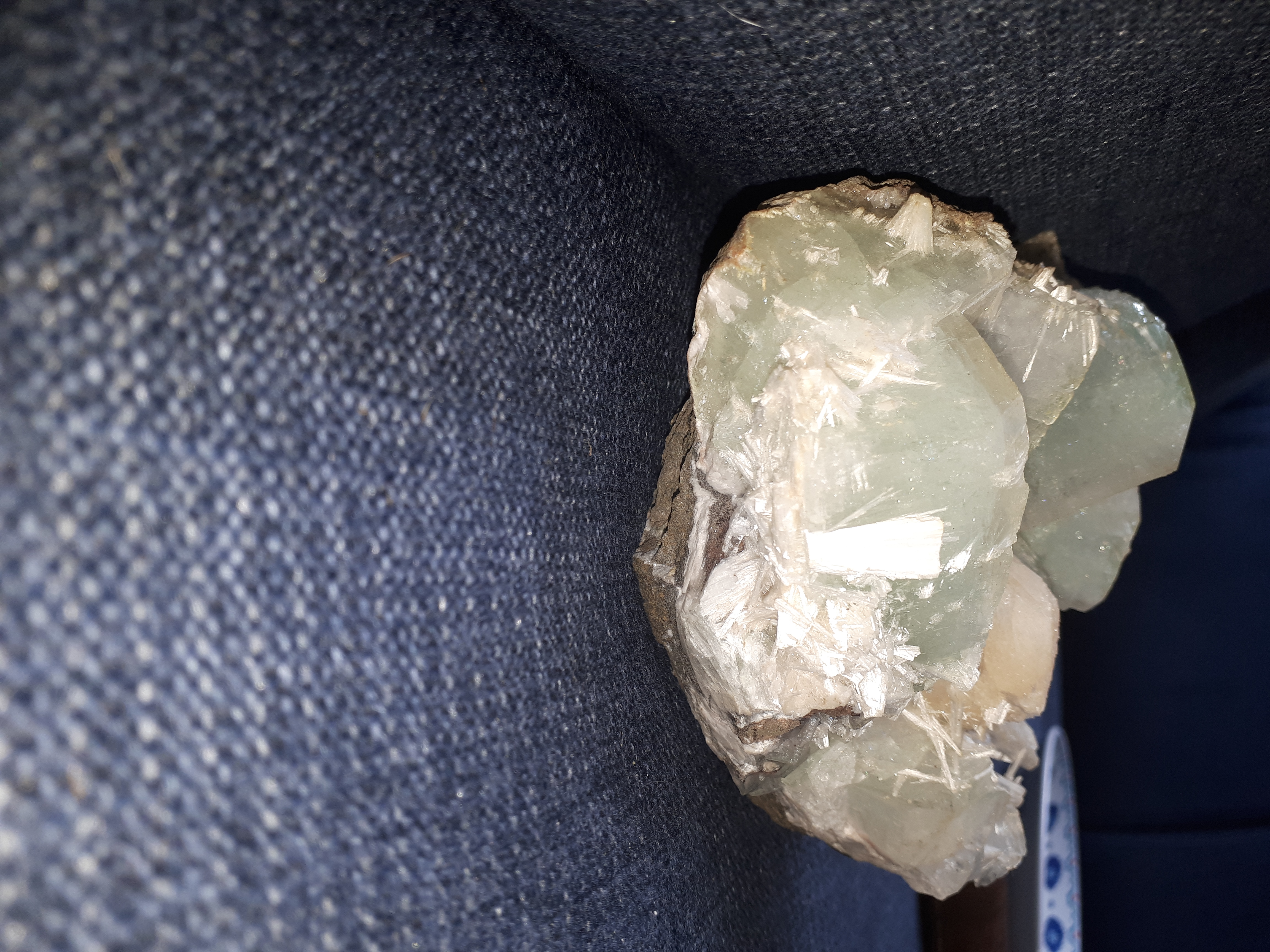 De wittere, vezelige bundels zouden wel eens strontianiet kunnen zijn. Dat komt vaker voor samen met calciet.