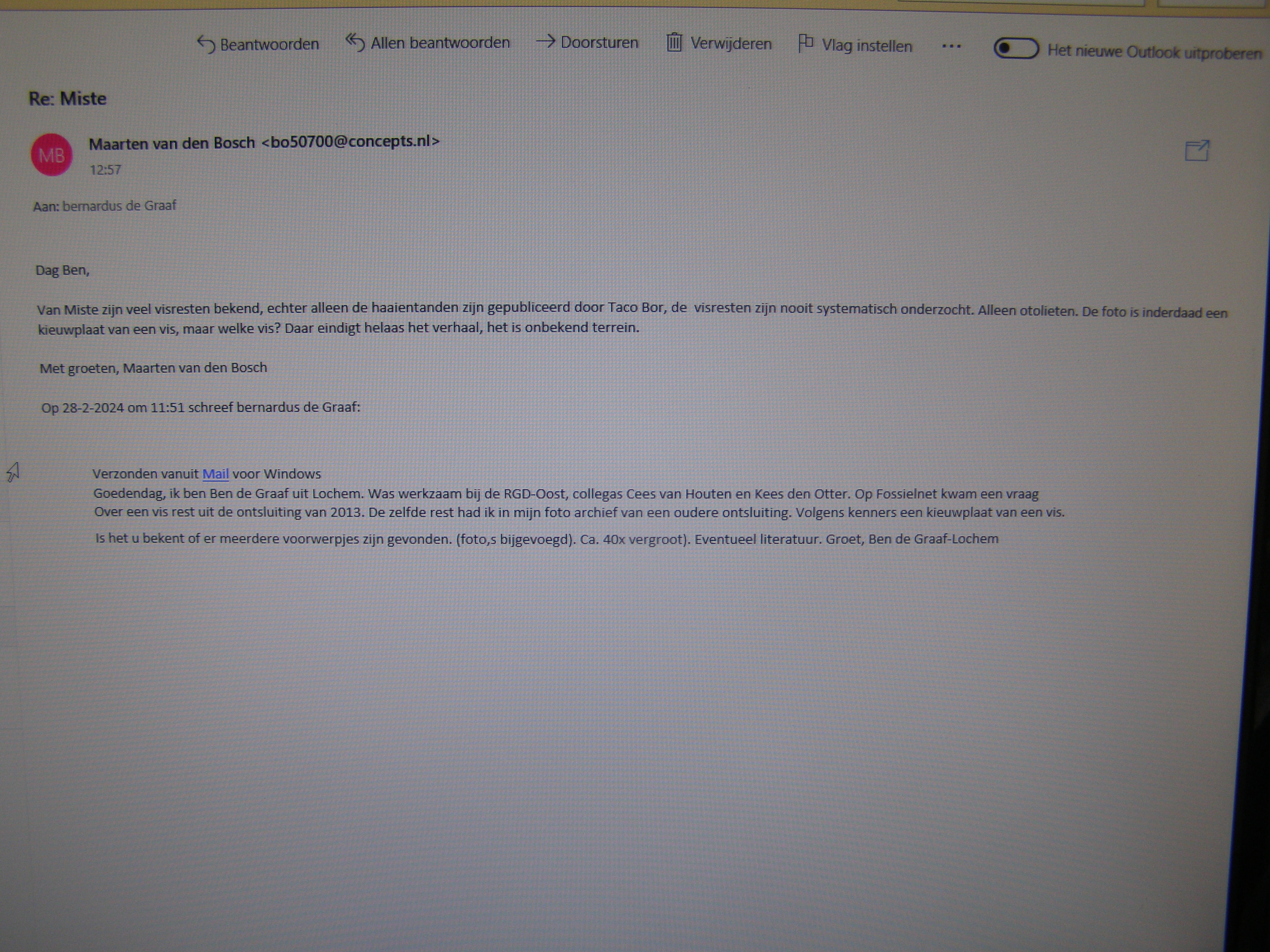 Ik heb een vraag gesteld aan Maarten van den Bosch de bekende geoloog uit Winterswijk. Hij wist mij te vertellen dat het wel degelijk om een kieuwplaat van een vis ging. Maar tevens dat er geen onderzoek naar visresten is geweest. Alleen haaien en vis otolieten. Dus hier eindigt mijn verhaal. Maar je weet maar nooit en komt iemand met een vissoort tot nu toe onbekend.