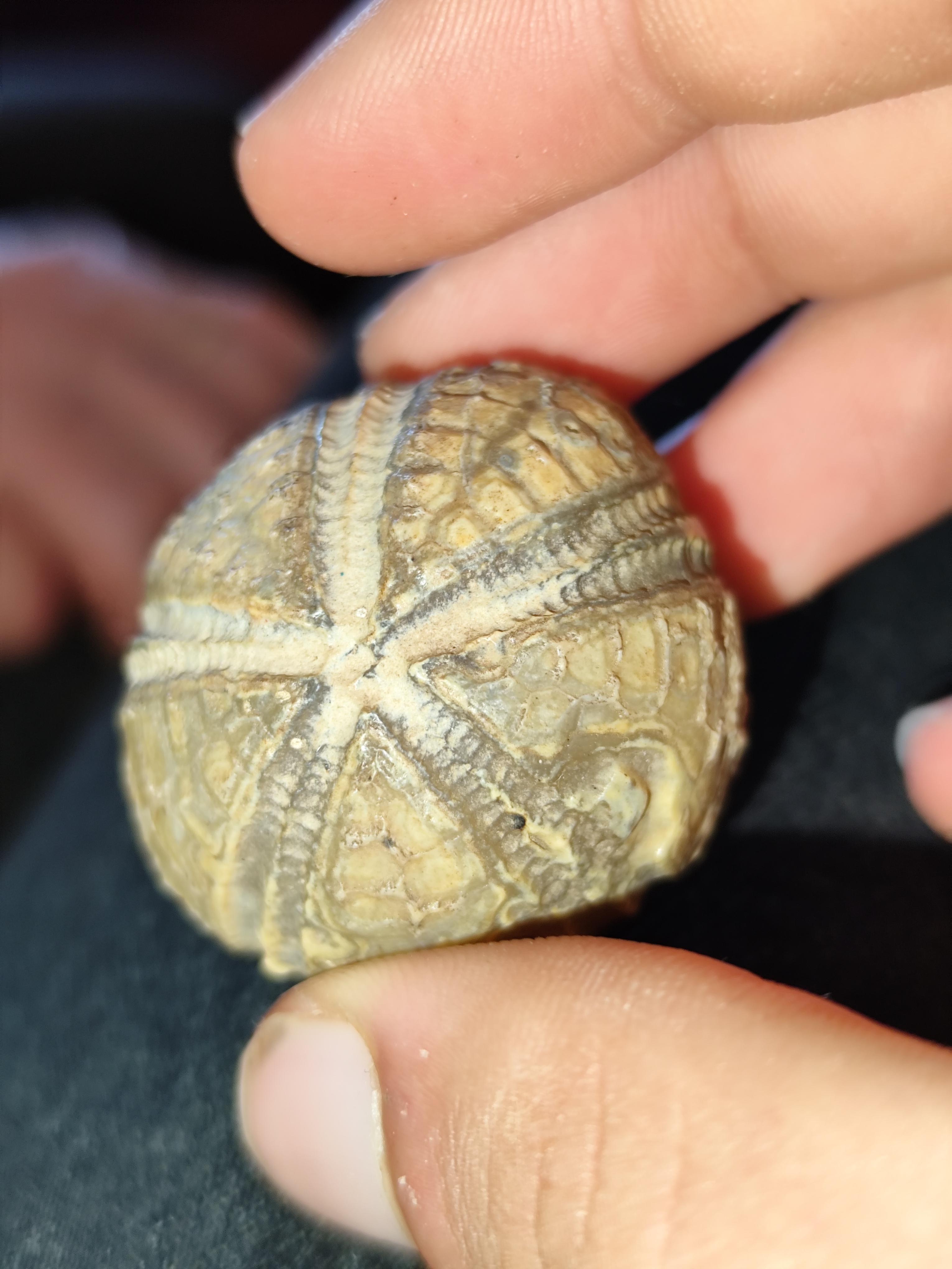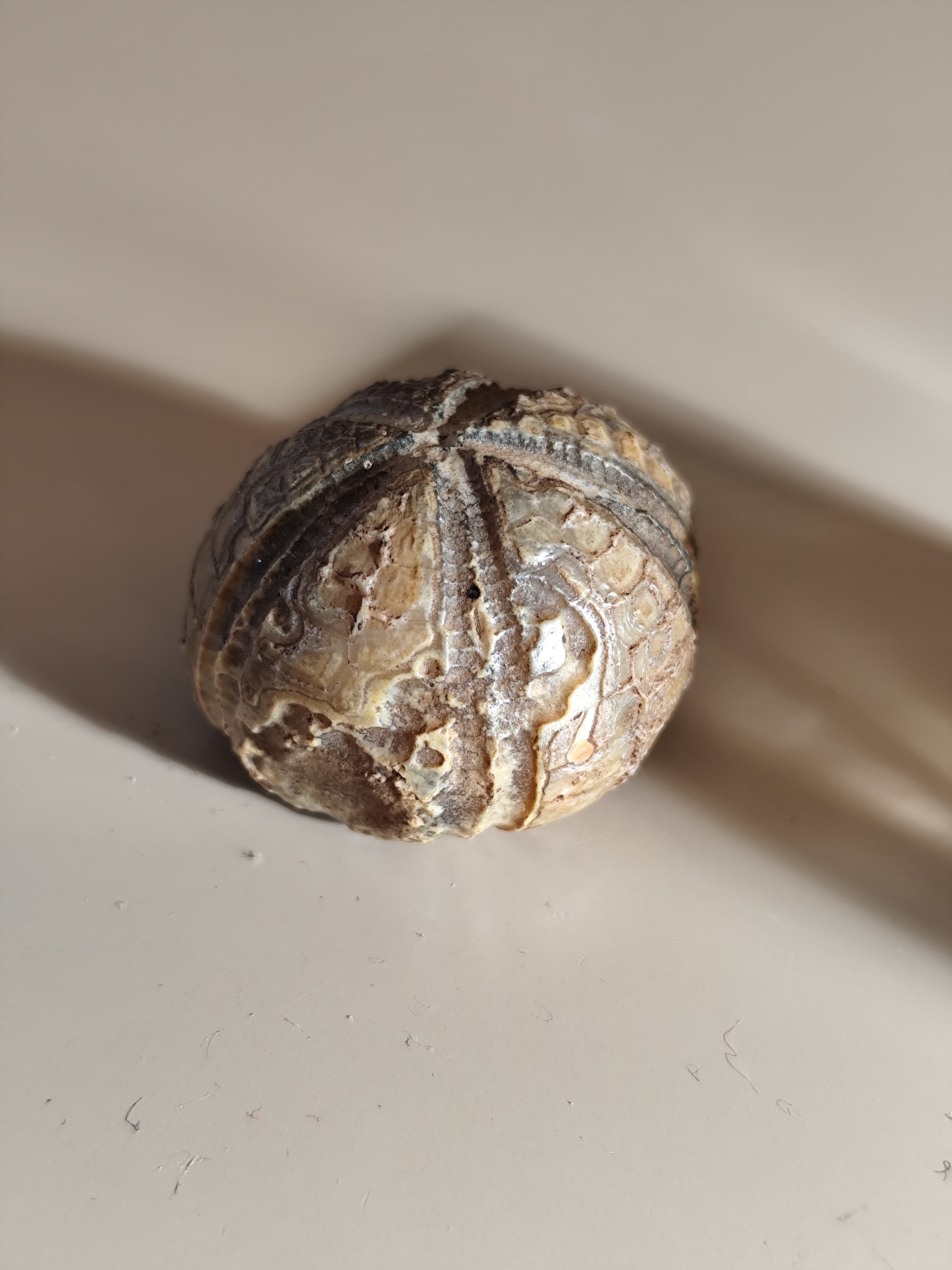 Mijn overgrootvader had in Aalten, dichtbij het Klooster, ongeveer 2-4 meter diep dit ding gevonden, en hij had het laten determineren door wat nu Naturalis Leiden is. Die zeiden dat het een zee-egel is, maar is nu ook te zien wat voor soort zee-egel het is? De onderkant is wat afgeplat.