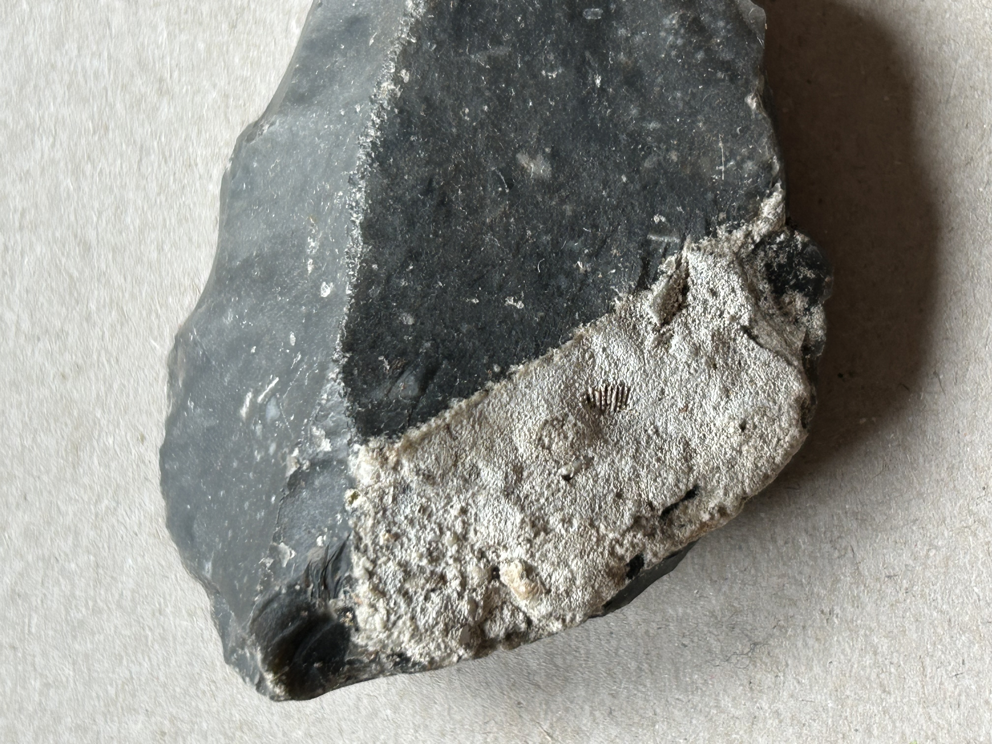 Ik ben ook zeker ook geen specialist op dit materiaal maar niet gek dat er nog een stukje cortex (wit) aan zit?