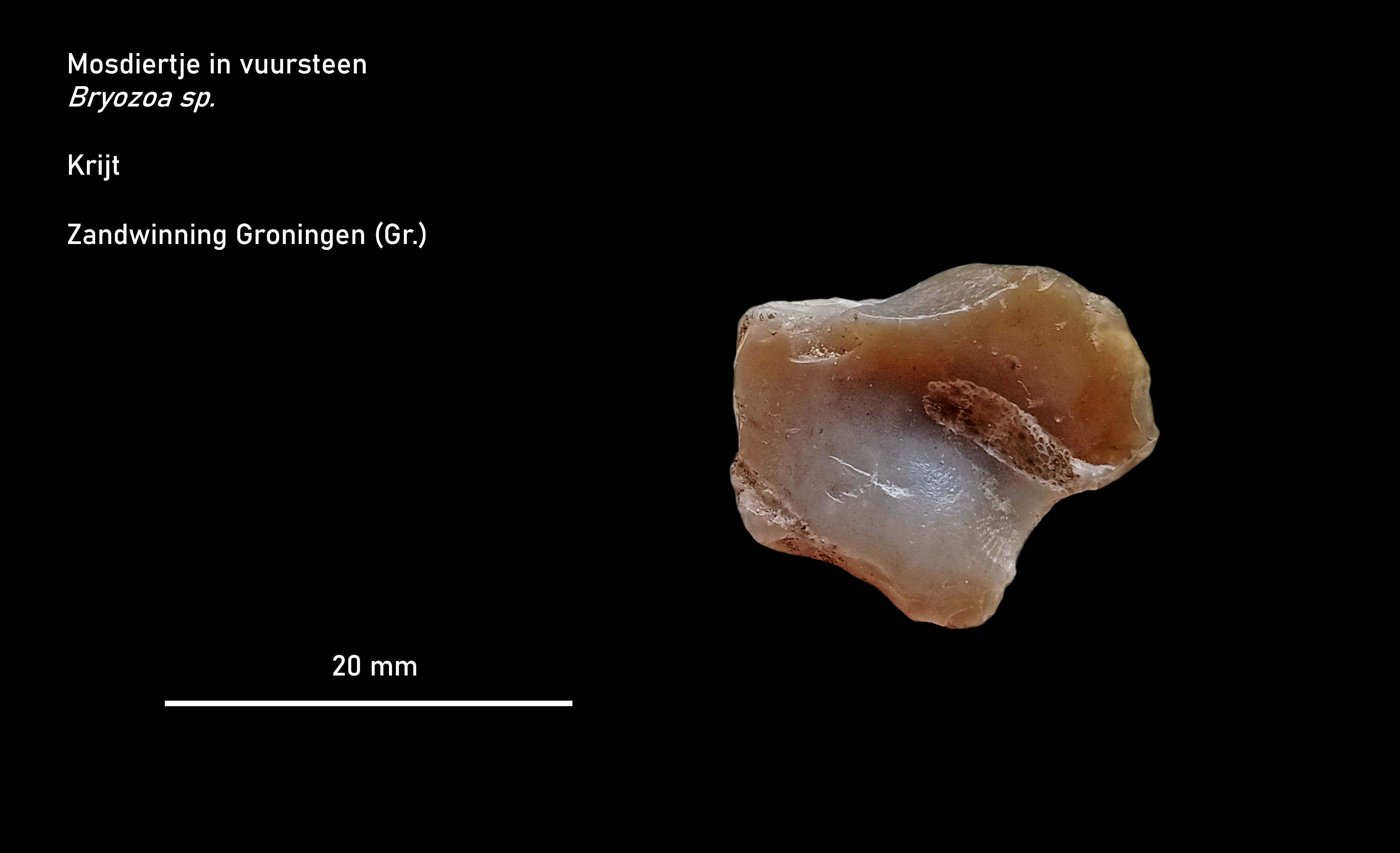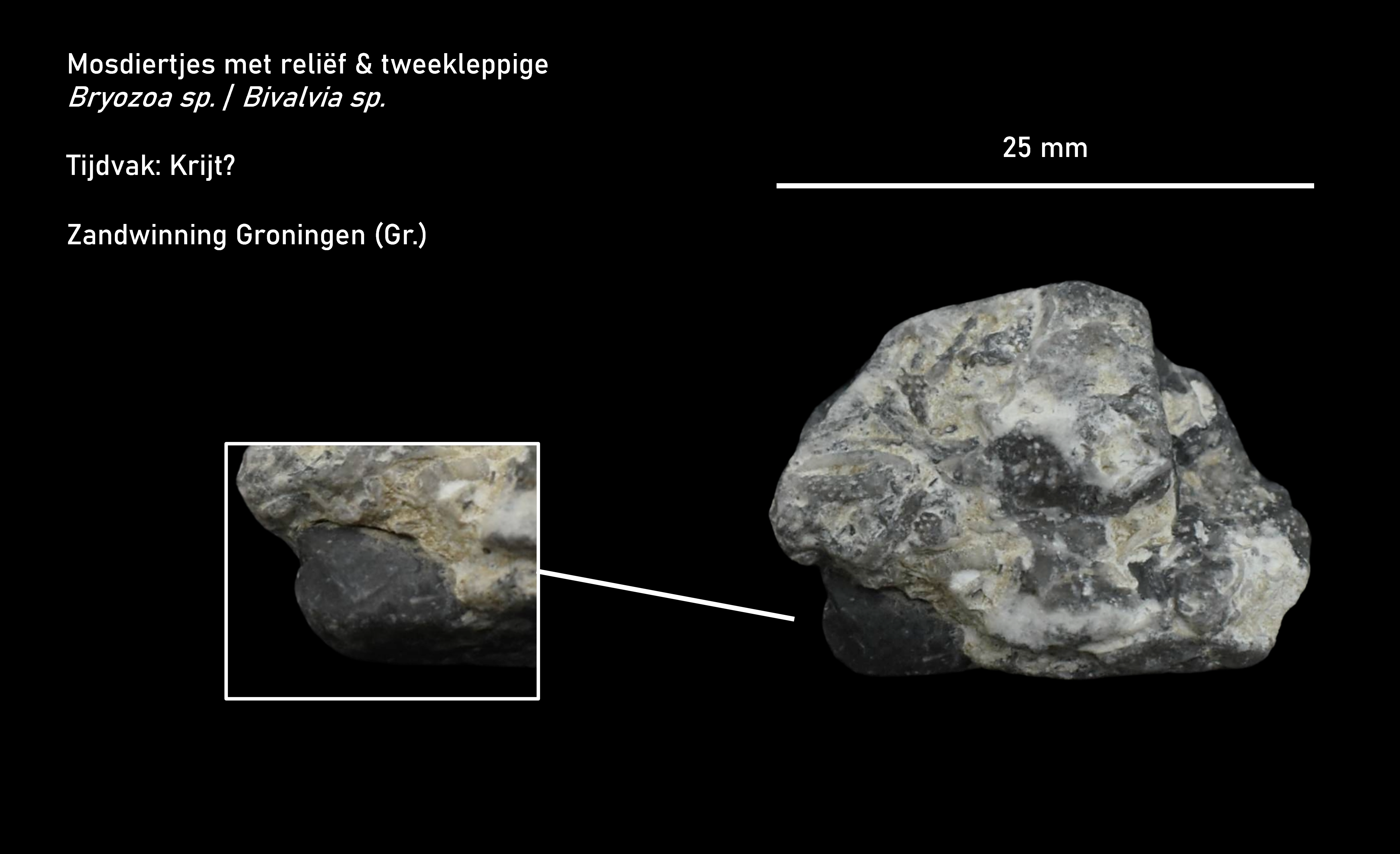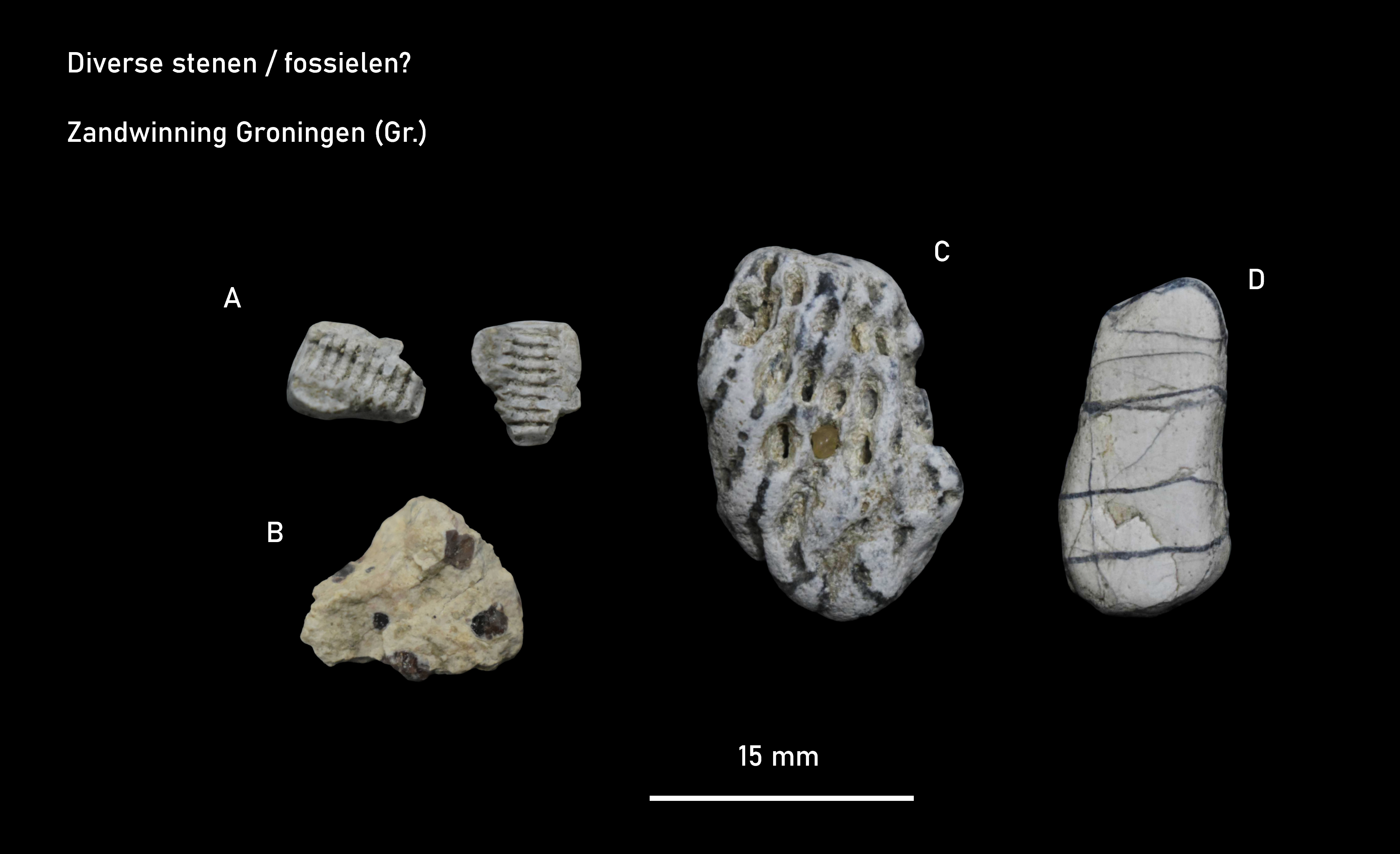 Ik vermoed dat het hierbij om een Rhizopoterion gaat maar de grootte van de gaten ogen een stuk groter dan de andere fragmenten die ik heb. Het leuke aan dit fossiel is dat de Mosdiertjes nog 3-dimensionaal op de oppervlakte liggen. Linksonder zit er ook nog een kleine tweekleppige schelp verstopt. En als laatste een divers groepje stenen. Misschien is A nog een fossiel? Maar het zou ook maar kunnen dat de afdruk door iets kunstmatigs is gevormd, vermoed ik. B. bevat mooie bruine kristalletjes, C. Lijkt ook op een fossiele poreuze spons, maar vanwege de gelaagdheid zouden de paralelle gaten misschien ook gewoon toevallig opgeloste mineralen kunnen zijn, D. Mooi steentje met opgevulde breeklijnen.