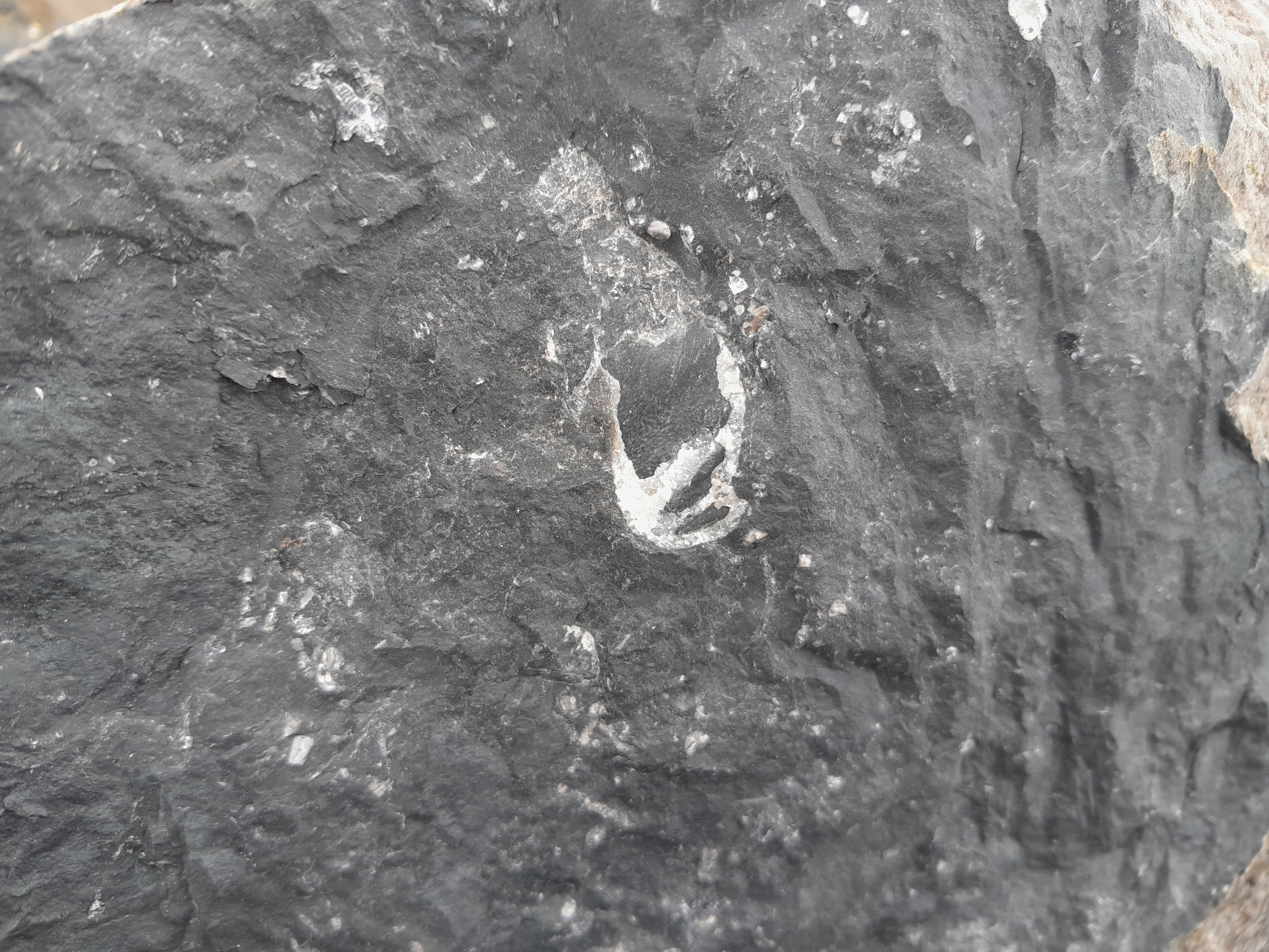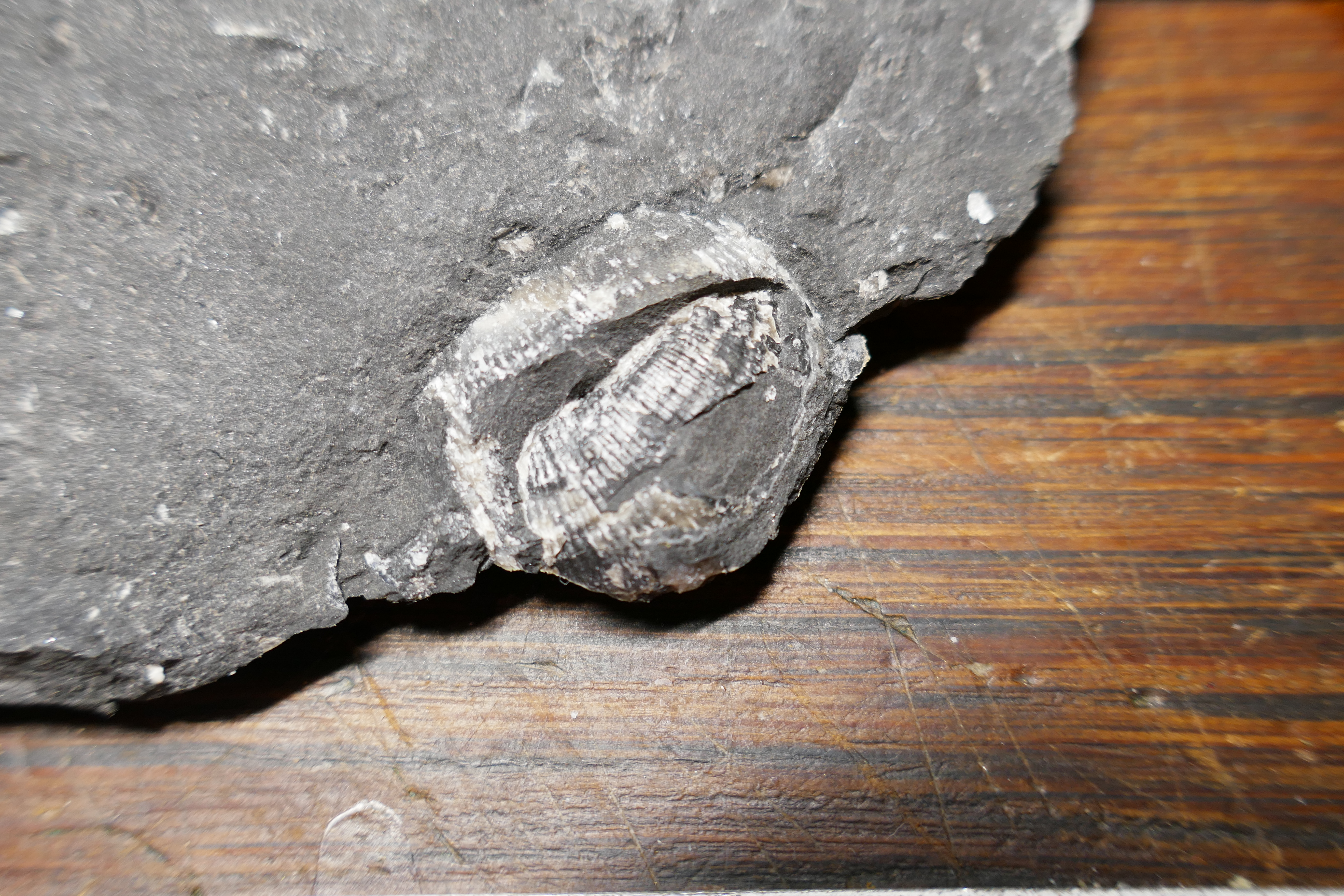 Voor zover mij verteld is het gesteente afkomstig uit België, en zou dateren uit het Carboon. Maar of dat klopt weet ik niet zeker. Ik heb er wat leuke fossielen uit kunnen halen, waarvan ik er hier een aantal laat zien (meer zodra ik de rest uit de schuur heb opgevist). Excuses voor het gebrek aan lineaal in de foto's.