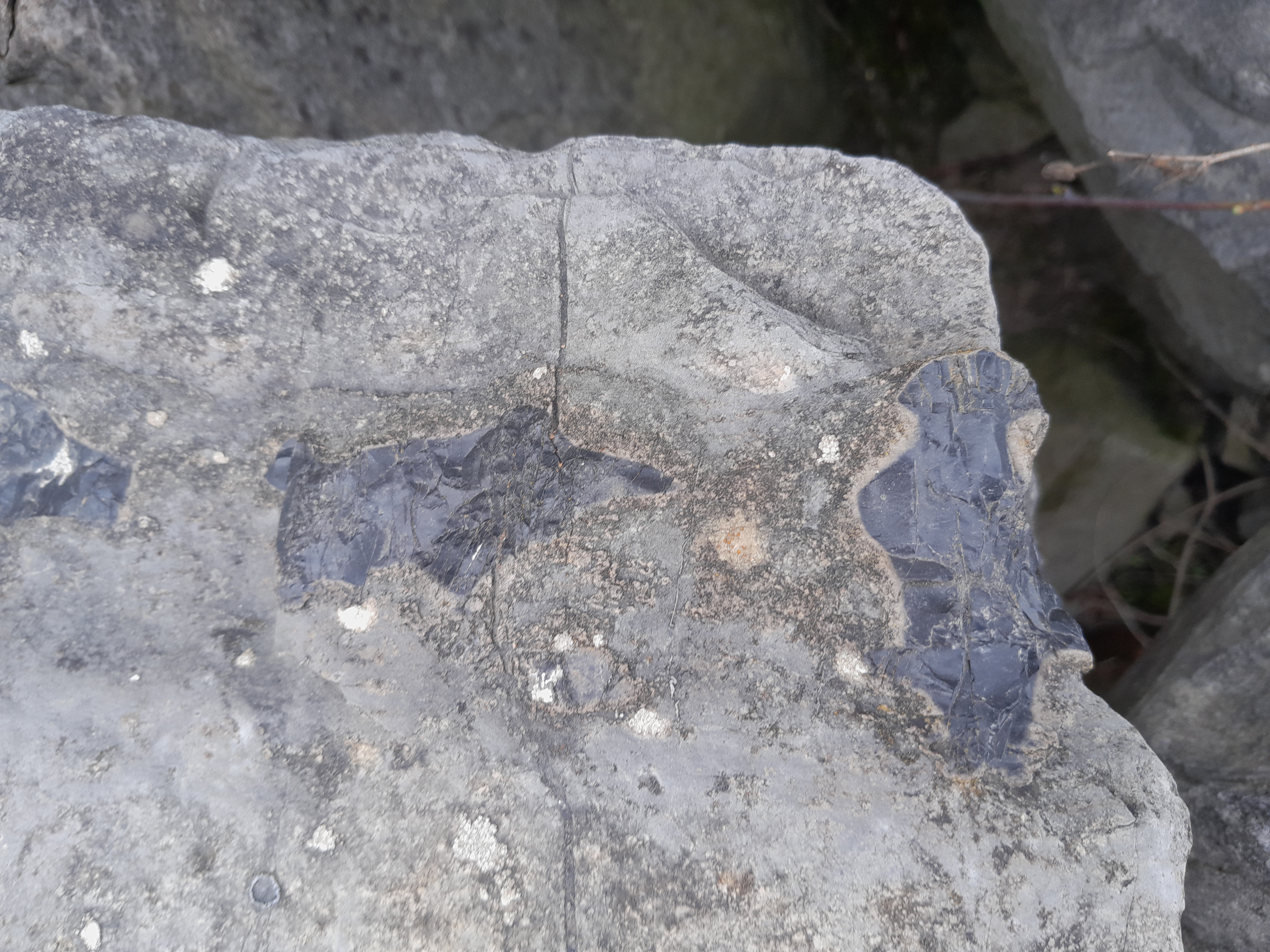 Dus dat beperkt het alleen tot de verweerde oppervlakte vondsten op de stenen. Wat me ook opviel waren de zwarte inclusies. Bij nader bekijken bleek dat vuursteen te zijn, wat logisch is in kalksteen.