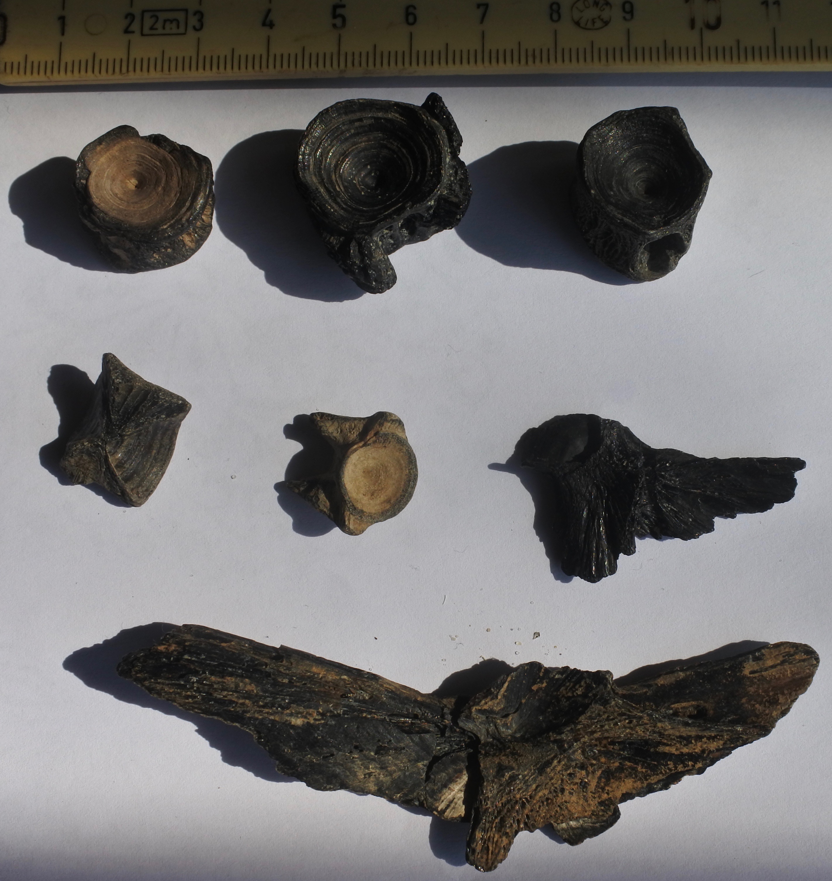 Onlangs (op 16 spril 2021) heb ik deze vijf fossiele vissenwervels en twee volgens mij delen van vinnen gevonden op het strand van Ameland (bij de strandopgang van het Westerpad, links afslaand richting Ballum).