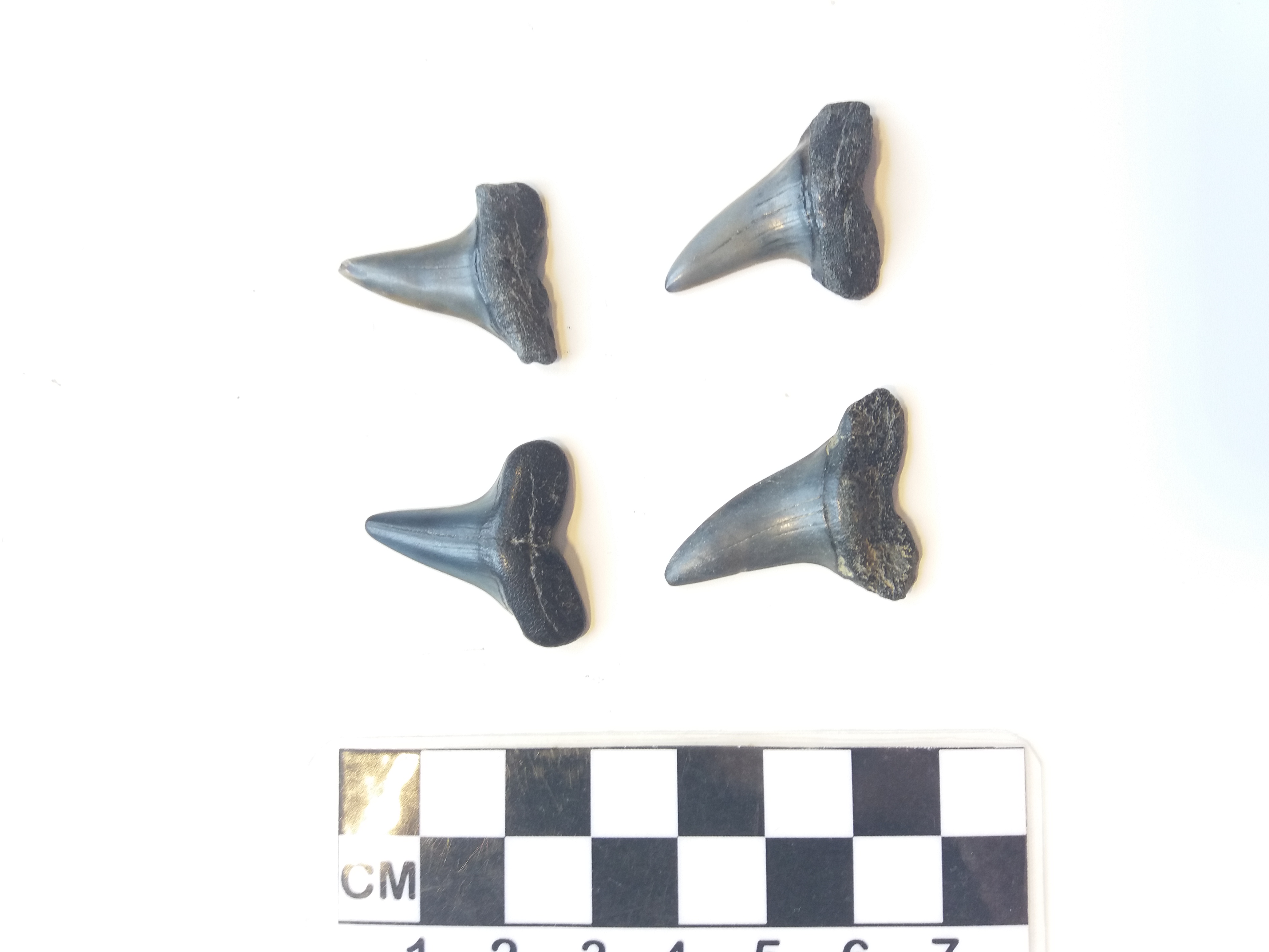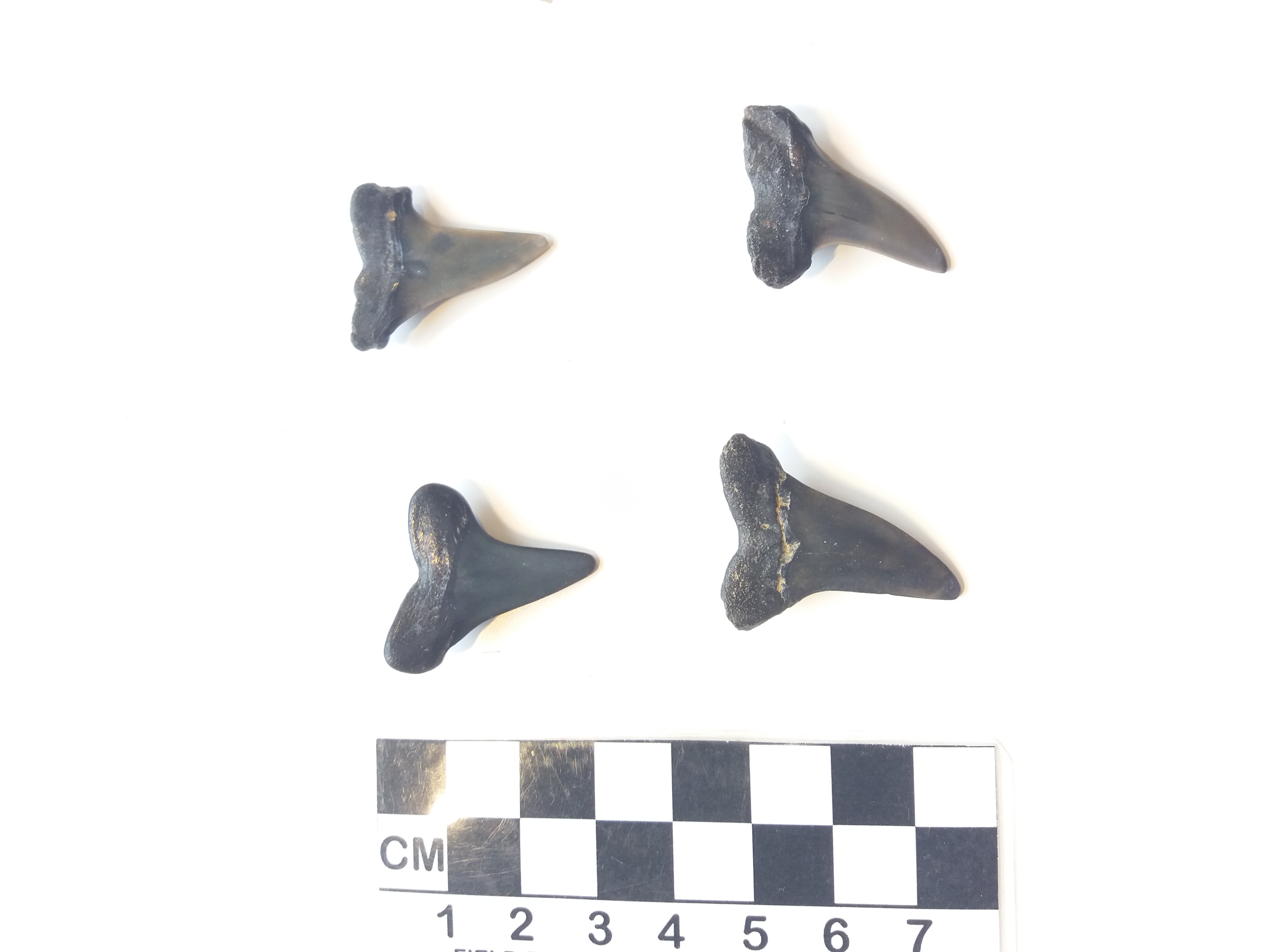 Batch 2 bevat 4 middelgrote tanden waarvan ik vermoed dat ze toebehoren tot de familie van de makreelhaaien (Isurus retroflexus, Isurus oxyrinchus of Isurus escheri) - mio/plioceen