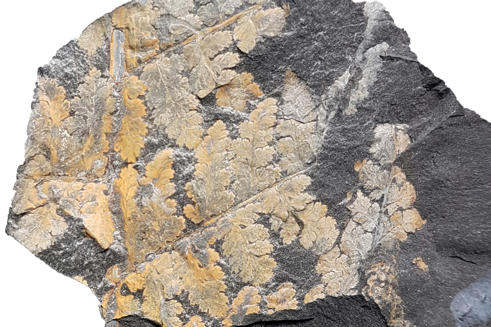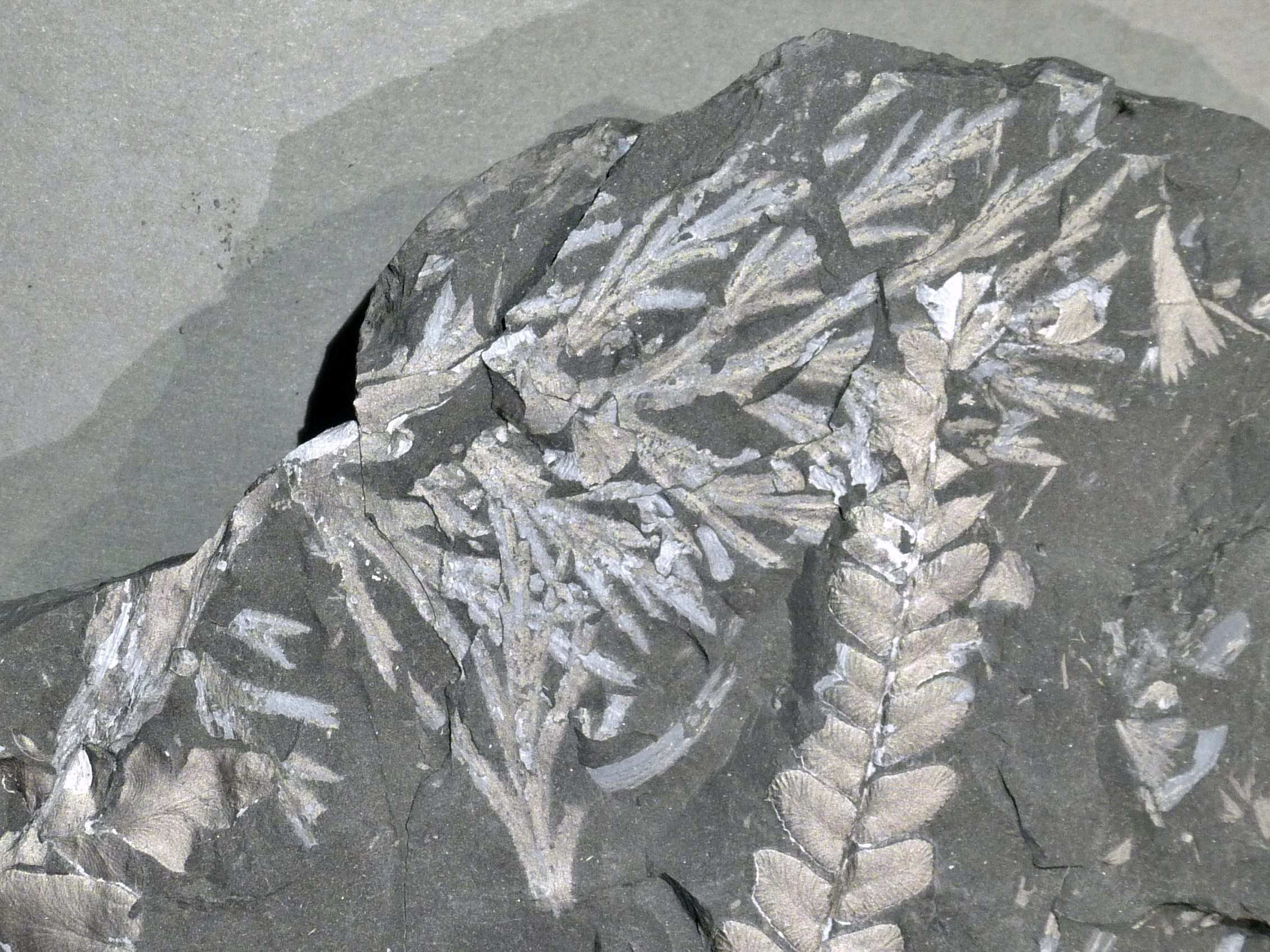 Laten we deze draad direct wat verder uitbreiden met iets wat ik nog niet eerder op Fossiel.net heb laten zien. Onderstaande foto's tonen een alethopteride bladvorm, die ik na een literatuurzoektocht en een bevestiging door dr. C.J. Cleal, uiteindelijk heb weten te determineren als Alethopteris pseudograndinioides Zodrow and Cleal 1998. Vergelijkbare stukken worden in de literatuur soms ook wel aan A. grandinioides (Wagner, 1968) of A. pontica toegeschreven (Josten, 1991), maar deze namen zijn taxonomisch gezien problematisch (Zodrow en Cleal, 1998).