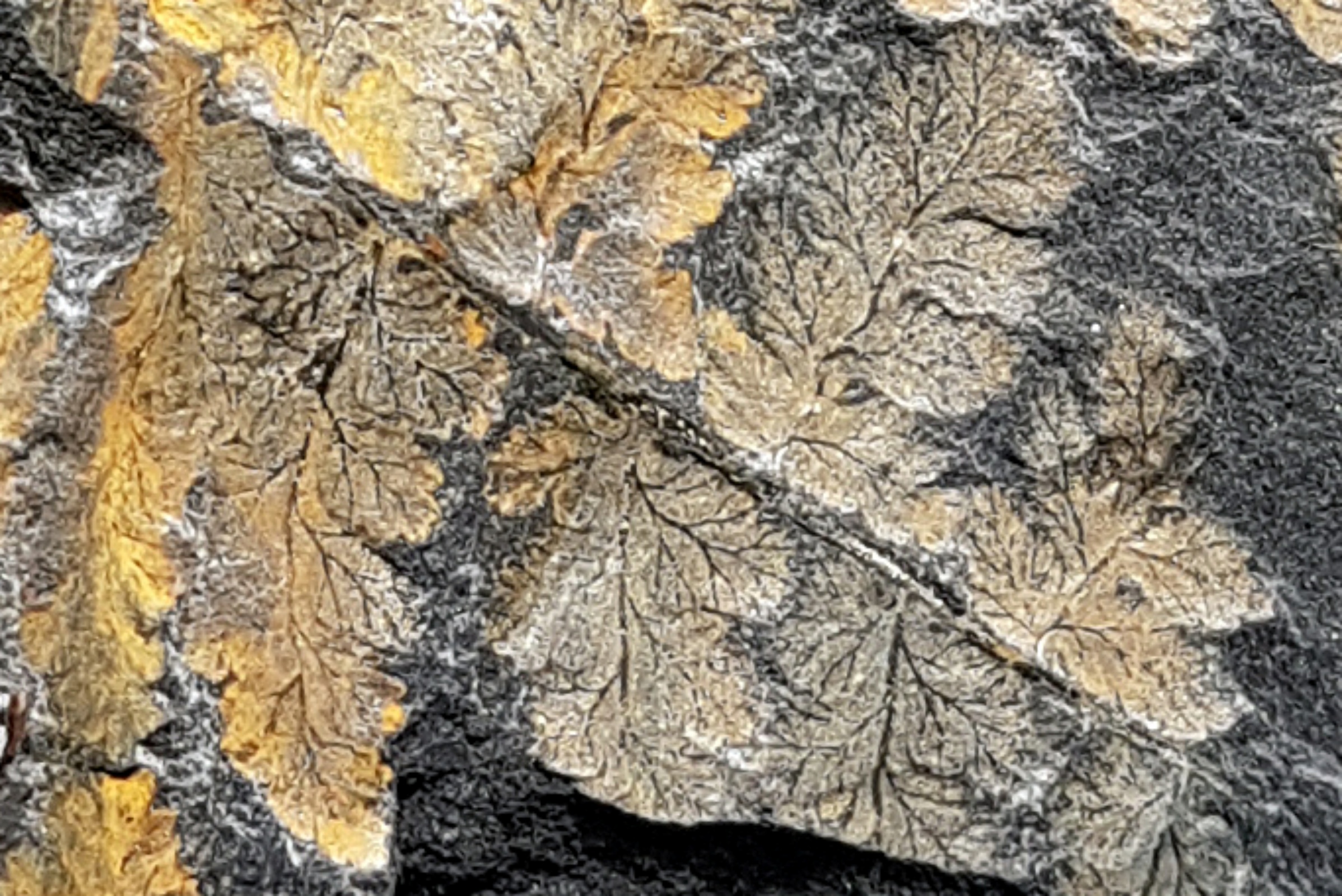 Onderstaande foto's tonen enkele fragmenten van een andere Piesberg-plant. Hoewel ik mezelf inmiddels redelijk ervan heb overtuigd, zet ik voor de zekerheid toch nog maar even "cf." voor de naam Renaultia chaerophylloides (Brongniart) Zeiller 1883. De pinnules van deze sphenopteride plant zijn behoorlijk variabel in vorm, maar vaak enigszins hoekig tot stomp getand. De nervatuur is goed zichtbaar op de laatste foto. Helaas bestaat er ditmaal geen Wikipedia-pagina om naar te verwijzen, maar Danzé (1956) is een best aardige, vrijelijk verkrijgbare referentiebron.