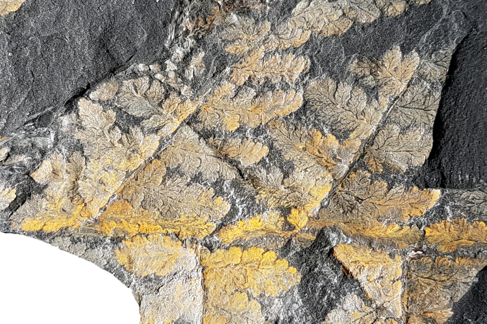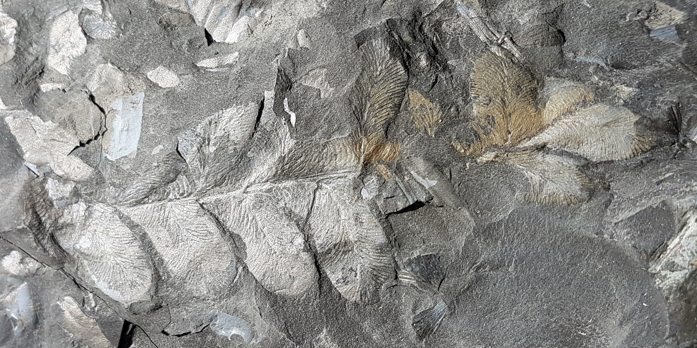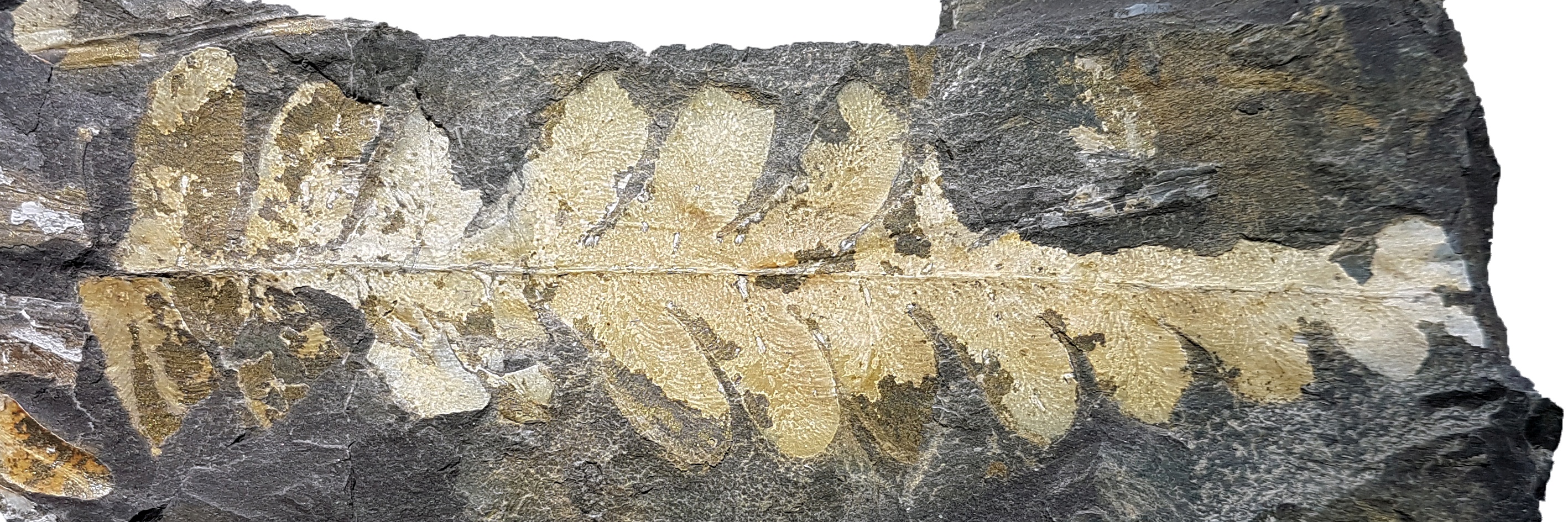 Oplettende Fossiel.netters zullen zich misschien herinneren dat ik deze plant eind vorig jaar al eens heb getoond, maar ik vond het toch zinnig om hem ook in deze overzichtsdraad mee te nemen: Sphenopteris spiniformis Kidston 1893. Zoals de naam doet vermoeden heeft deze plant sphenopteride pinnules die soms stekelvormige structuren dragen. Op de tweede foto, van de onderste pinna, zijn ze met gele pijlen aangegeven. Wat verder opvalt is dat deze plant een vrij stevige rachis (middenas) had. De biologische affiniteit van Sphenopteris spiniformis is onbekend.