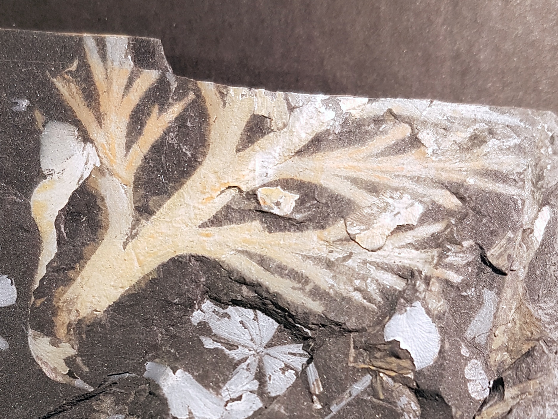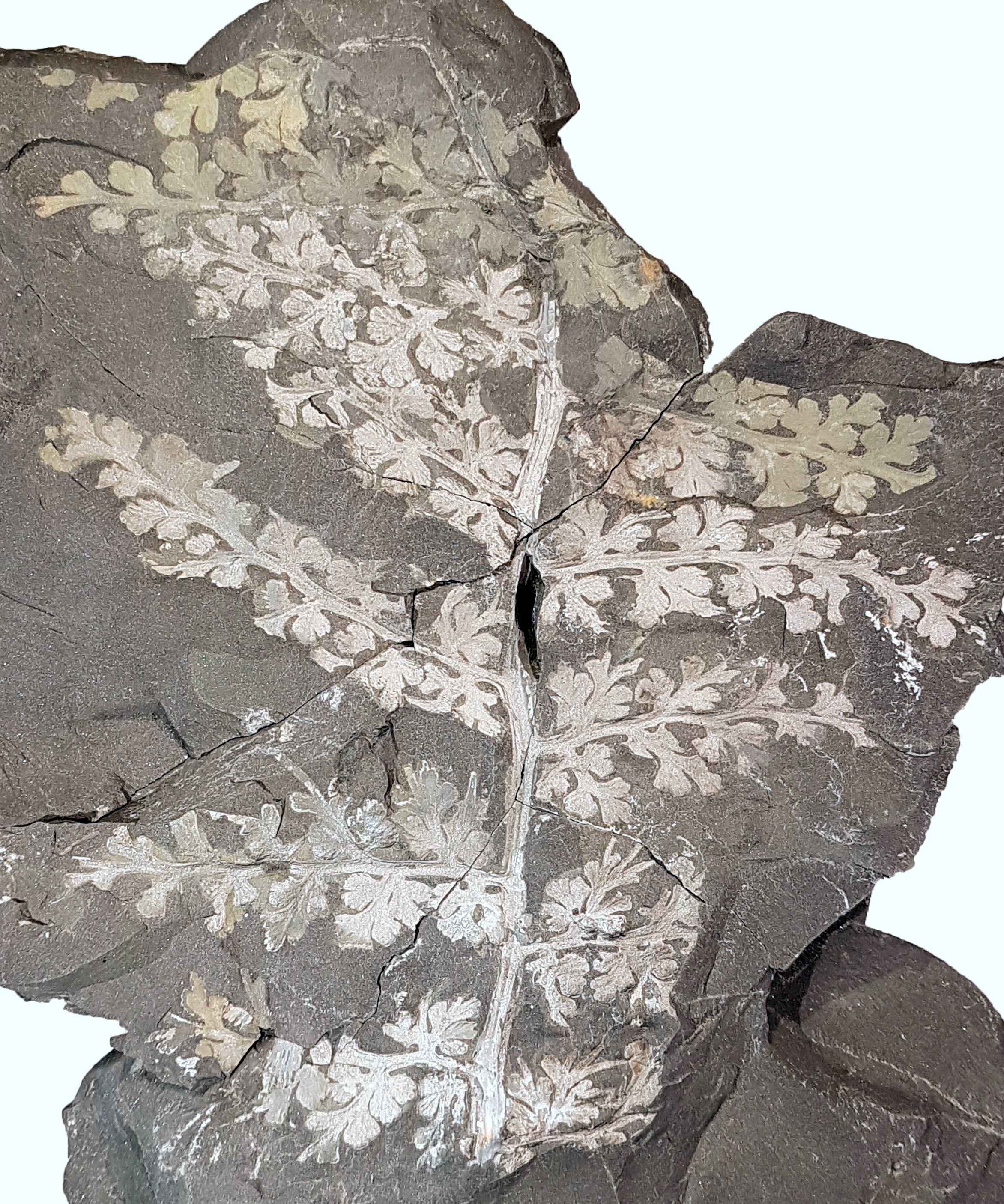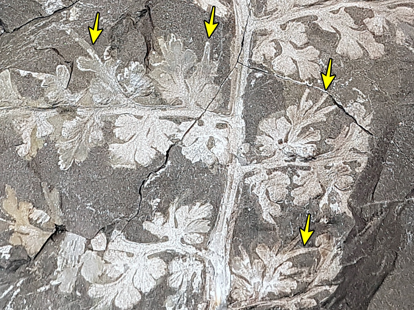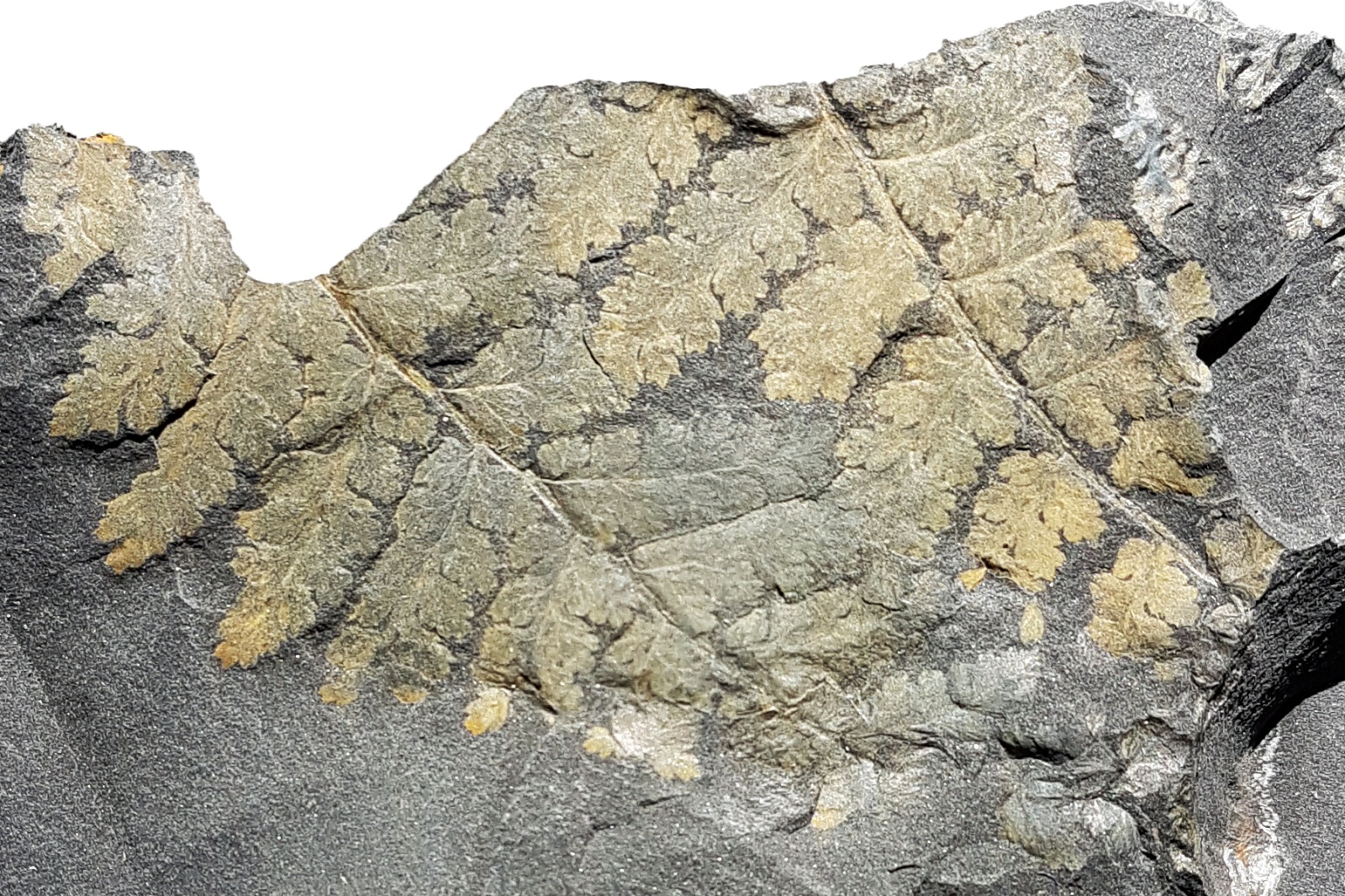 Oplettende Fossiel.netters zullen zich misschien herinneren dat ik deze plant eind vorig jaar al eens heb getoond, maar ik vond het toch zinnig om hem ook in deze overzichtsdraad mee te nemen: Sphenopteris spiniformis Kidston 1893. Zoals de naam doet vermoeden heeft deze plant sphenopteride pinnules die soms stekelvormige structuren dragen. Op de tweede foto, van de onderste pinna, zijn ze met gele pijlen aangegeven. Wat verder opvalt is dat deze plant een vrij stevige rachis (middenas) had. De biologische affiniteit van Sphenopteris spiniformis is onbekend.