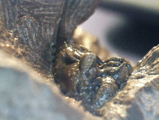 Nog enkel de wangstekels op de linker zijde,deze zijde is wat los van de glabella en daardoor is het oogje wat weggezakt onder het kapje er achter.