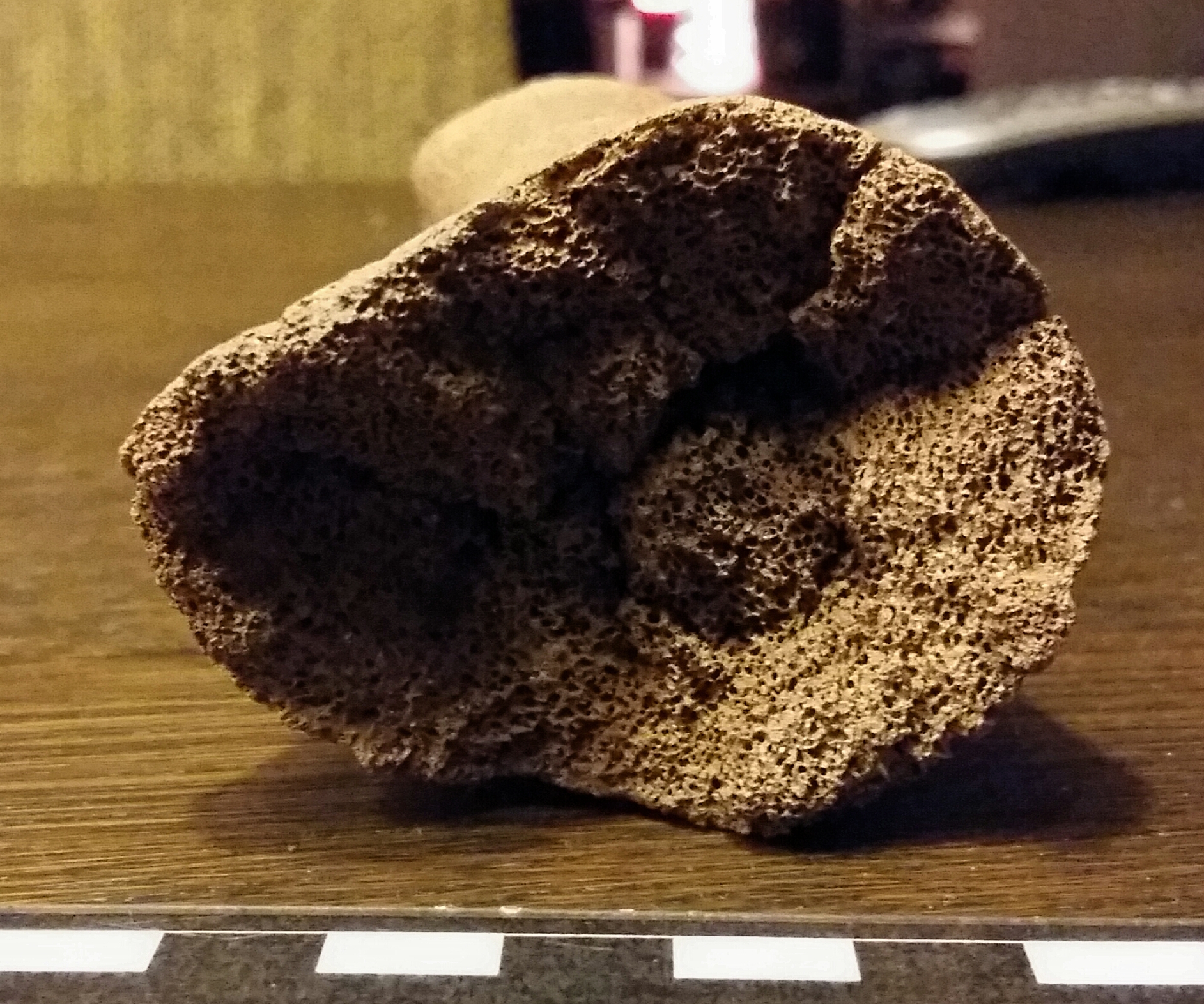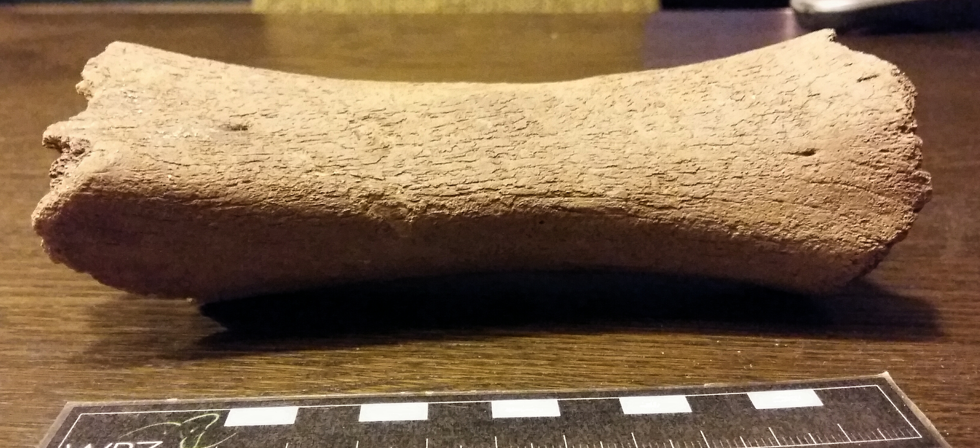 Pin mij er niet op vast, maar het lijkt een bot (humerus?) van een jonge mammoet, met mogelijke hyenavraat. Ik heb er zelf ook een en heb ze dit jaar vaker voorbij zien komen. Laat eens aan Dick Mol zien voor de zekerheid.