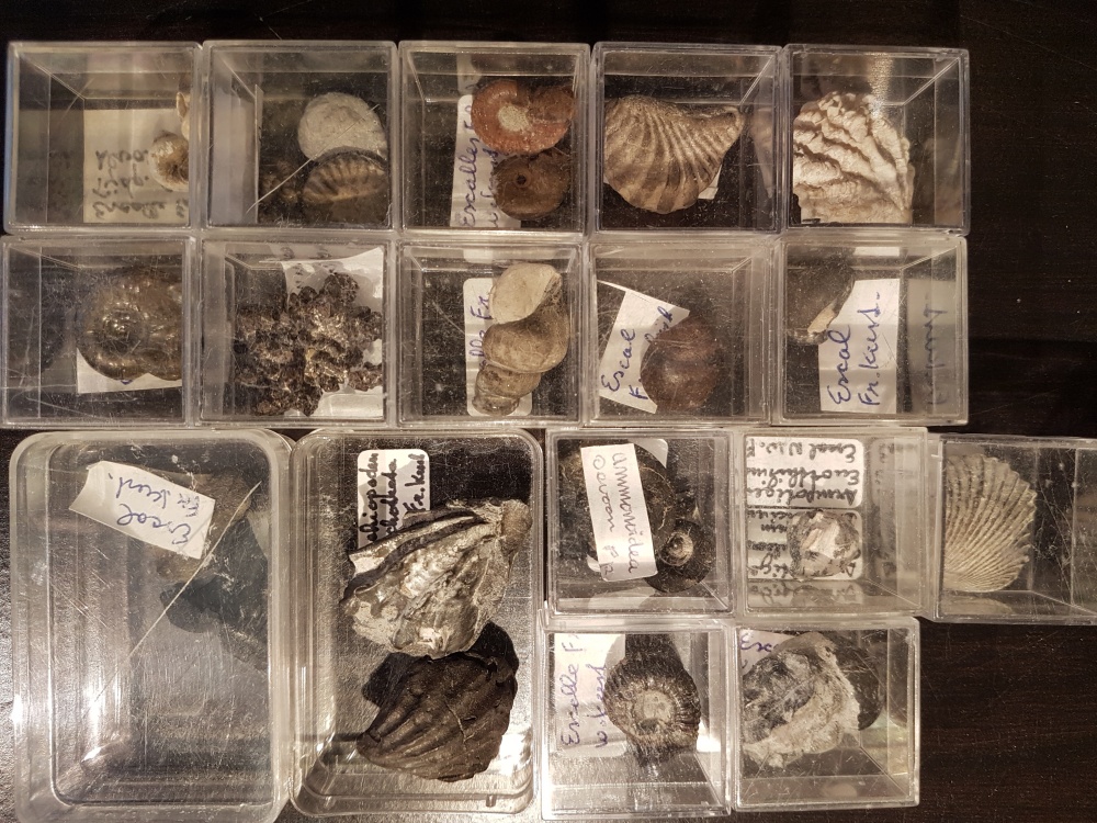 set kleine fossielen (ammonieten, brachiopoden, etc.) uit het Devoon tot Cenozoicum van Escalle, Frankrijk