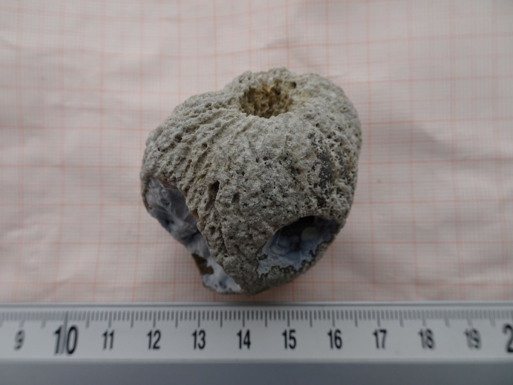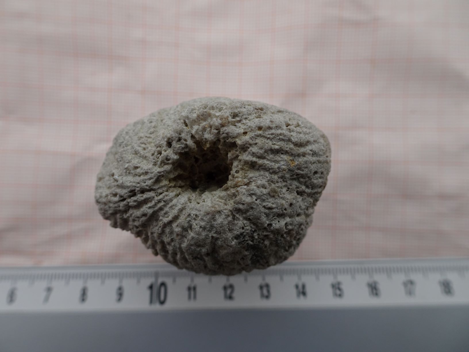 Ik denk dat je gelijk hebt met 'een "complete" maar wel wat geërodeerde Aulocopium aurantium'. Zeker omdat het rimpelhuid-gedeelte /de cortex zo klein is. Je kan ook nog aan een Hydrospongia denken wellicht, maar daarvan is de rimpelhuid meestal meer naar boven getrokken, moeten er eigenlijk 'ringen' aanwezig zijn en vooral moet er sprake zijn van minstens twee duidelijke min of meer overgroeide uitstroomsystemen. Het onderscheid is een beetje arbitrair. Lees het artikel van Freek er maar eens op na ('Koppen en kappen' /G & H 2005). Hij veronderstelt hierin zelfs de mogelijkheid van een kleine, nieuwe soort.