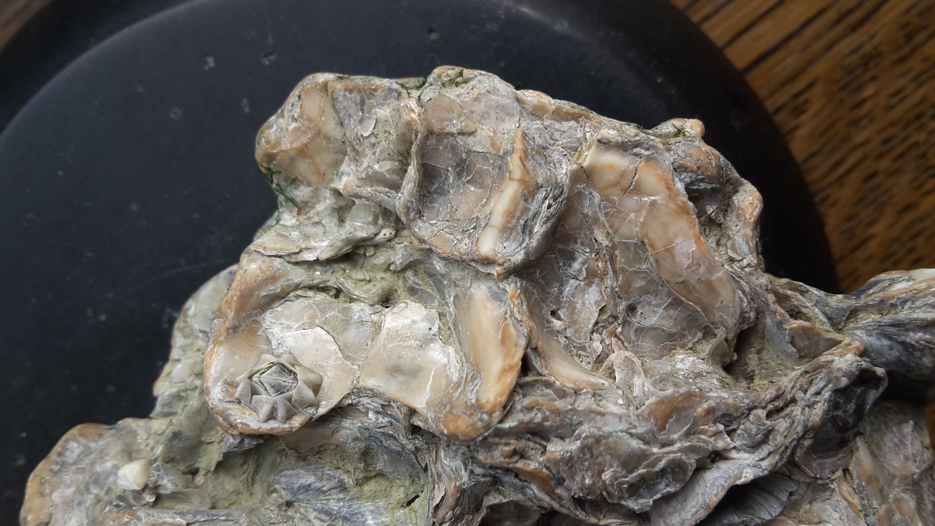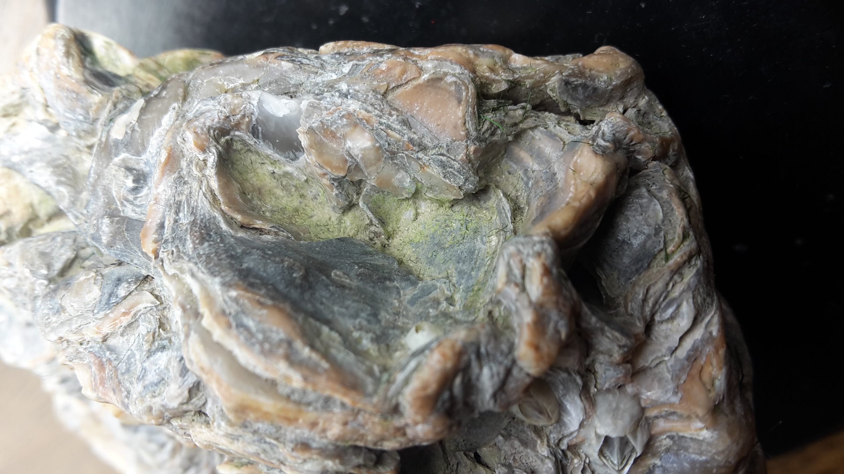 Een paar weken terug vond ik deze klomp fossielen oesters op de MV. Het stuk zat onder de groene algen. Dat heb ik met warm water en dreft er aardig afgekregen. Hier en daar ziet het nog groen. Volgens mij zijn de zeepokken mee gefossiliseer. Voelt als steen. Het hele stuk is 10 cm bij 9 cm en weeg zo zwaar als een steen van dat formaat. Kan 1 van de fossiel experts op basis van de foto's nog iets vertellen over het stuk en mogelijk iets zeggen over ouderdom?