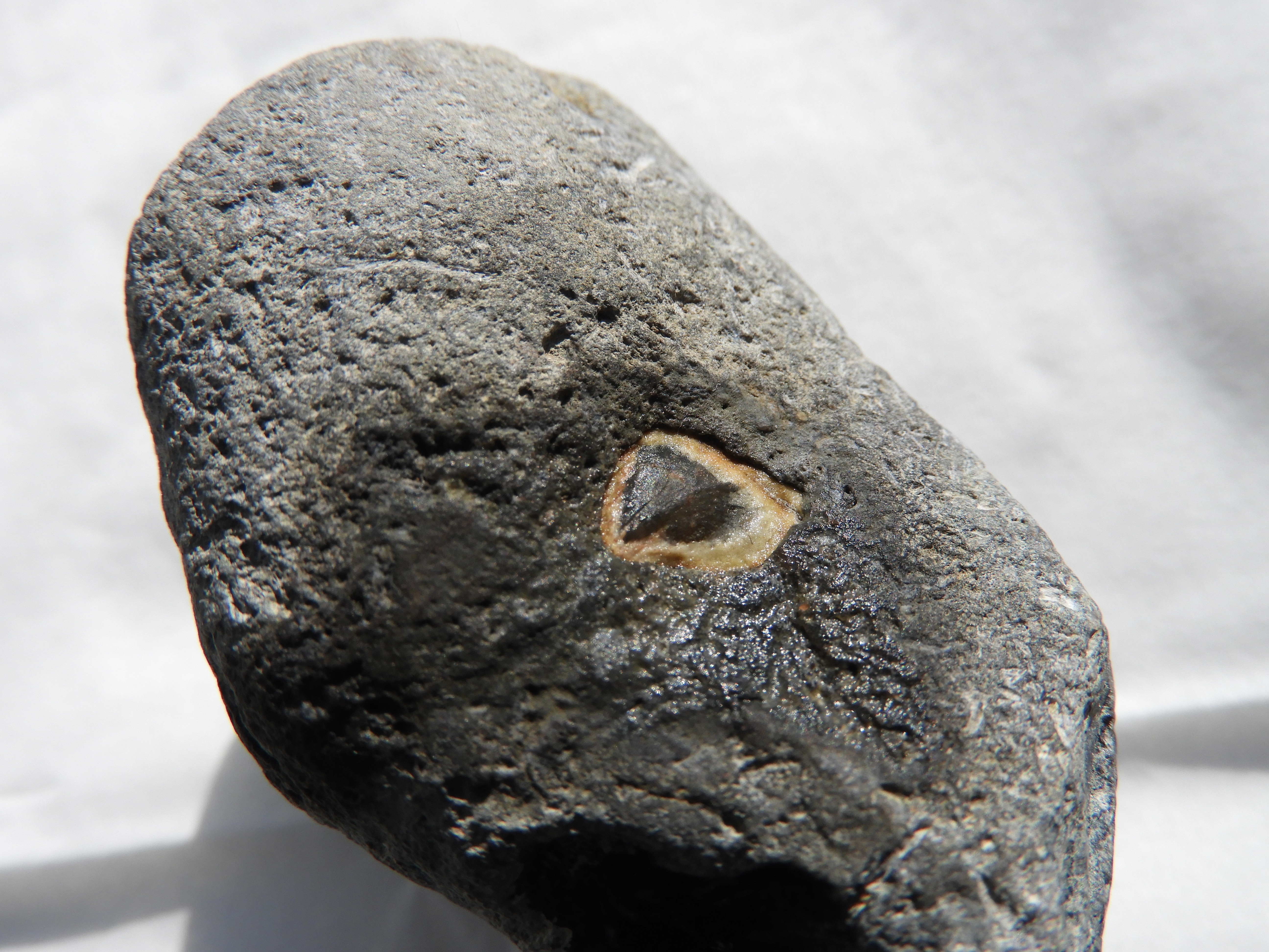 Ook deze vuursteen komt van het strand van Texel. Er is een patroontje zichtbaar, doorsnede ongeveer 7 mm, dat mij vanwege de vorm doet denken aan een vissentandje of een fragment van een schelpje. Kan iemand hier iets over zeggen aan de hand van bijgevoegde foto's? Het was lastig om er nog betere foto's van te maken omdat het een klein fragmentje is. Hopelijk zijn de foto's duidelijk genoeg.