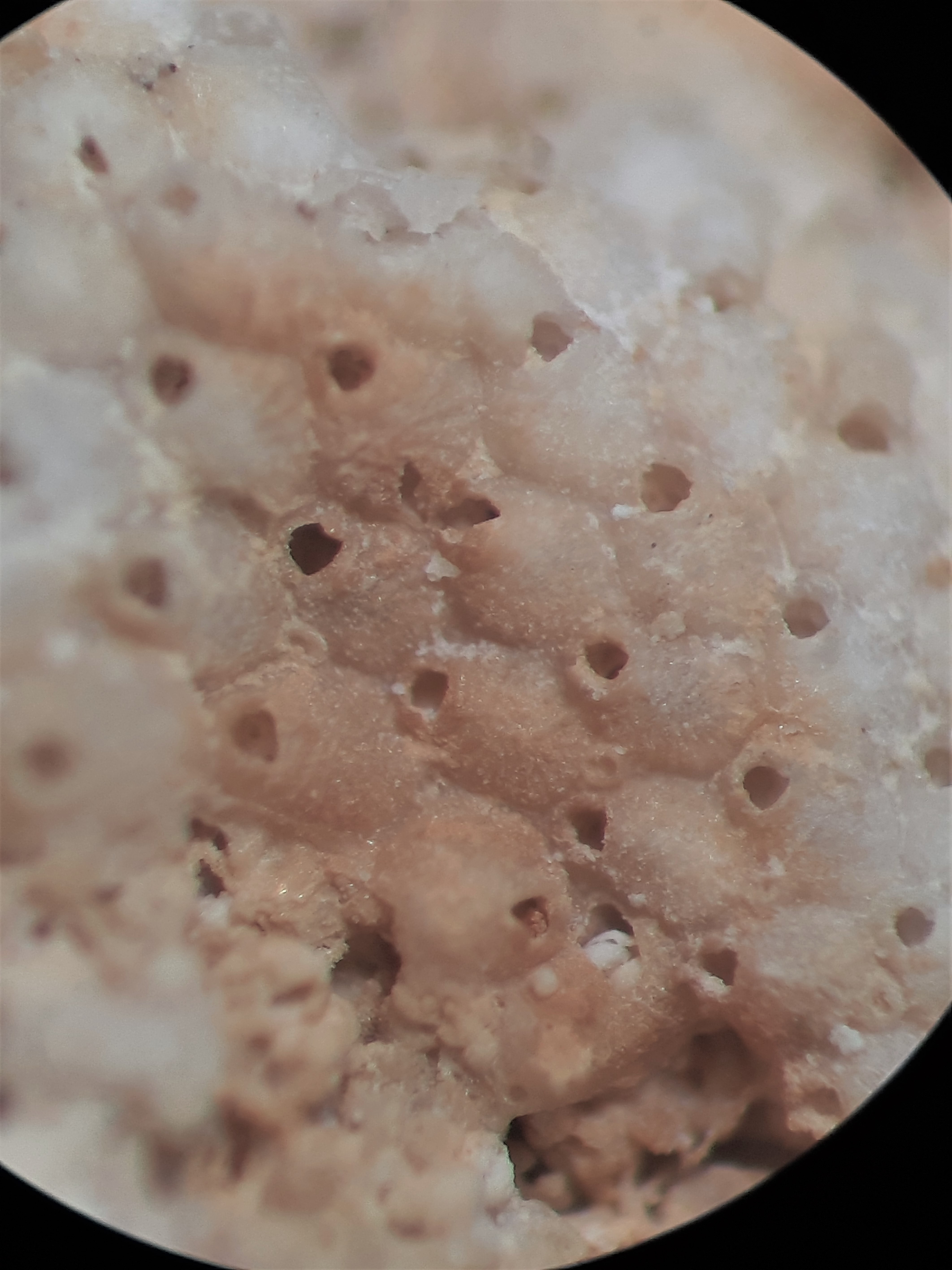 Op de eerste twee foto's zie ik vooral een Voigtopora aff. calypso (d’Orbigny). Deze soort vormde uniseriele, dichotoom vertakkende kolonies met lange buisjes (peristomen), door die het dier zijn tentakels naar buiten kon duwen. Daarboven (onscherp) zit een Onychocella pseudoirregularis. In het onderste gedeelte zie ik een Setosinella, die ik op het moment zelf nieuw beschrijf.