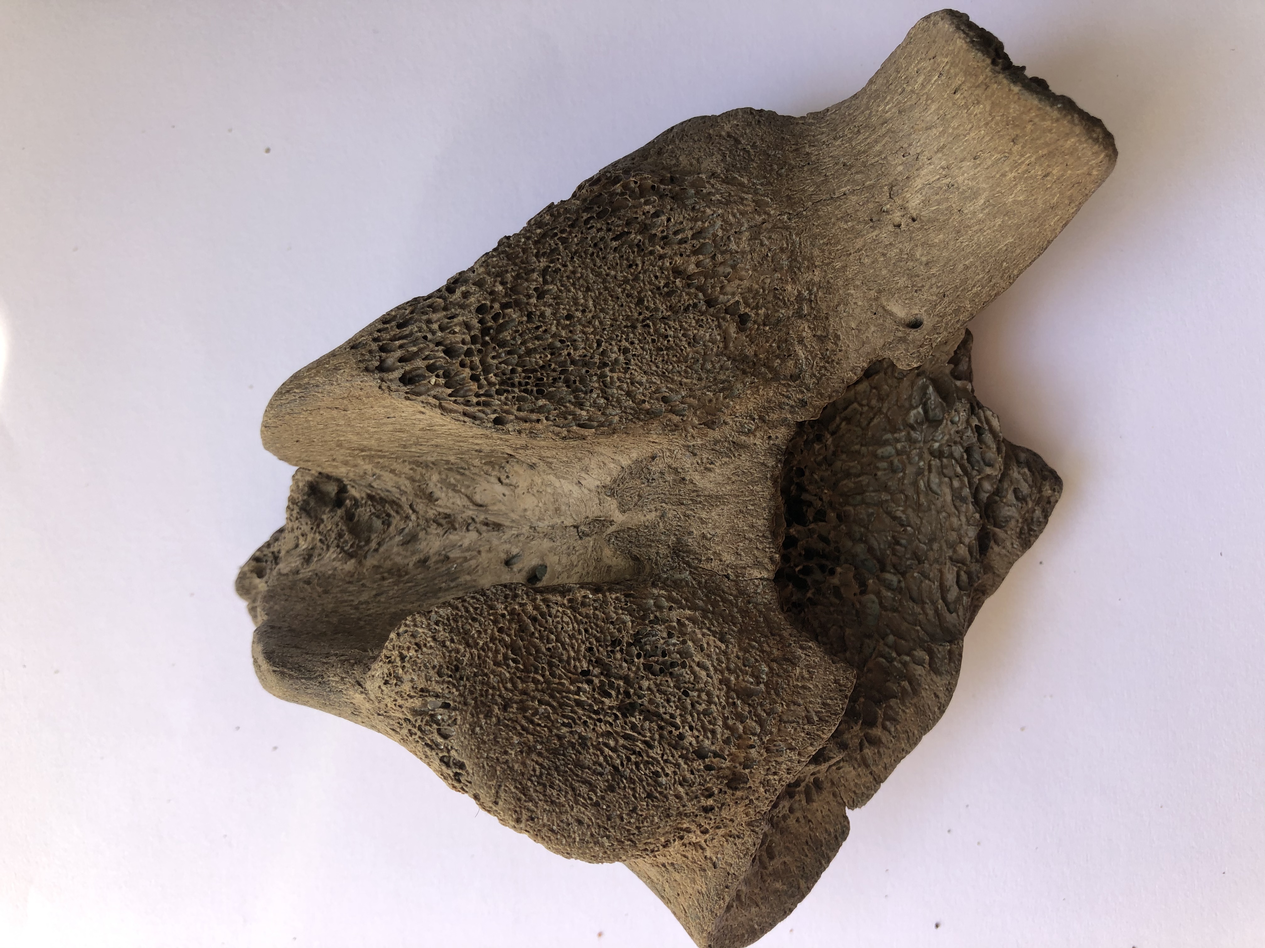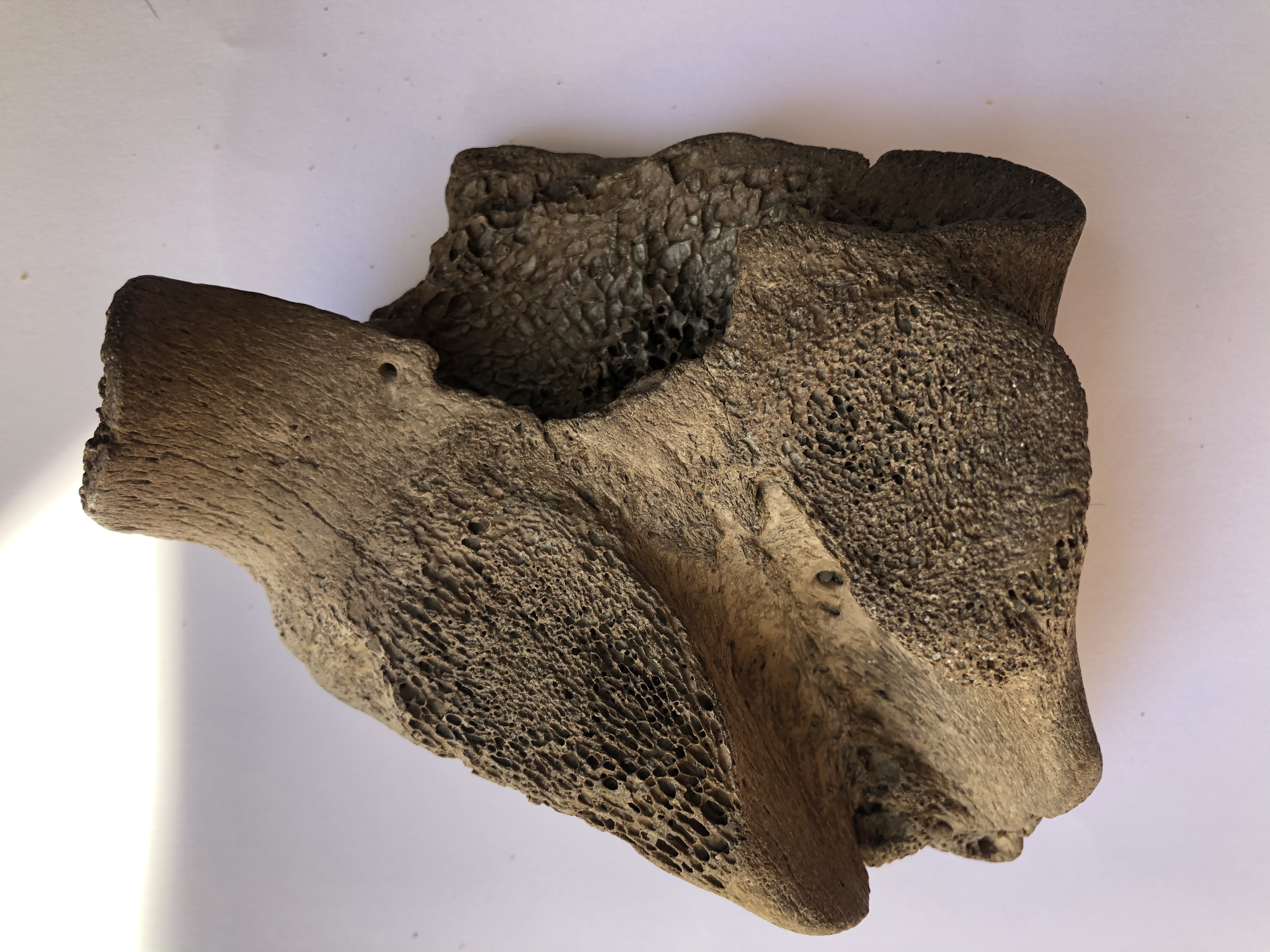 De afgeplatten stukken op het mammoet-wervel-fragment zijn articulatie vlakken waarmee het bot een deel van de volgende wervel raakt.