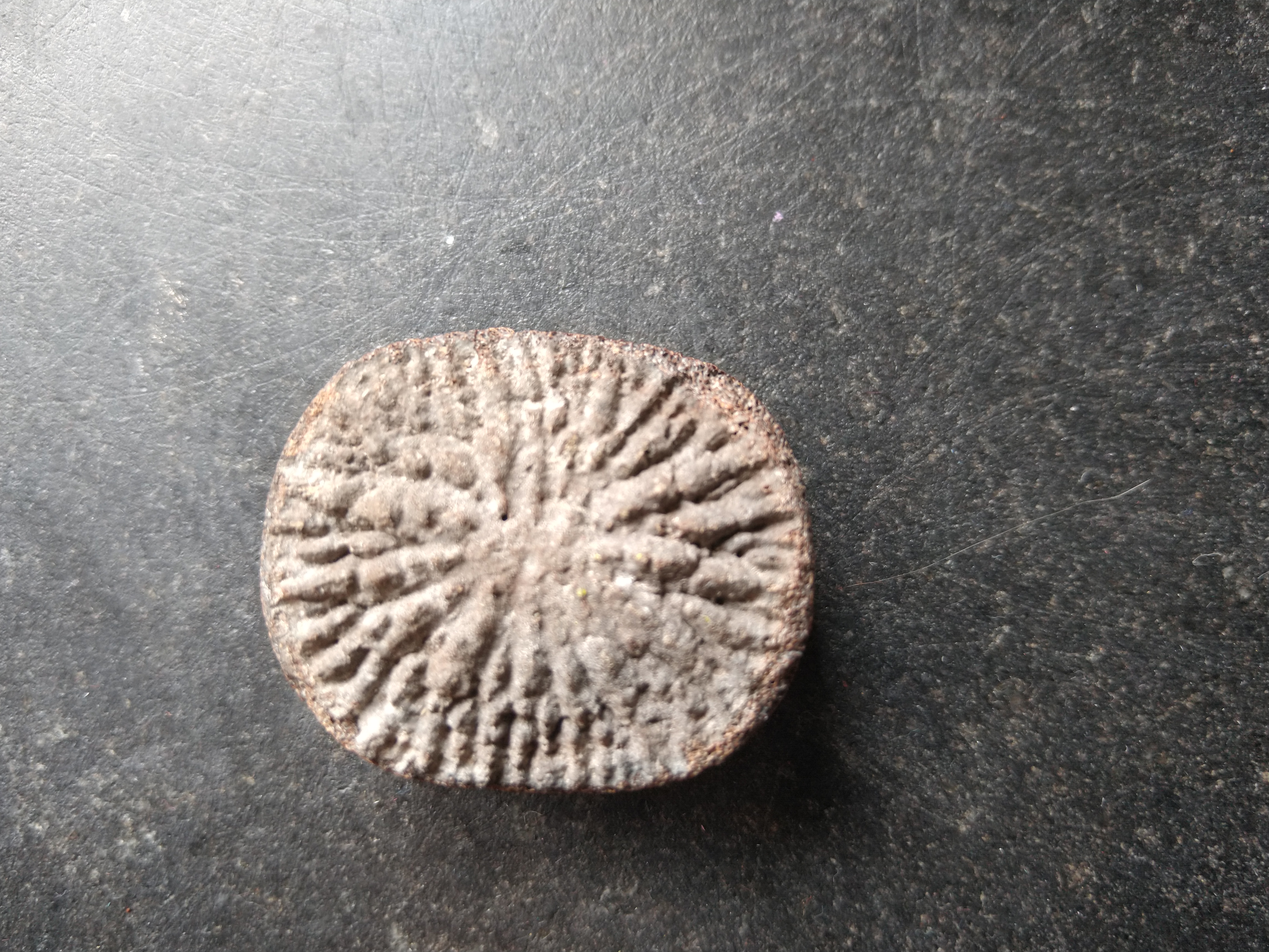 Mijn dochter heeft deze steen gevonden. Het is heel licht en het lijkt mogelijk op een fossiel. De omtrek is die van een ouderwetse rijksdaalder. En de steen is dan een centimeter of drie dik. Ik kan niets vinden dat er op lijkt. Misschien kan iemand me hier vertellen wat het zou kunnen zijn? Hartelijk dank alvast.