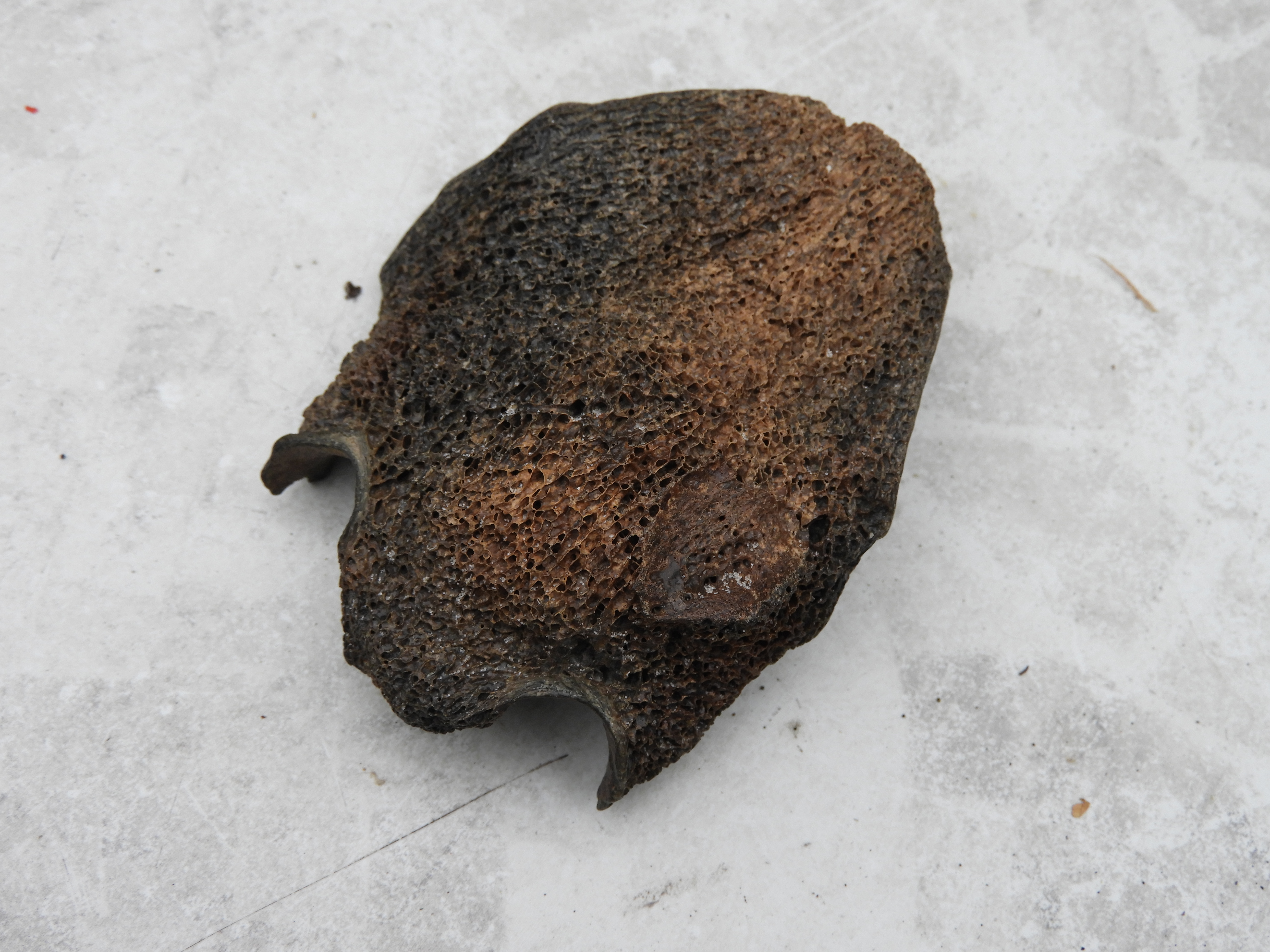 laatste ,kan een beetje van alles zijn,van schedel ,tot bv fragment midden hand been ,de twee rondingen die te zien zijn ,zie je bv bij de doorsnede van een midden voet ,of hand been van een hert achtige,, daar zie je twee schachten, dit waren oorspronkelijk twee aparte,