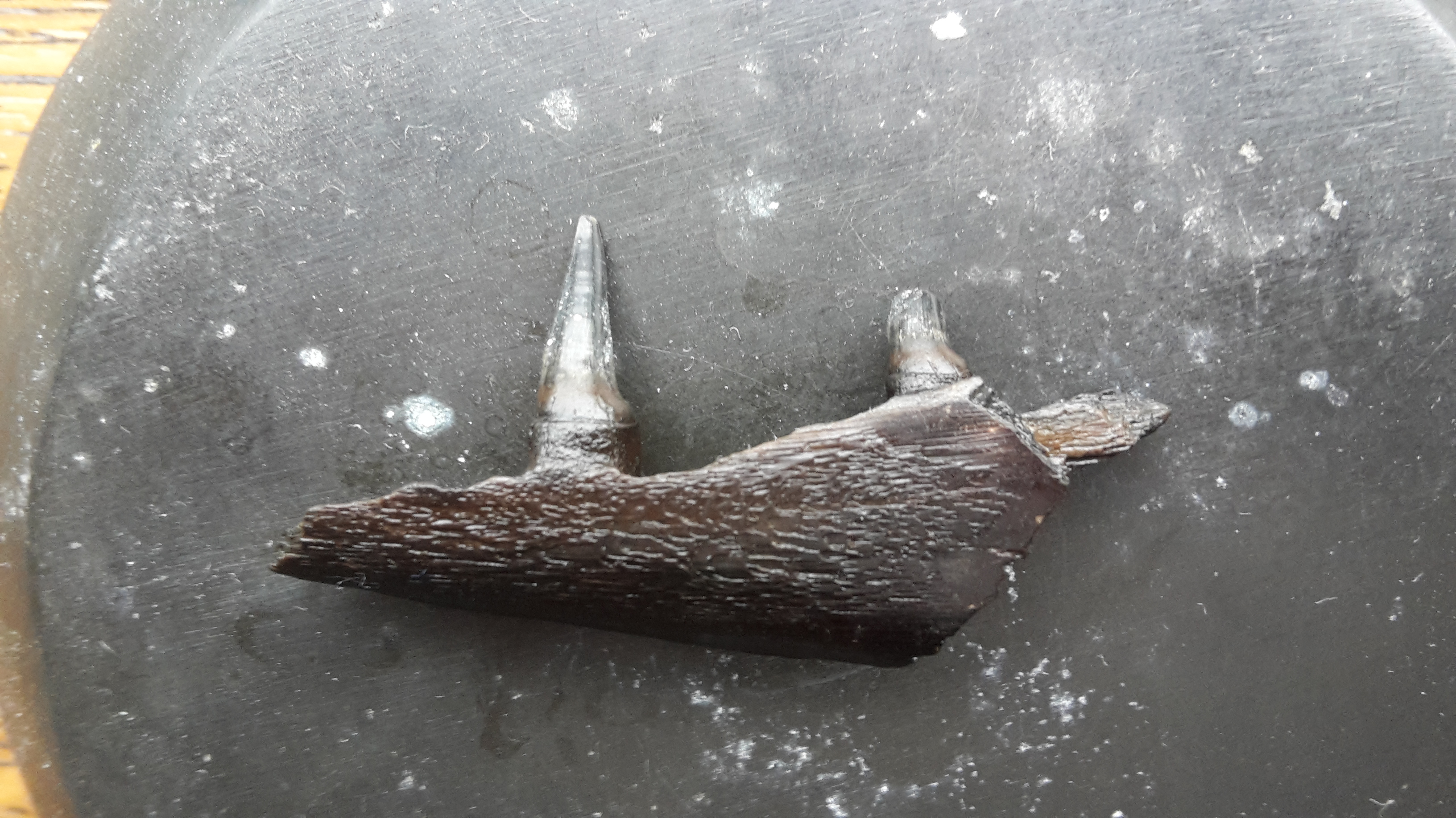 Gisteren vond ik op de ZM dit 4,5 cm lange onderkaakje van een Snoek met 1 prachtige complete vlijmscherpe tand. Snoeken doen het volgens mij niet zo goed in zout water dus ik neem aan dat deze rondzwom in het rivierenstelsel voordat het gebied een zee met zoutwater werd. Ik ben er in ieder geval blij mee.