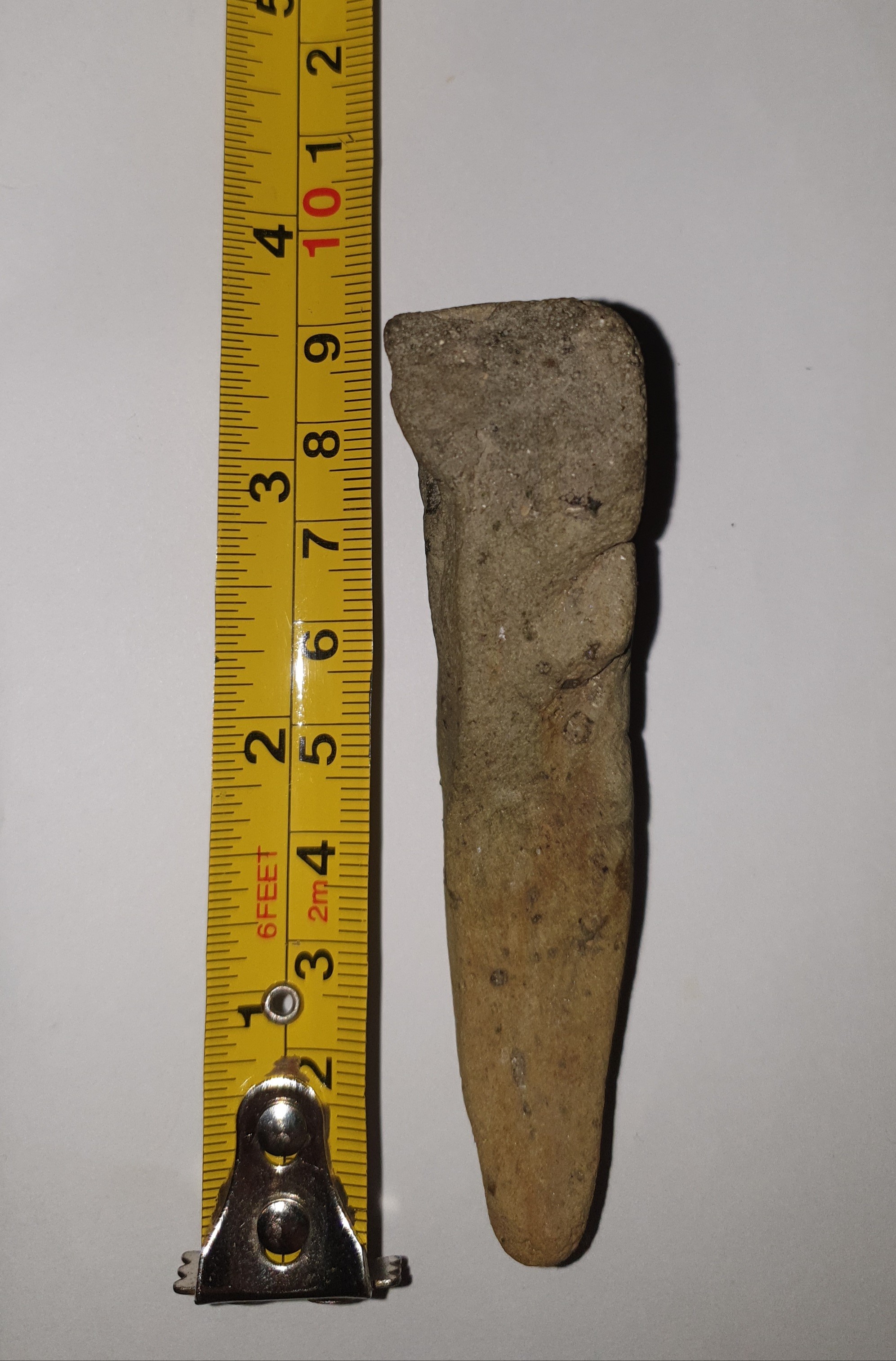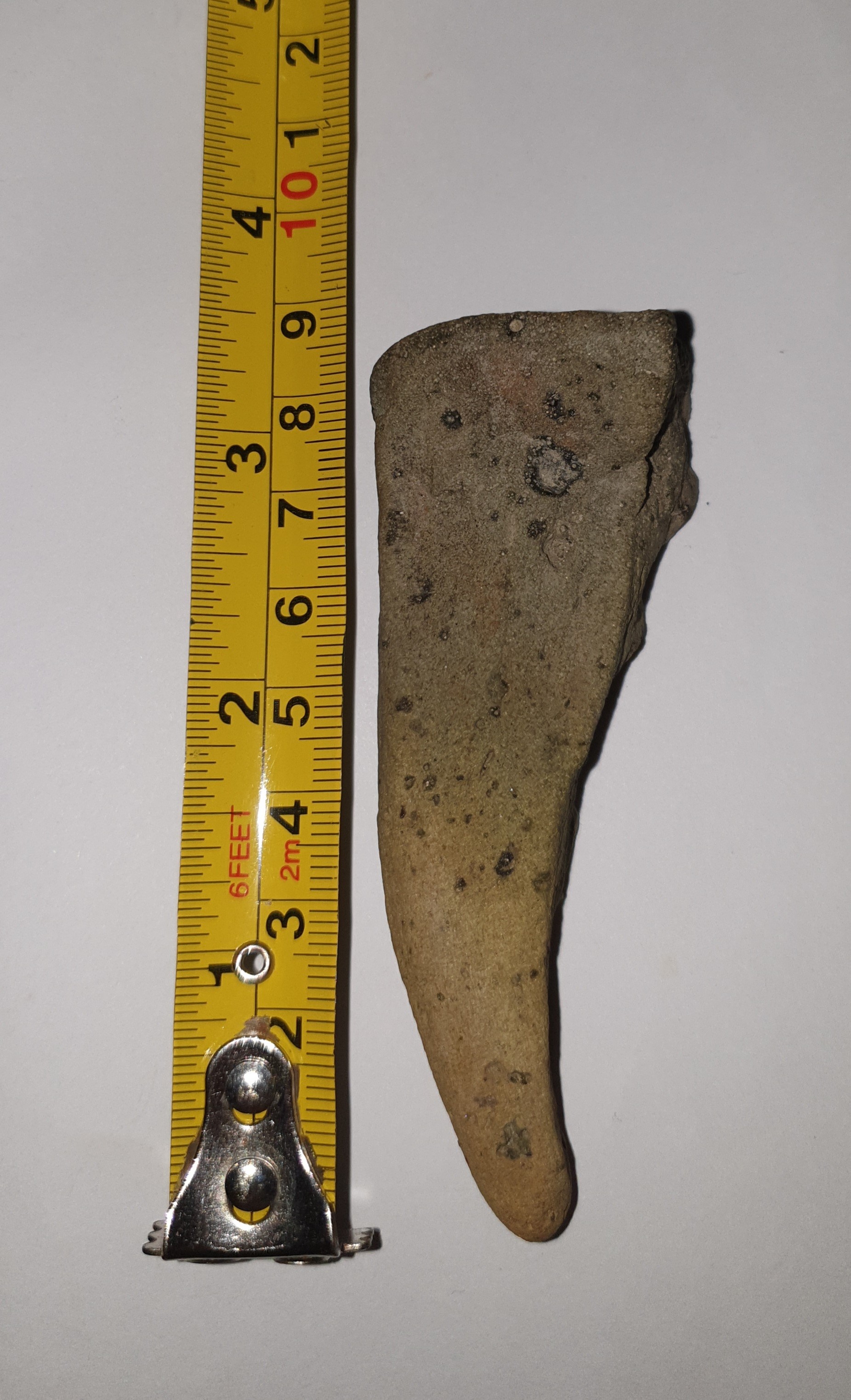 uiterlijk lijkt het een tand, maar ik denk dat het een steen is, mogelijk is het een versteende afdruk van een krabben schaar ,waar het oorspronkelijke materiaal verdwijnt ,( vergaat) blijft een holte over die met sediment,en mineralen opgevuld wordt ,zoals bv ook graaf gangen van kreeften .