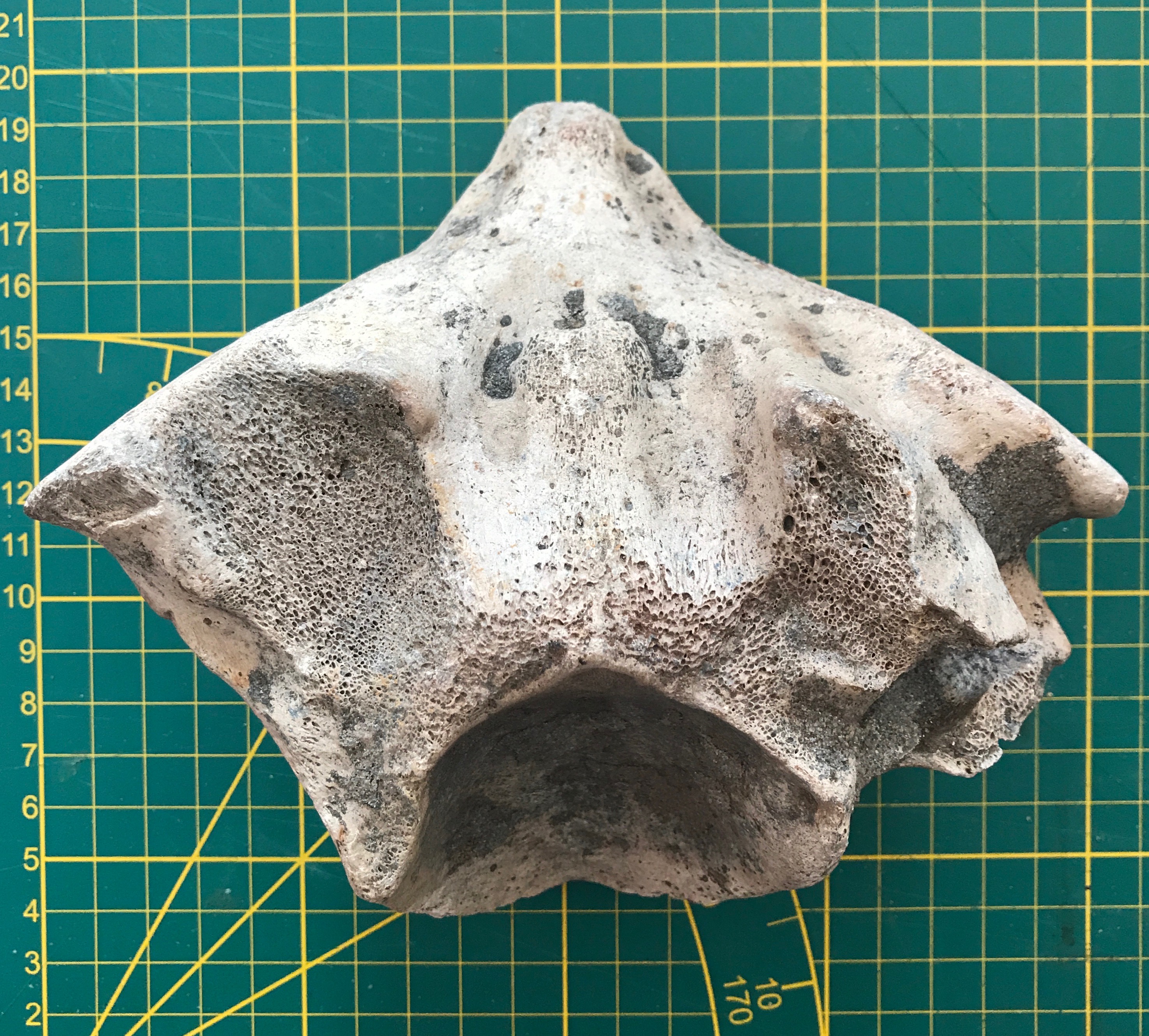 20 cm breed. Ik denk een draaier (tweede halswervel) van een neushoorn.