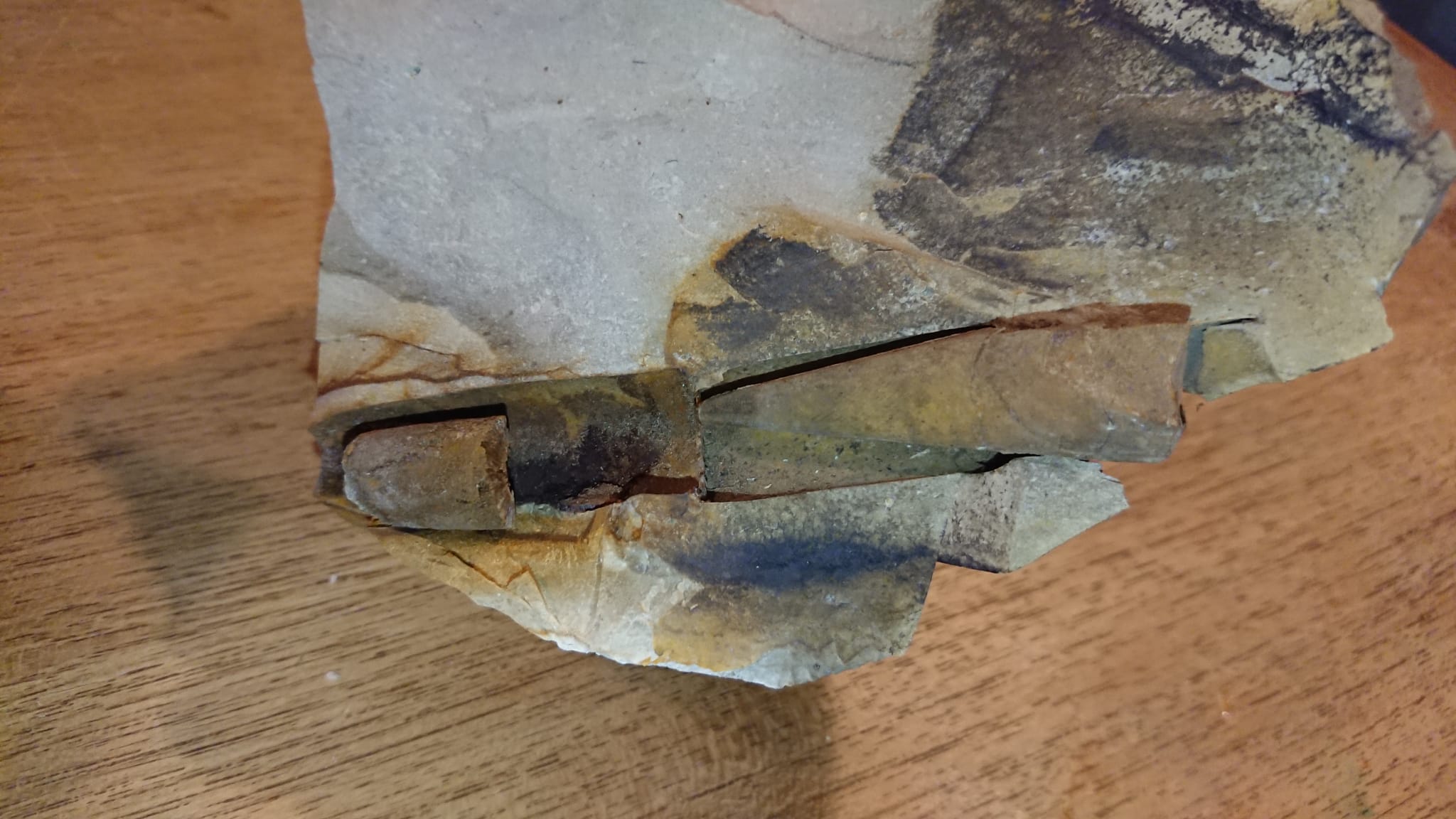 Ik vond vandaag met mijn zoontje een 'ongewone vorm' in een stapel vijverstenen. Het lijkt een stukje staart in een rond kanaal door een stuk steen. In het kanaal zat ook een 'schotje' en iets wat lijkt op een stukje bijna fossiel hout.