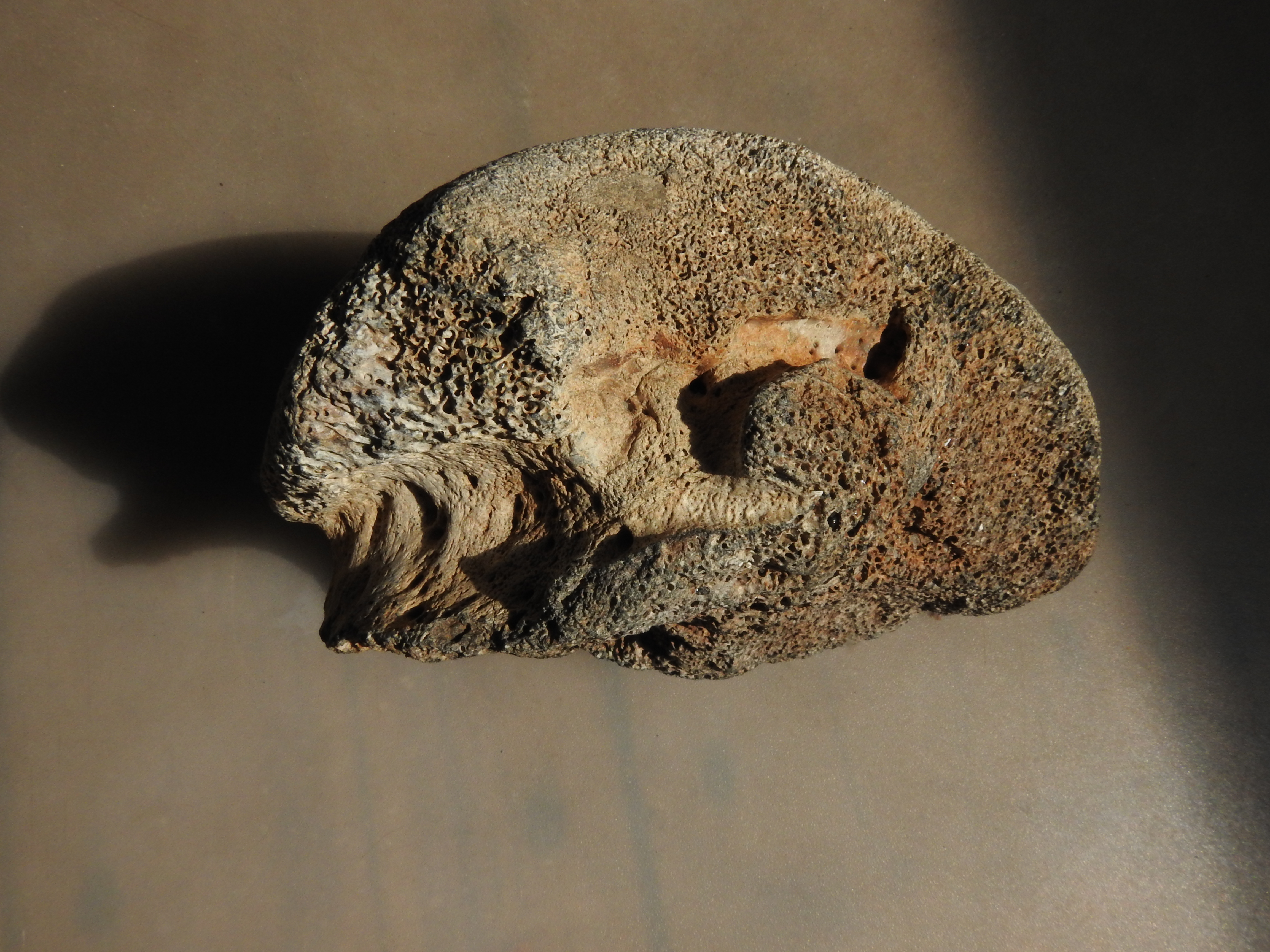 Zelf denk ik dat het misschien een deel van een opperarmbeen van een kleinere mammoetsoort kan zijn vanwege het formaat en de bolle/ronde vorm, maar ik ben hier absoluut niet zeker van.
