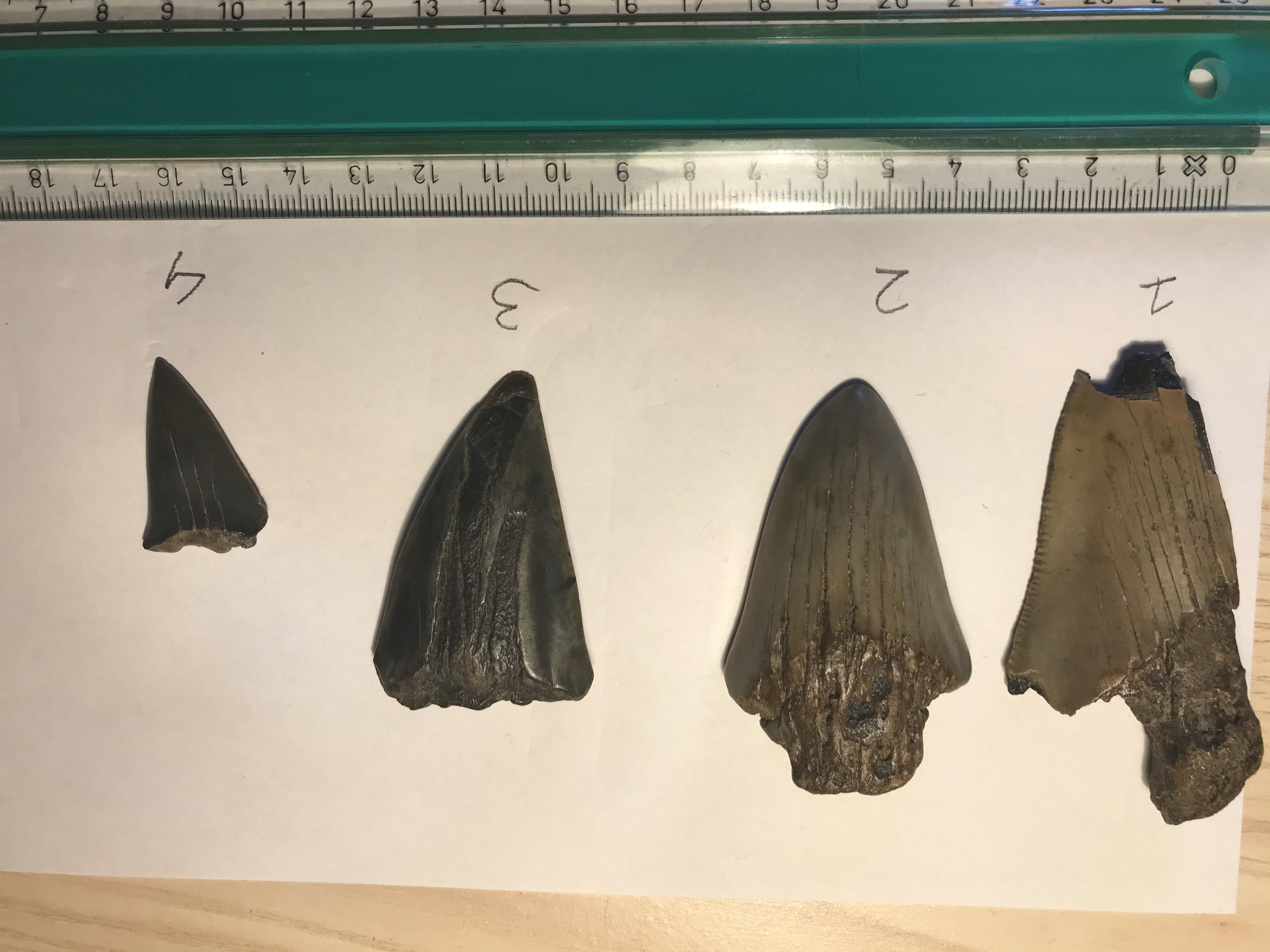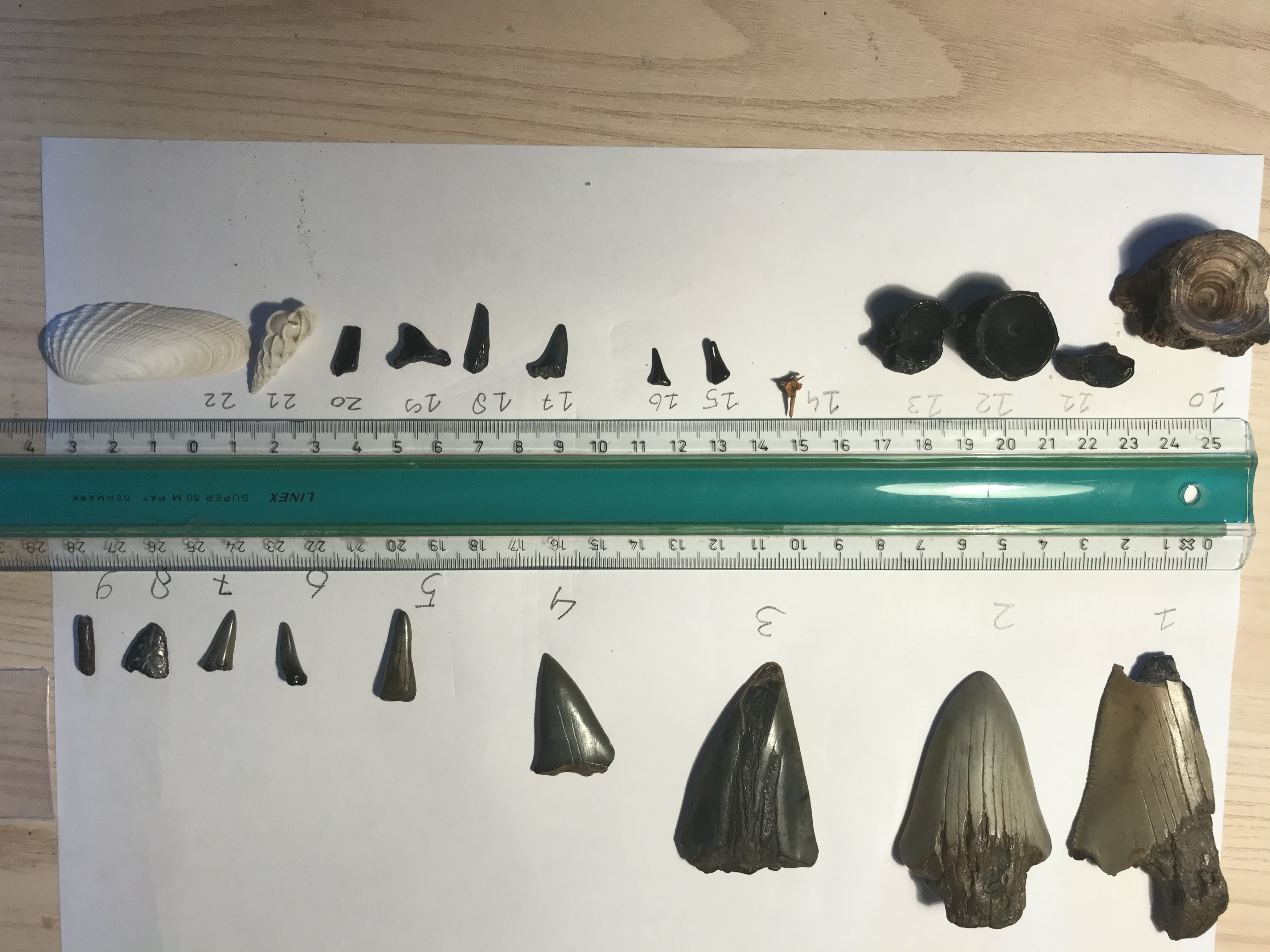 De grote tanden zijn Inderdaad c. Hastalis en o. Megalodon, de kleinere tanden zijn te afgesleten om nog verdere determinatie te geven, zijn in ieder geval van lamniforme haaien.