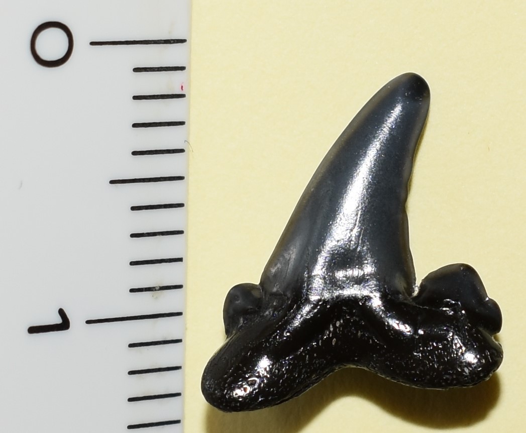 Ik ging er vanuit dat het een sterk gerolde tand was, waardoor de fijne karteling volledig is afgesleten en enkel wat restjes overbleven aan de distale snijrand. Maar jullie tip, Striatolamia macrota en vooral UL5 of LL6 leunt inderdaad heel dicht aan bij deze tand. Mijn zoektocht kan stoppen voor deze tand. Bedankt!
