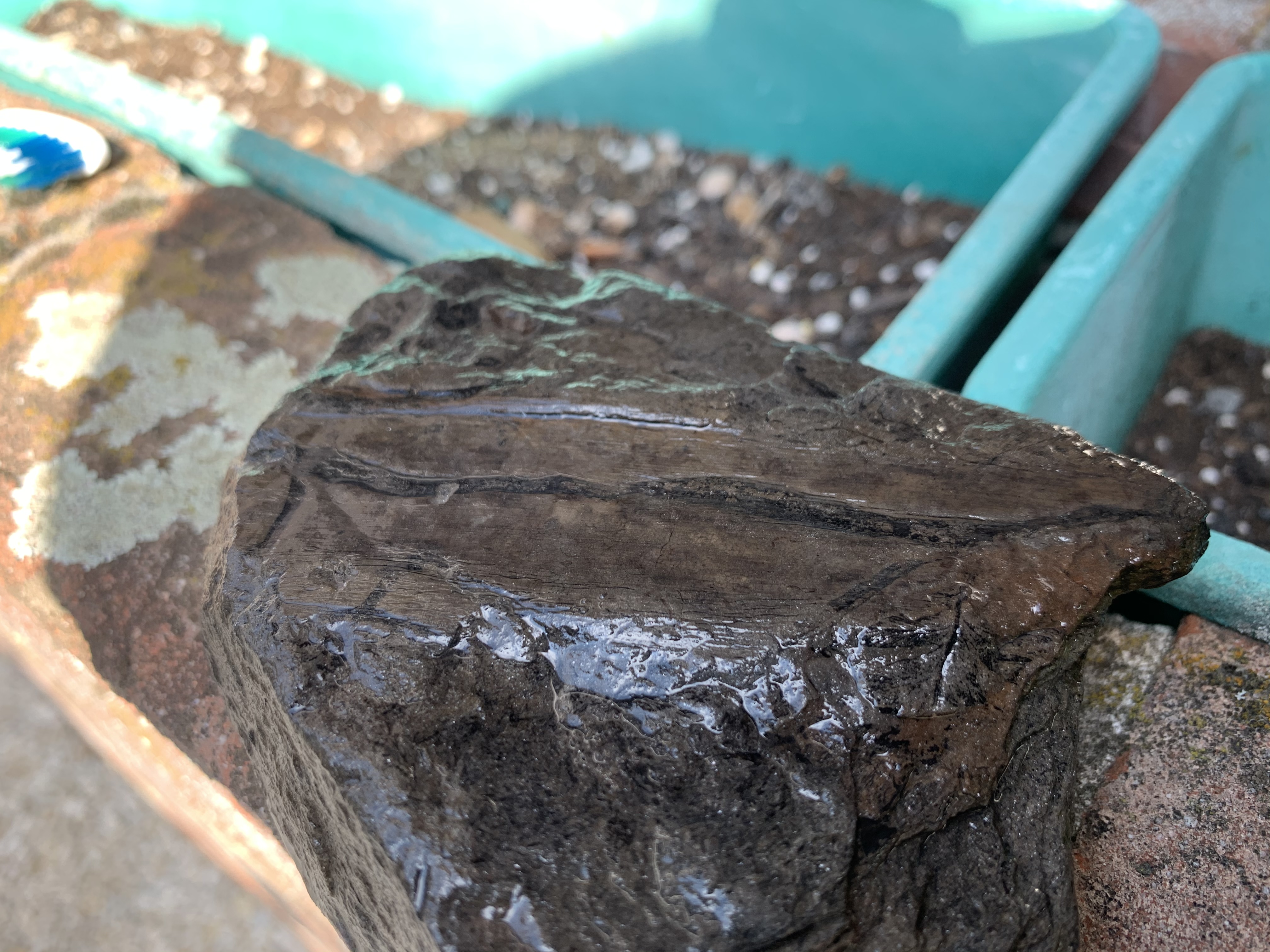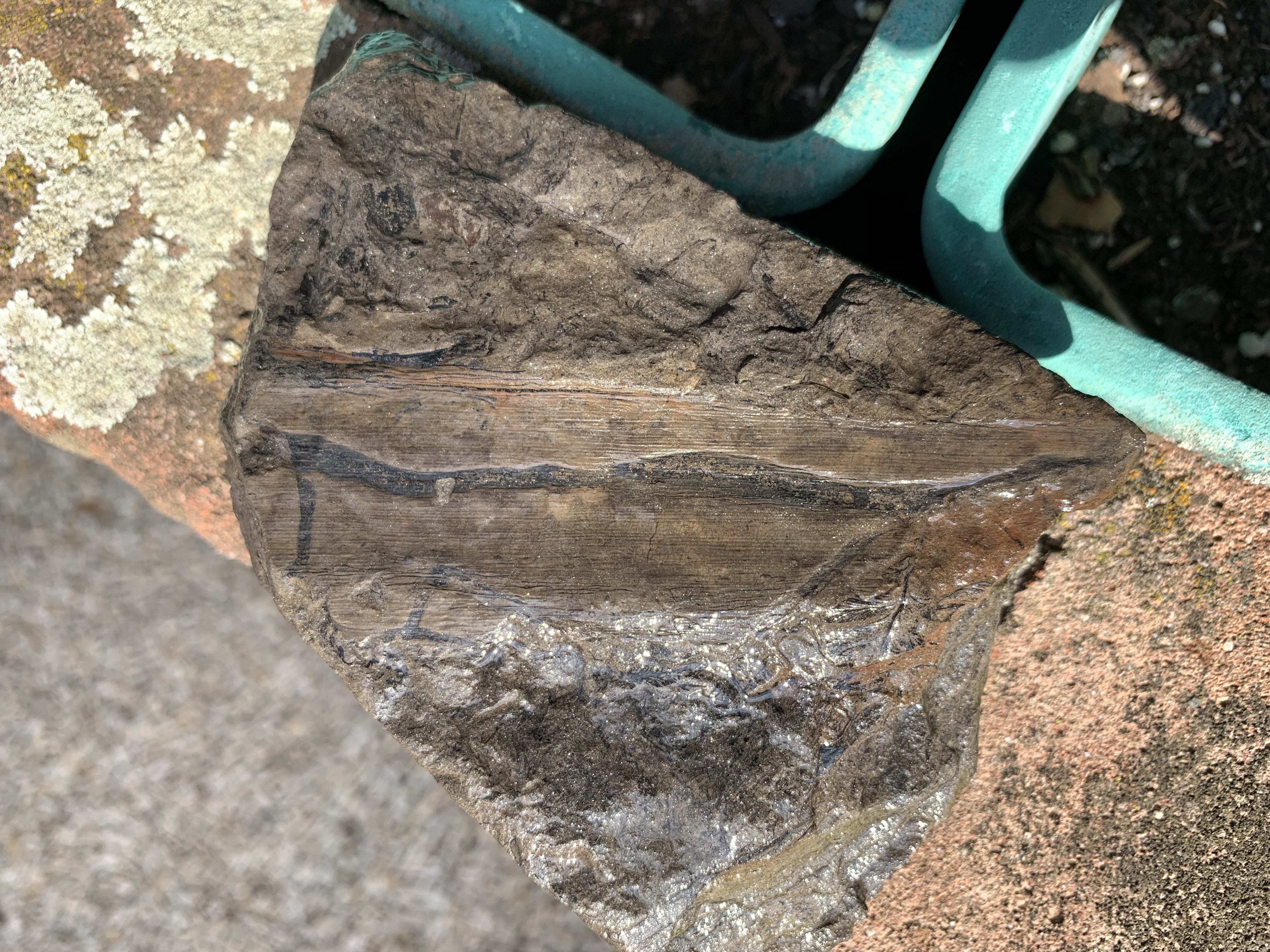 Enkele ideeën. Bij die grote gelijnde vorm dacht ik aan een blad van Cordaïtes. Maar wat dat zwart in het midden is weet ik niet. Bij beter bekijken loopt de structuur precies ook wat verder nog op sommige stukken. Kan misschien ook een stuk versteend hout zijn.