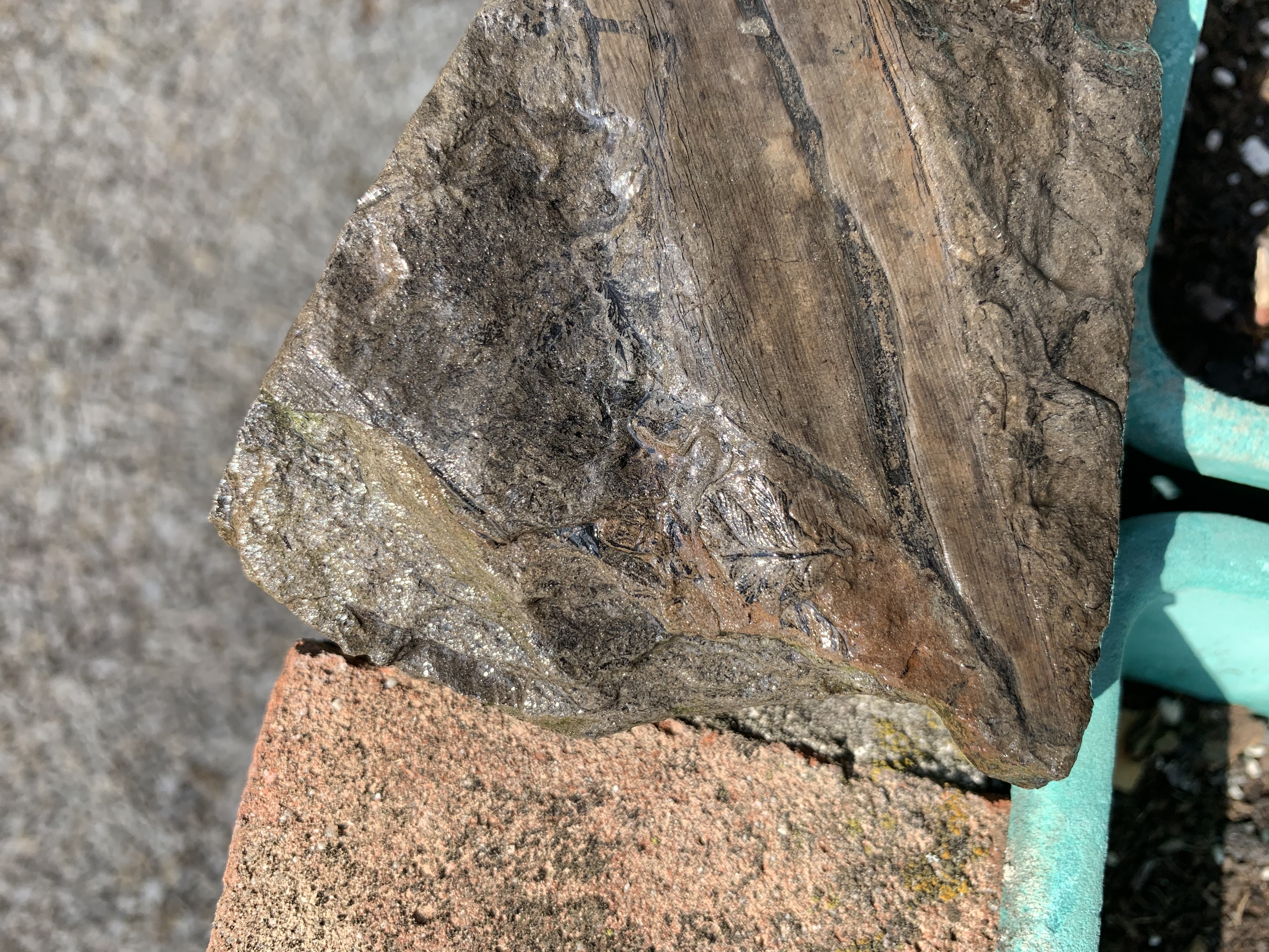 Interessant stuk, afkomstig van voor een mij onbekende locatie. Ben het in grote lijnen met Felicia eens. De langwerpige structuur met parallelle groeven is mogelijk een Cordaites-blad, hoewel ik persoonlijk meer neig naar een stamdeel van het een of ander. De zwarte band zou dan scheurrand kunnen zijn, die bijvoorbeeld ontstaat wanneer je een holle stam plat drukt. Dergelijke structuren zie je normaal gesproken best vaak bij Calamites-achtigen, maar het stuk hier laat nergens een voor Calamites karakteristieke knooplijn zien. Vertoont het stuk enige driedimensionaliteit of is het volledig plat? Dit is lastig te zien op de foto's. Lastig om hier met voldoende zekerheid iets van te maken... Verder bevat het stuk, zoals Felicia al opmerkte, een vedervormig blad (zie uitvergroting hieronder). De aanhechting van de blaadjes is breed, zelfs confluent aan de basiscopische zijde, wat wijst op een Alethopteride of Mariopteride bladvorm. Verder staan de blaadjes onder een redelijke hoek op de rachis en zijn ze enigszins asymmetrisch om hun middennerf, wat mij sterk doet neigen dit een Mariopteride bladvorm te noemen. Helaas is het met dit soort fragmentjes vaak lastig om tot een meer precieze determinatie te komen.