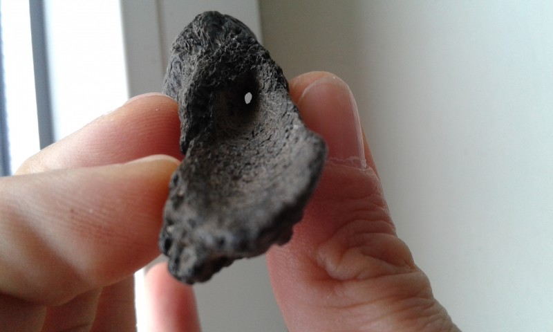 2. Bot van een vis? . Relatief zwaar, dikhuidig, hard en hol met een klein gaatje aan het onderste, dunnere uiteinde