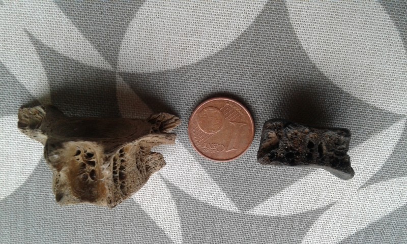 1. Wervel van vissen? Aan de linkerkant is een klein stukje van de lichtere, grotere wervel afgebroken.