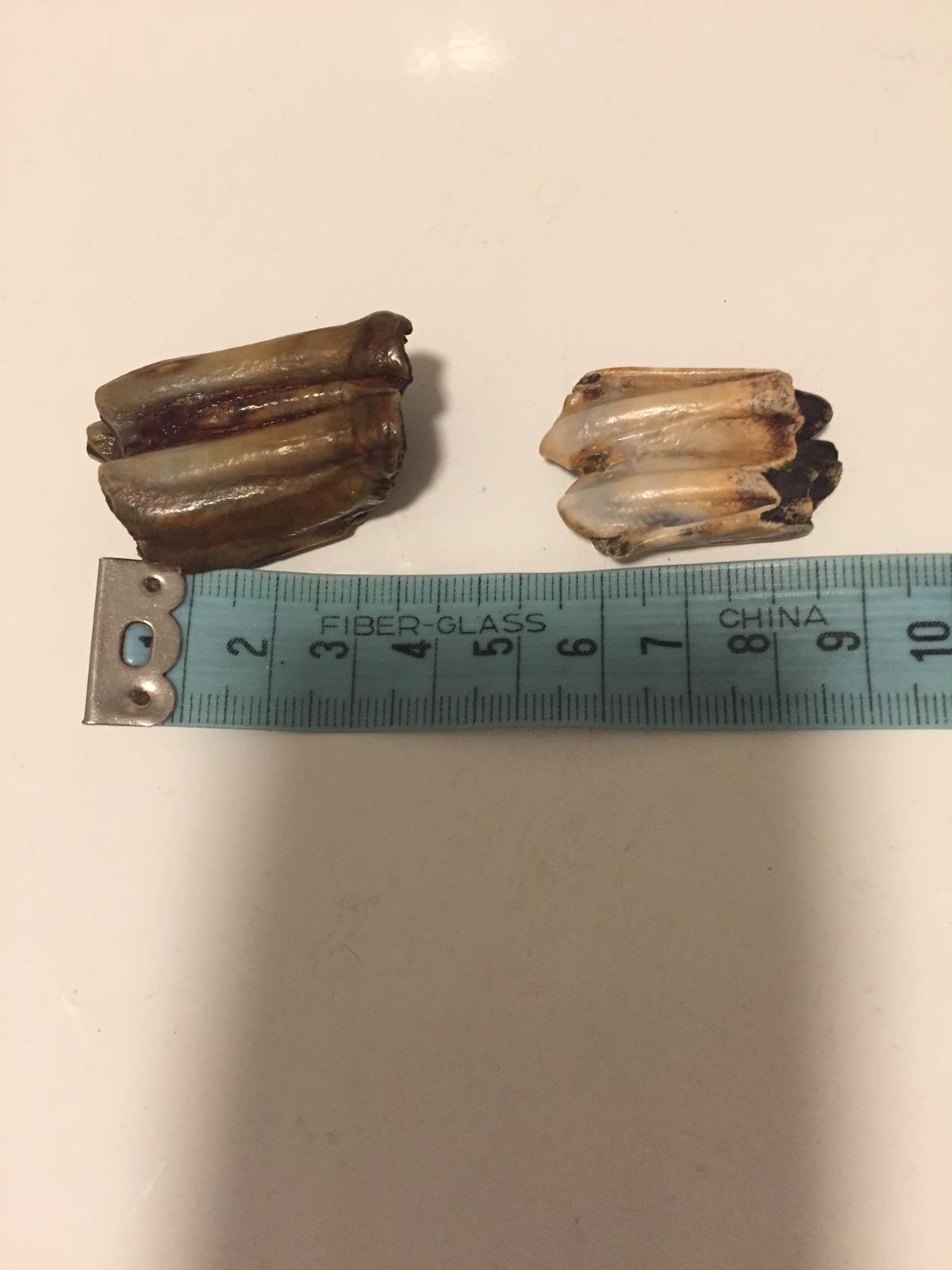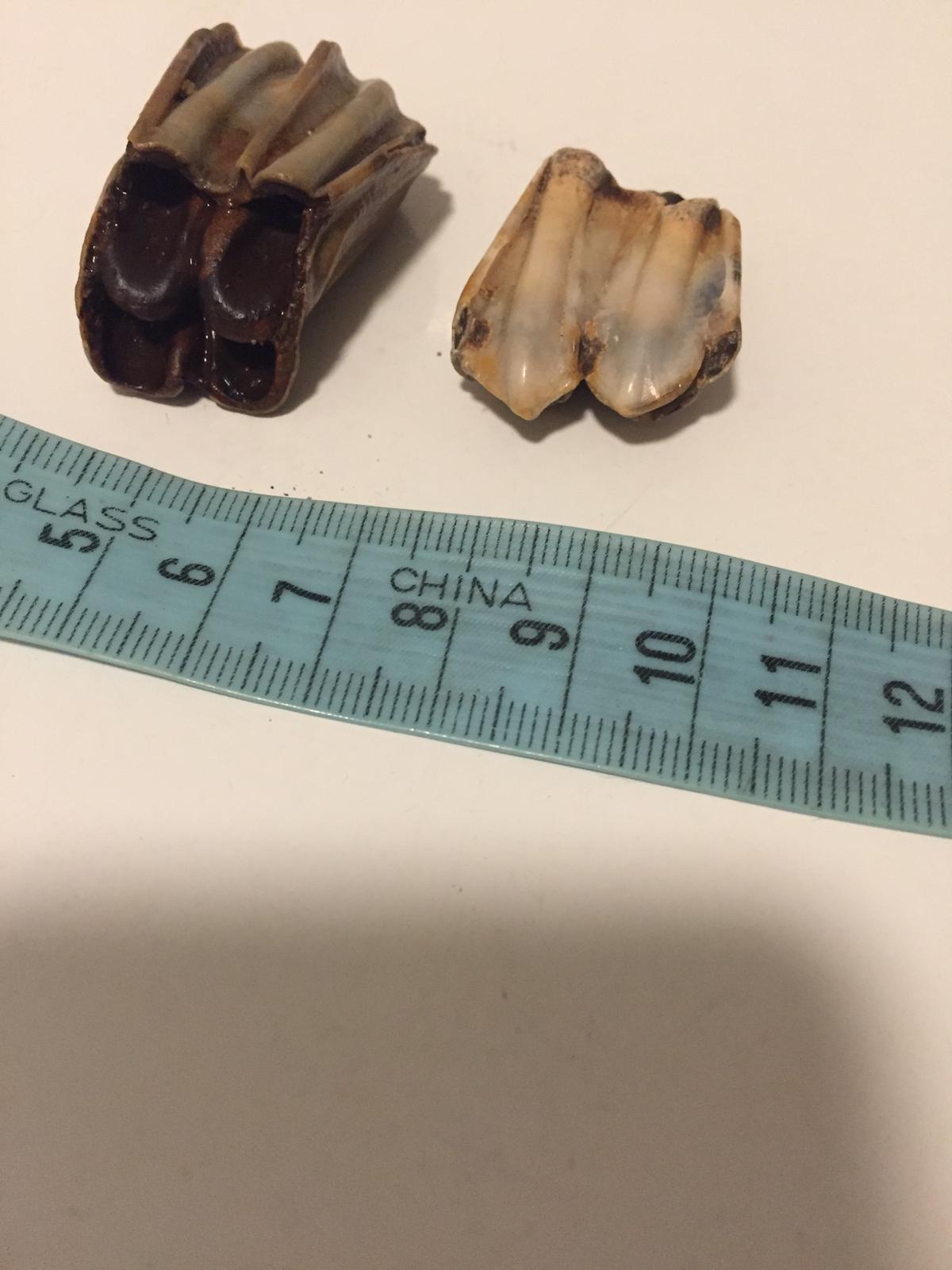 Deze 2 kiezen (?) heb ik gevonden op Waalstrandjes in de buurt van Nijmegen, afzonderlijk van elkaar met een paar jaar ertussen. De laatste dit weekend. En nu word ik toch wel nieuwsgierig. Wie weet wat dit is? Ik heb wat gegoogled en het zijn misschien kiezen van een wisent?