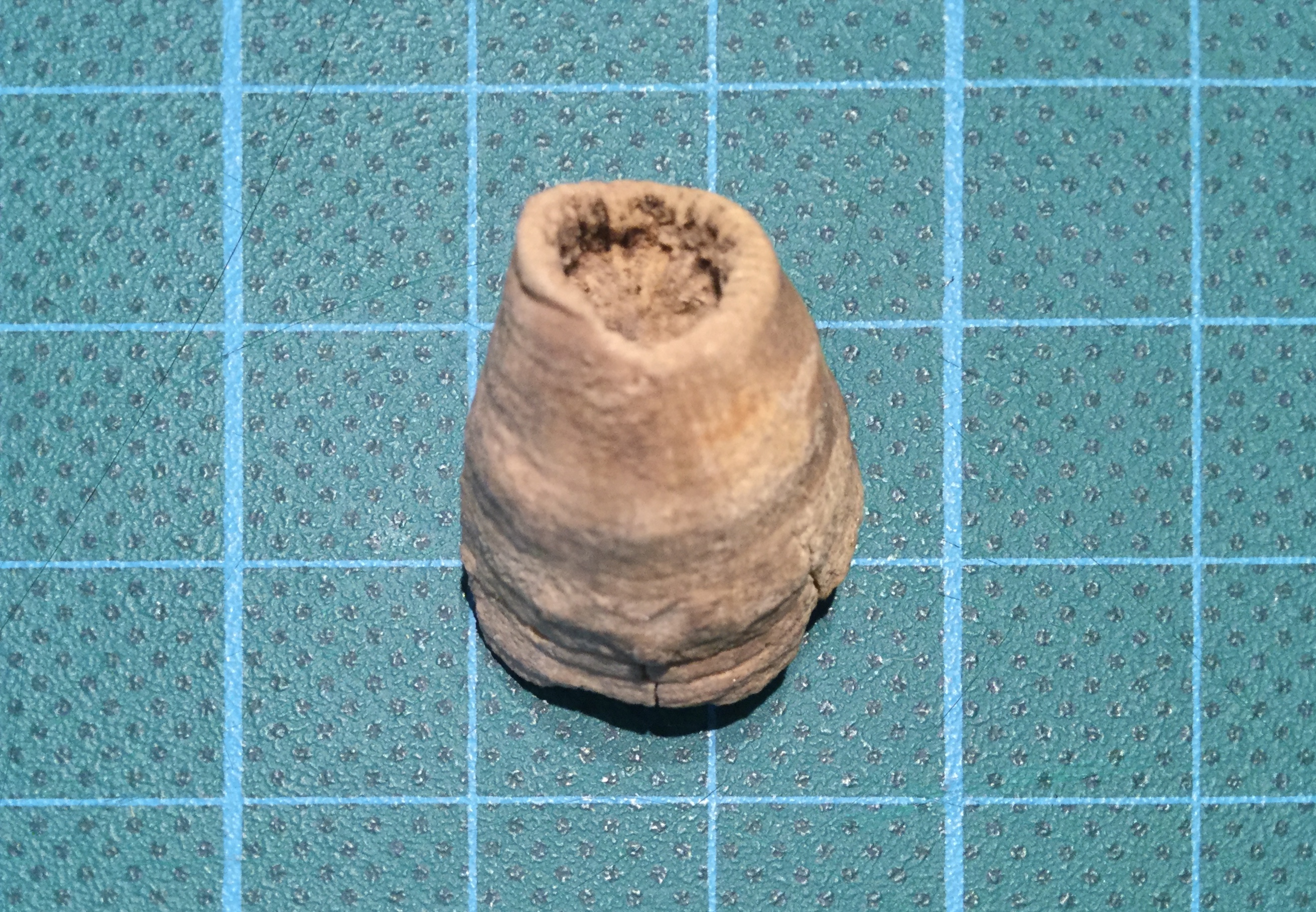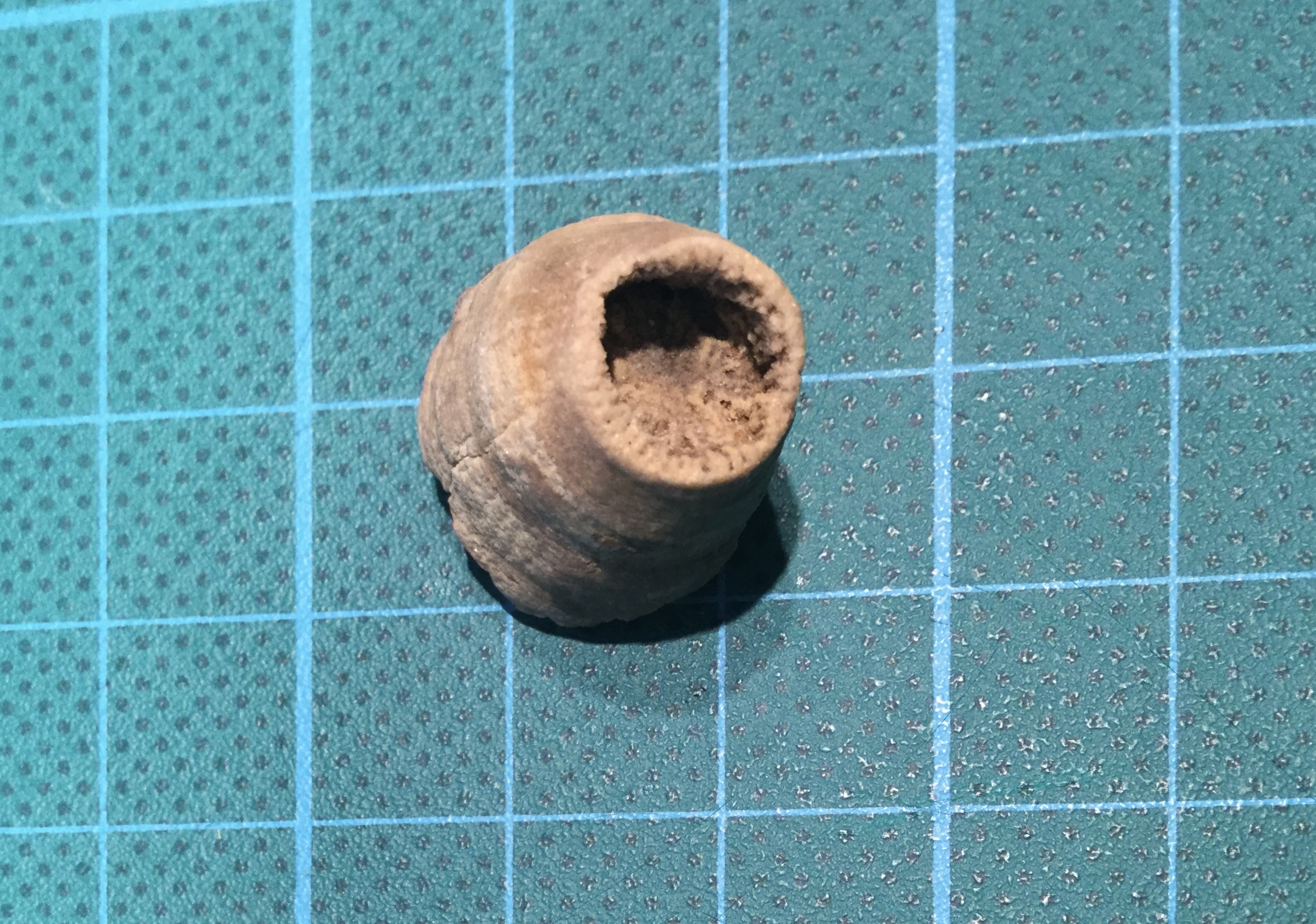 Foto 3:detail kleintje: dat lijkt de basis van 2 kokertjes met een opening centraal. Er zijn ook streepjes te zien in de richting van de kern
