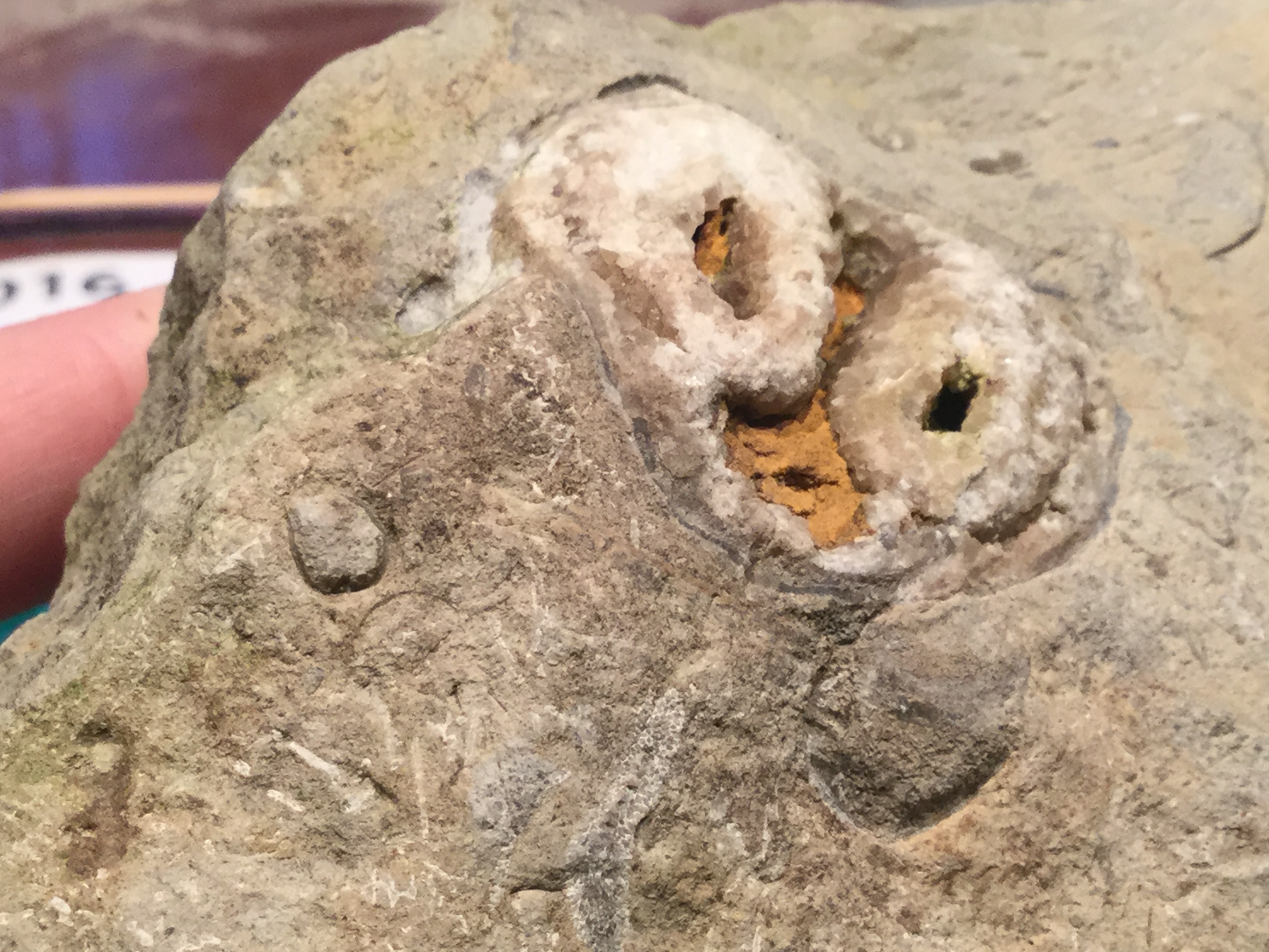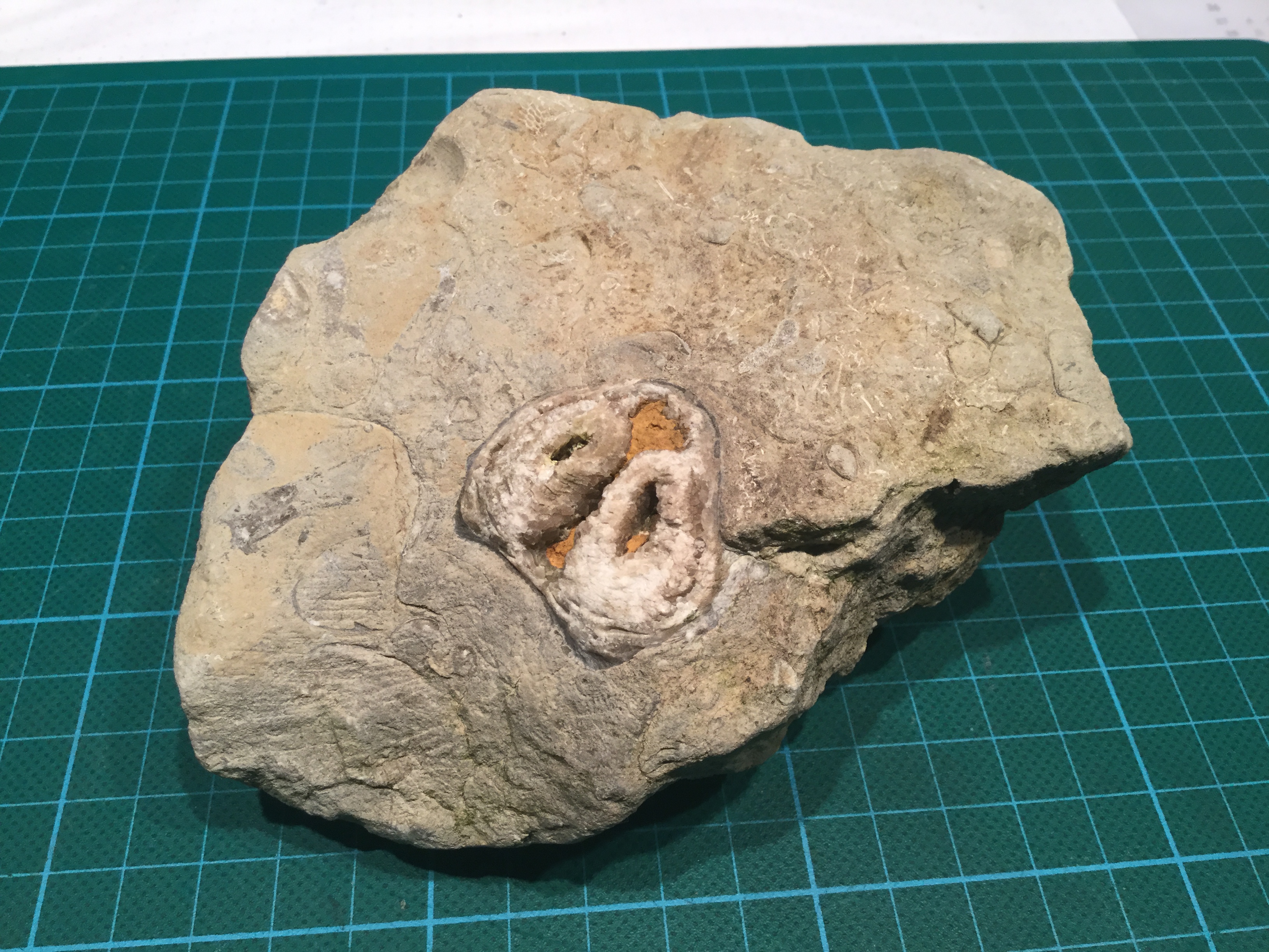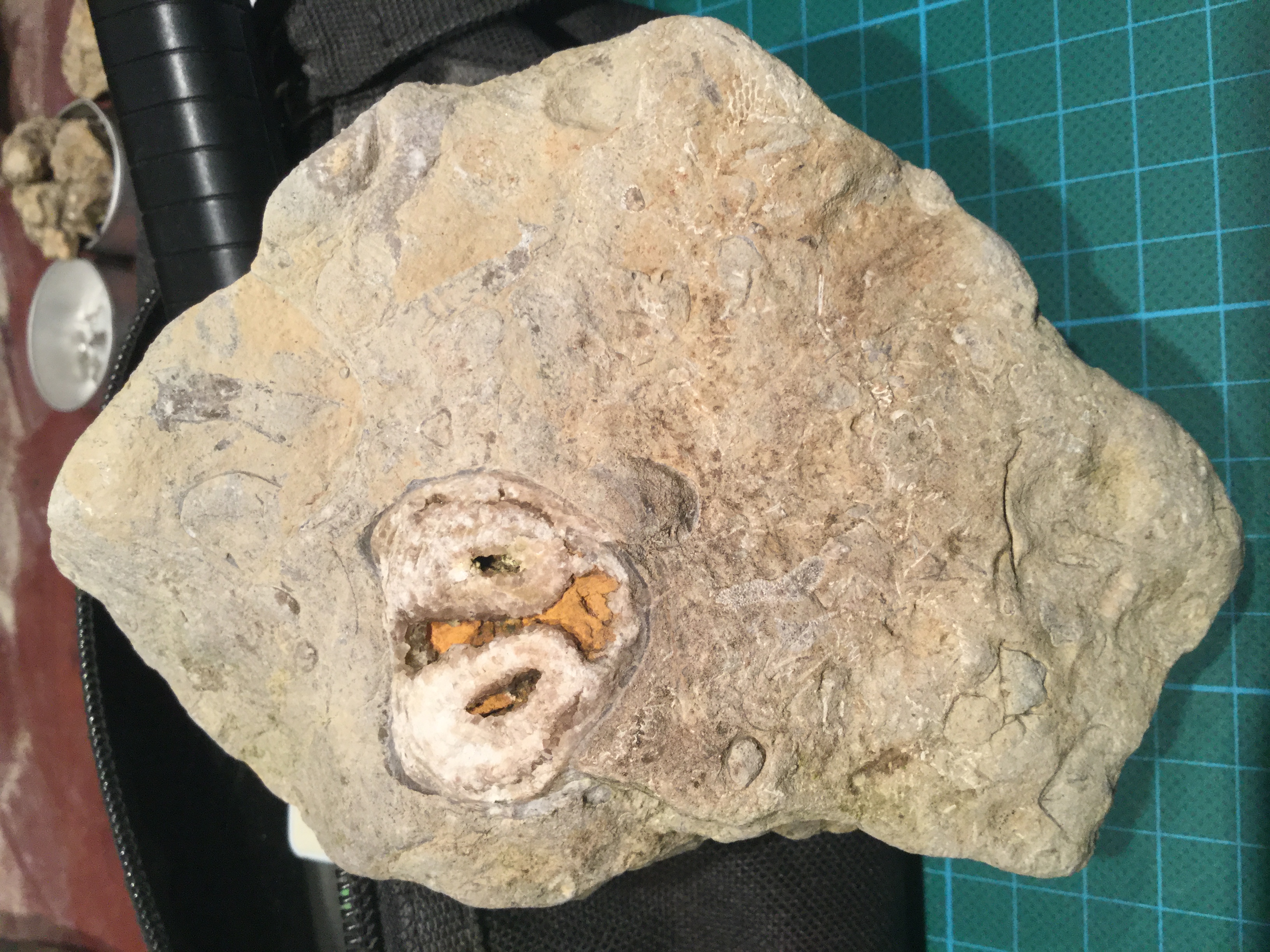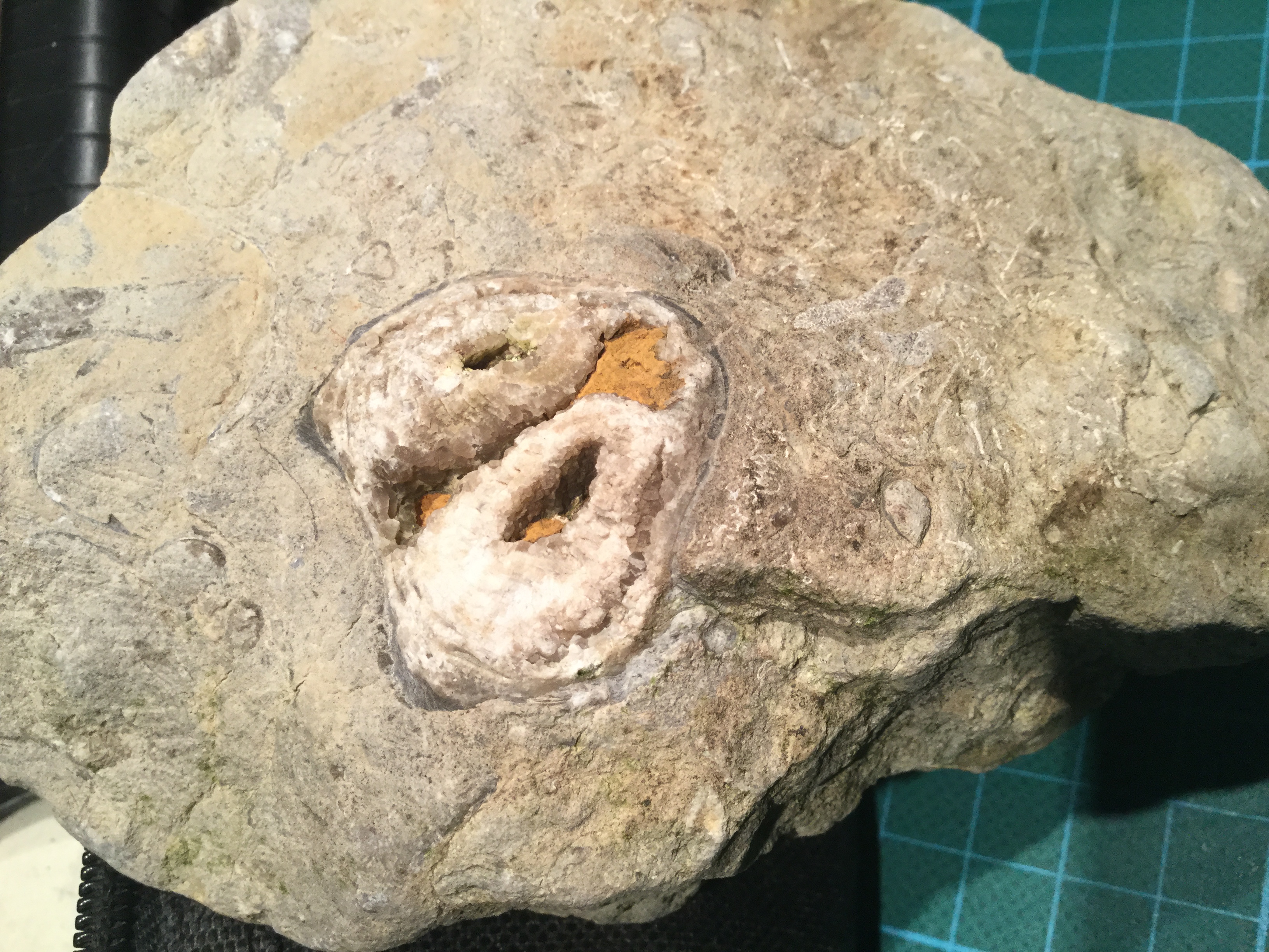 Ik ben het met Cora eens. Ik vermoed ook een brachiopode. Die 2 gespiegelde ovale vormen zijn waarschijnlijk gerekristalliseerde lophophoren: https://images.app.goo.gl/u8Fotxa9qr7kzUEw6
