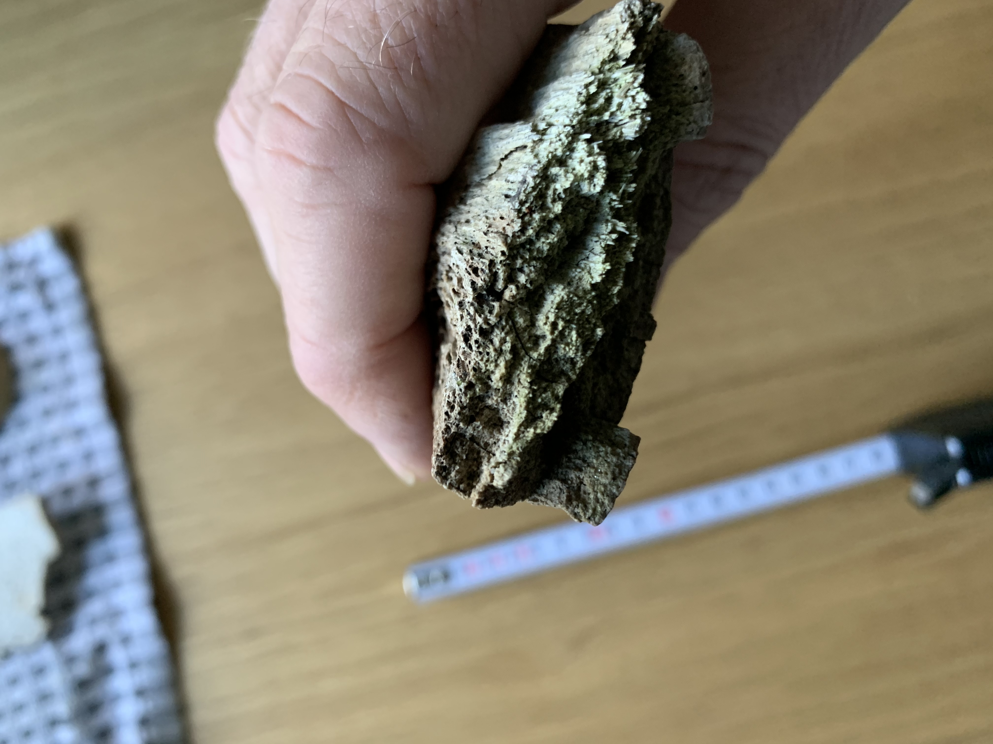 Een fossiel fragment gevonden bij gestorte zandhopen bij Rotterdam. Is dit een stuk gewei of een stuk bot? Iemand een idee?