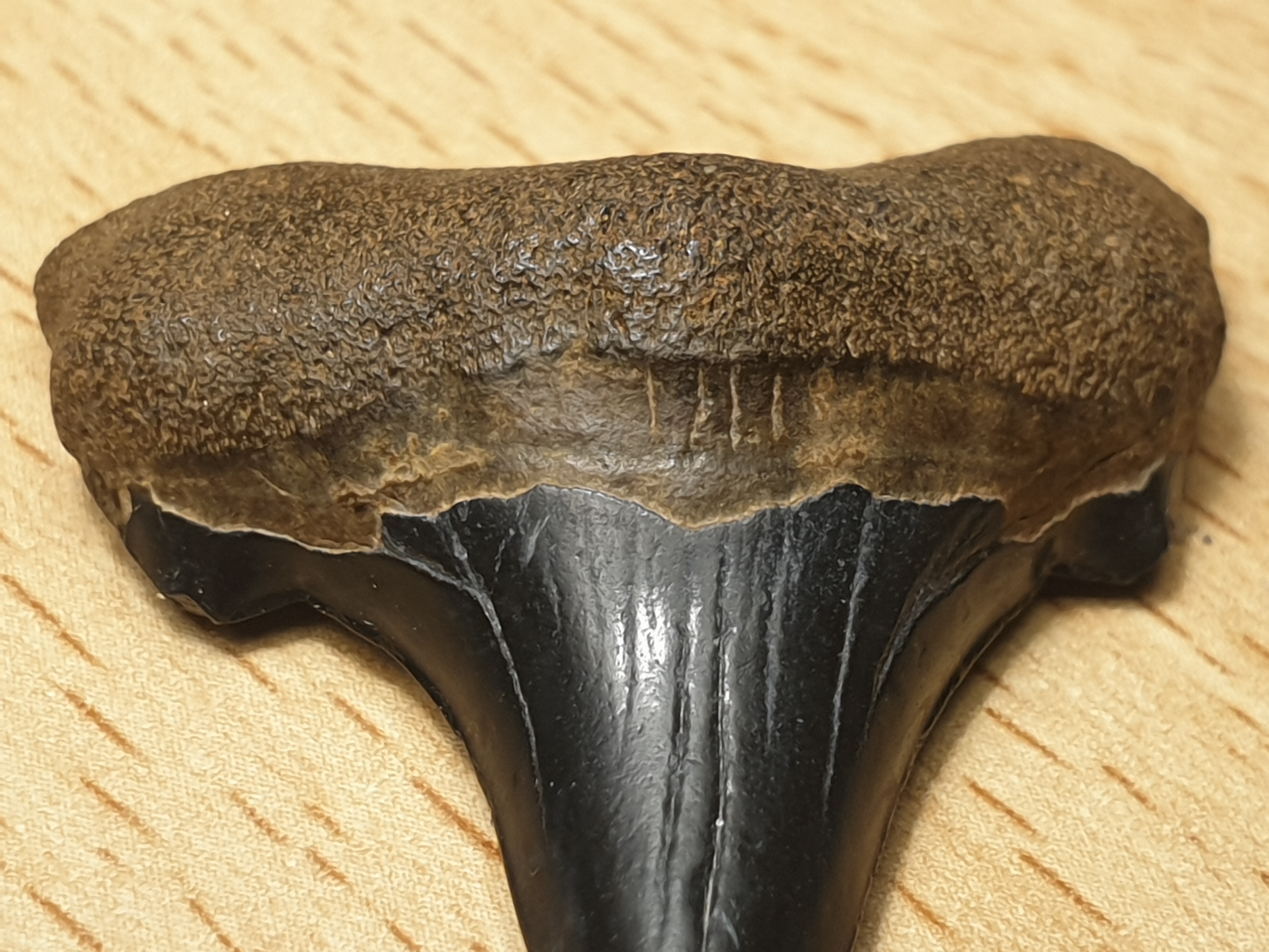 Ik weet dat kleur niet veel zegt, ik blijf de bruine kleur van de wortel apart vinden voor hier. Ik heb dat alleen gezien bij 2 tanden van een witte haai die ik hier heb gevonden en 1 andere haaientand (Isurus oxyrinchus).