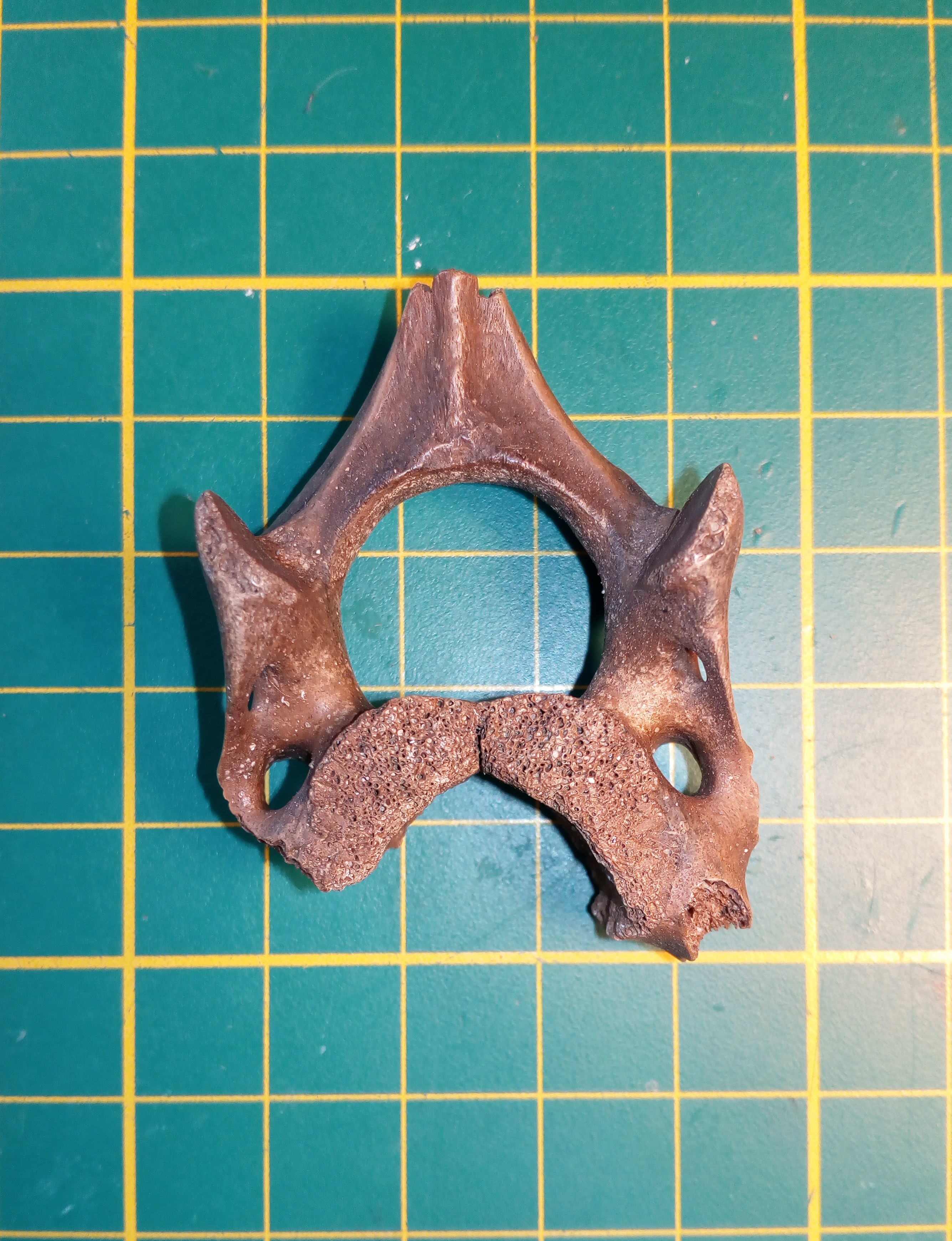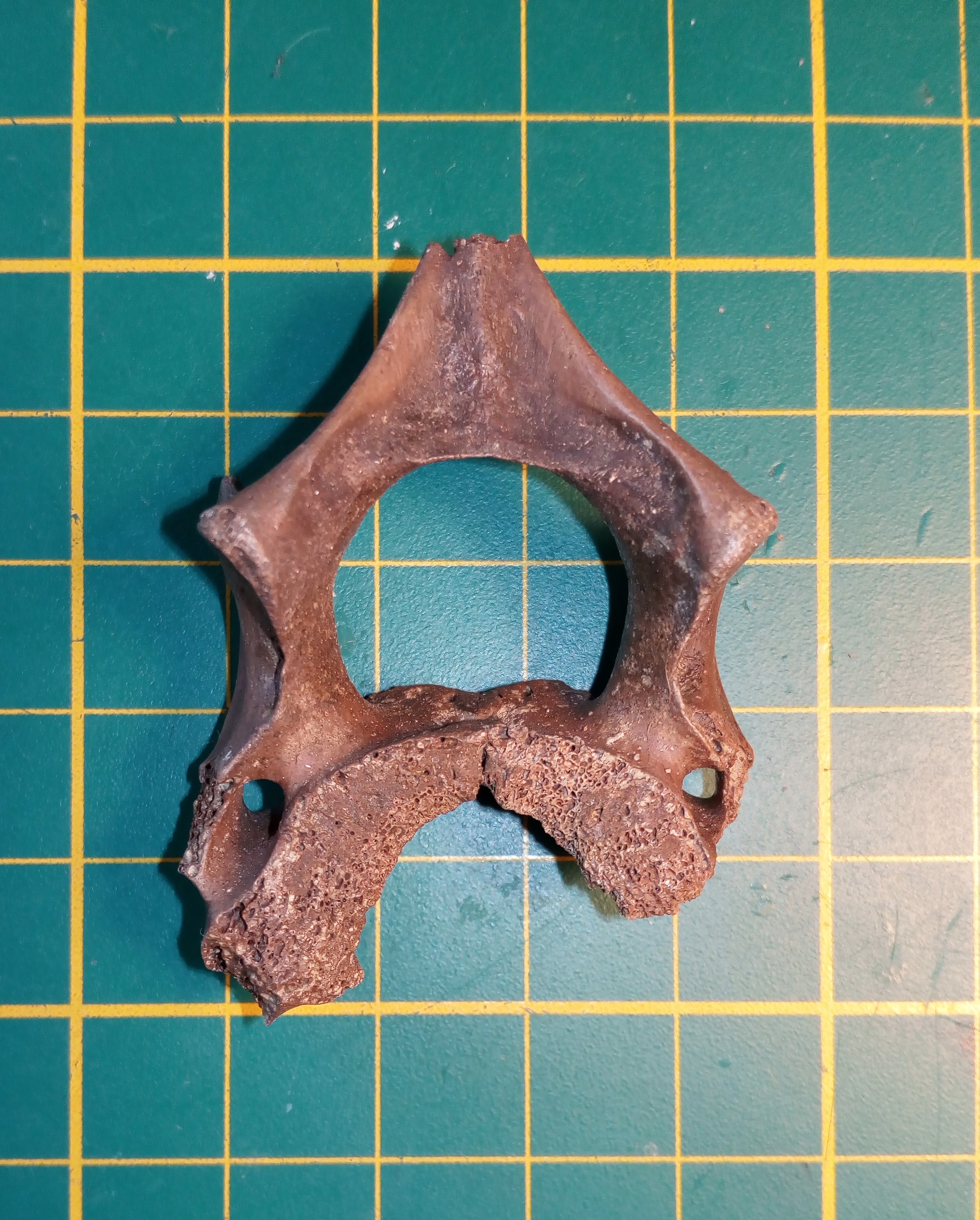 Het is een nekwervel aan de twee “gaatjes” te zien aan de zijkanten, en dan van een wat groter landzoogdier of misschien zeehond. Het is maar een fragment maar misschien dat, al je het echt wil weten, het met wat vergelijken aan de hand van de vorm en grote van de wervelboog te determineren valt. Ik weet het in elk geval niet.