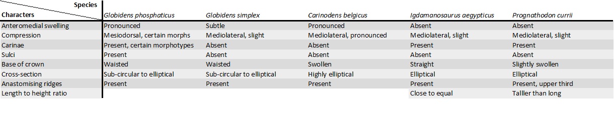 Bardet et al. (2016) "Durophagous Mosasauridae (Squamata) from the Upper Cretaceous phosphates of Morocco, with description of a new species of Globidens" geeft trouwens ook een nuttige korte omschrijving van de tanden van Prognathodon currii.