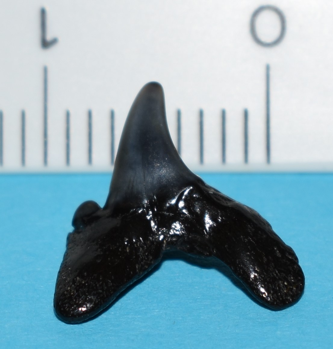 Onderstaand tandje werd gevonden in Knokke. Oorspronkelijk dacht ik dat de wortel heel er geschaafd was. Maar bij nader onderzoek raak ik er steeds meer van overtuigd dat de wortel niet beschadigd is. Het tandje blijft rechtop staan. Op basis van de afgeronde bijspits denk ik aan Striatolamia macrota maar de wortel doet me twijfelen. Of gaat het hier toch om een beschadigde wortel? Wat denken jullie?