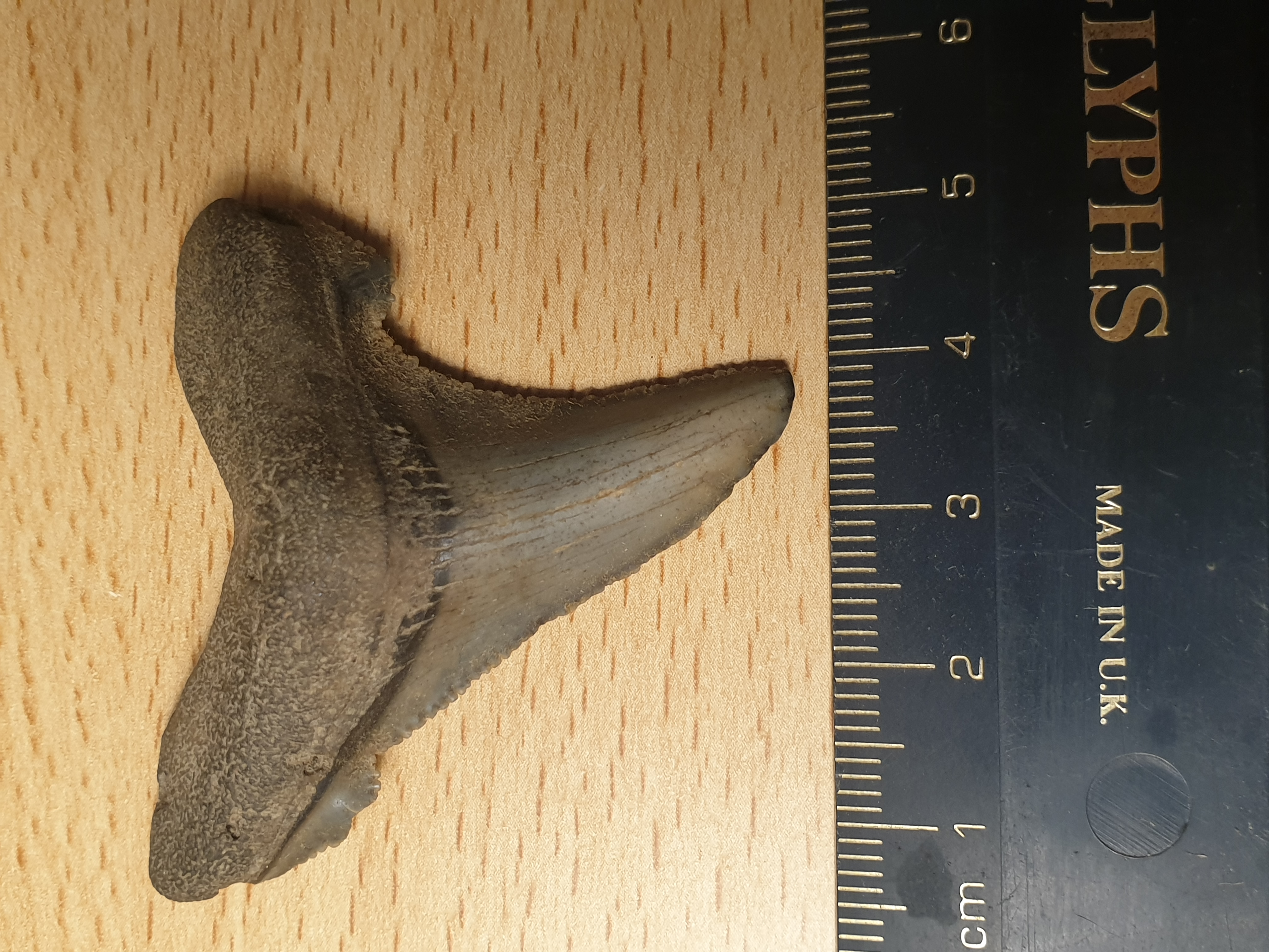 Nog een haaientand, in 1990 gevonden te Breskens.