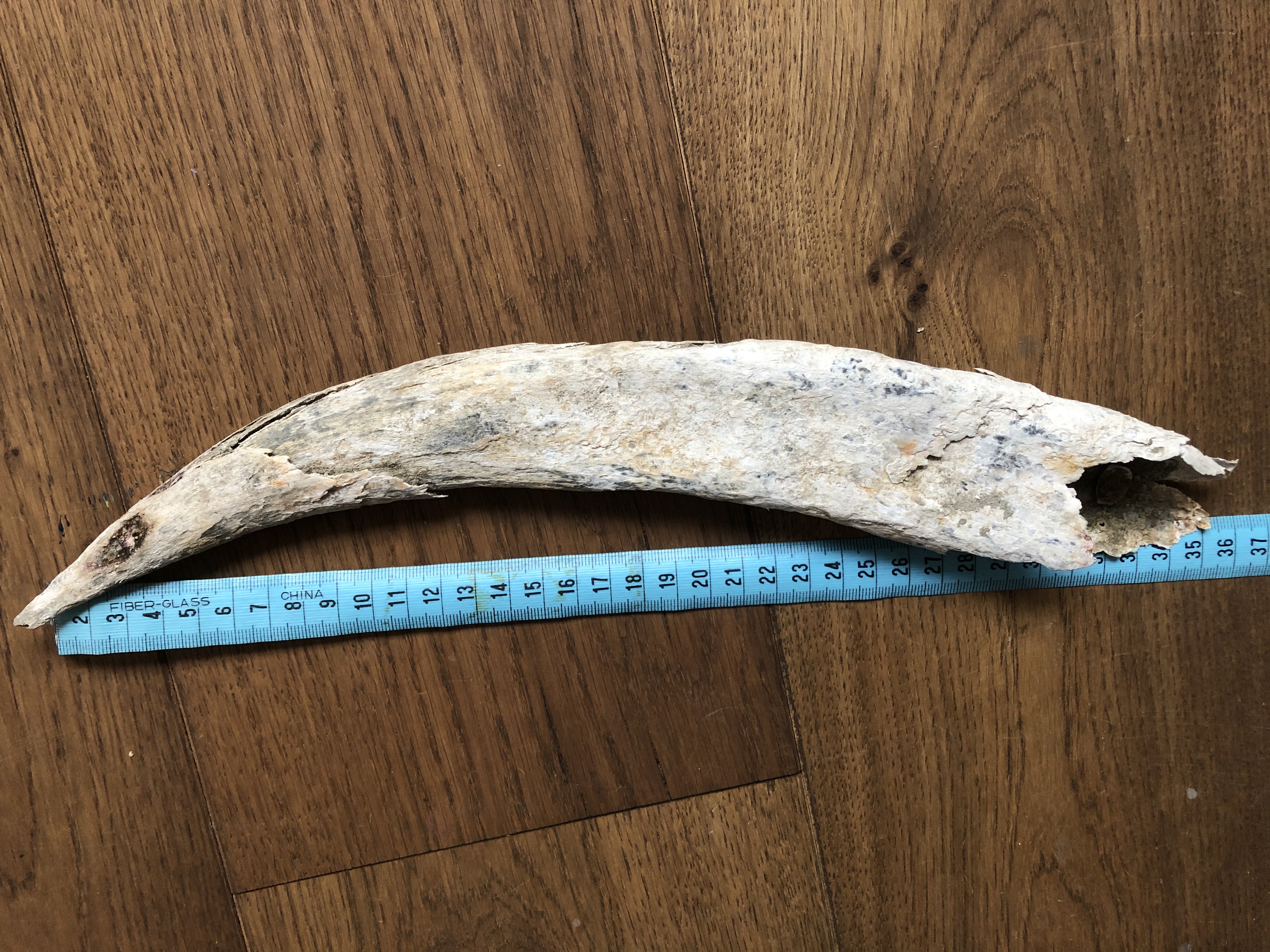 Dit grote botstuk werd onlangs gevonden op de Balg, Schiermonnikoog. Hoornpit van????????? Of iets heel anders???